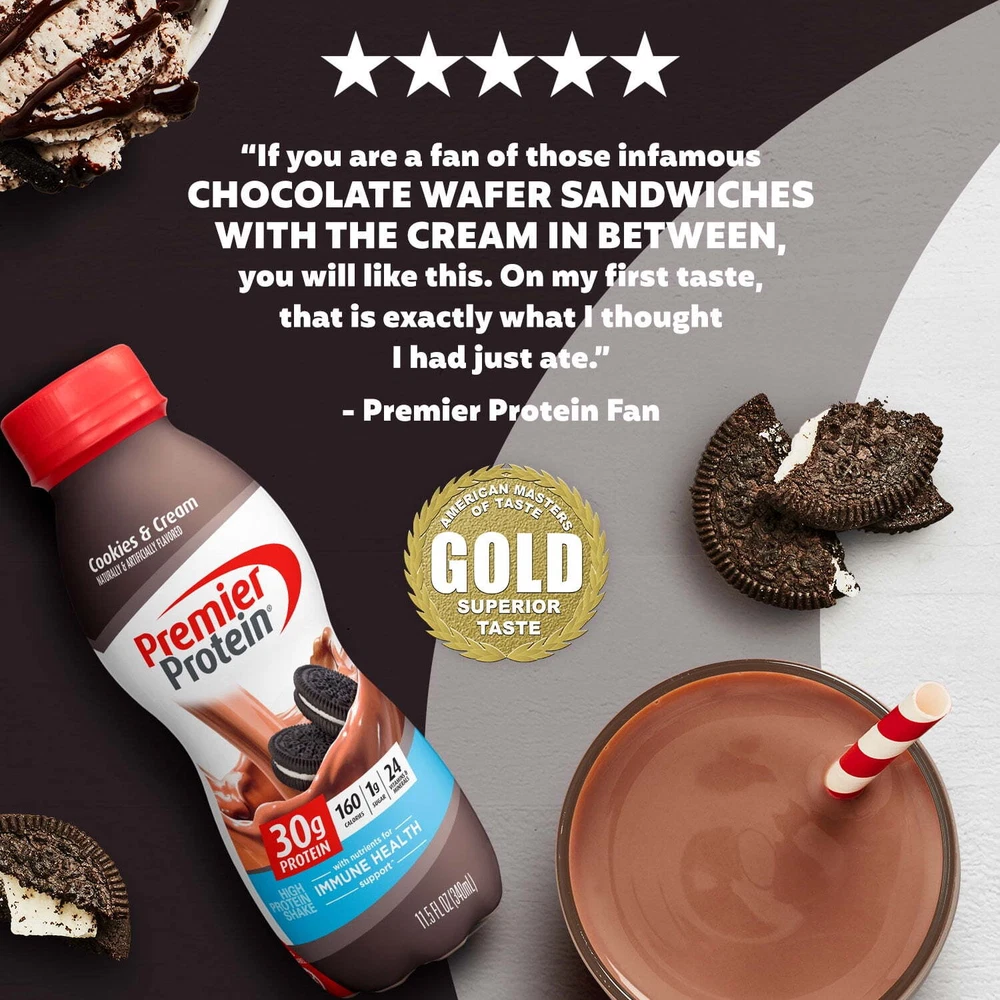Product details Packaged in a recyclable 11.5 fl oz bottle, each Premier Protein Shake contains 30 grams of protein, complete with all of the essential amino acids, 1g of sugar, 3-5g carbs (depending on flavor), 160 calories, 24 vitamins & minerals, and is also low in fat. We use a proprietary blend of milk protein and casein in our shakes to help fuel muscles quickly and for several hours to help support your goals. Enjoy a shake as a healthy snack, a breakfast on-the-go, an afternoon snack, or as pre- or post-workout fuel. They are delicious as is but are also highly customizable. Try blending with your favorite fruits and vegetables for a delicious smoothie or adding to cereal or oatmeal. Available in 12 delicious flavors: Chocolate, Vanilla, Cafe Latte, Caramel, Cookies & Cream, Strawberries & Cream, Bananas & Cream, Peaches & Cream, Cinnamon Roll, Chocolate Peanut Butter, Cake Batter Delight and Cookie Dough. Treat yourself to the mouthwatering flavor of cookies and cream; Winner of American Masters of Taste Gold Medal for SUPERIOR TASTING ready-to-drink protein beverages. 30g of protein to help curb your hunger, as a mid-day snack or for post workout recovery; includes all essential amino acids. 24 Vitamins and Minerals: Support a healthy immune system as part of a healthy diet and lifestyle (Antioxidants Vitamins C and E plus Zinc), 50 percent daily value of calcium and 30 percent daily value of Vitamin D to help maintain healthy bones. Guilt free indulgence: 1g Sugar, 3-5g Carbs (depending on flavor), 160 Calories and Low Fat; Gluten Free, Keto and Bariatric Friendly, Kosher. We're all in it together when it comes to helping out the environment! That's why we've designed a more sustainable shake bottle. We've lowered our carbon footprint and created a bottle that's easier to recycle by using less material, eliminating the foil seal on the bottle, and switching to PET plastic. Oh, and don't worry- your shakes will still taste just as amazing as always! Skip the hassle of protein powder with the convenience of this ready to drink protein shake; great on the go nourishment that also pairs well with coffee, cereal, a pancake recipe, or in your favorite smoothie. NOTICE: Use this product as a food supplement only. Do not use for weight reduction. Contains: Milk & Soy Try all twelve (12) flavors: Chocolate, Vanilla, Caramel, Cookies & Cream, Cafe Latte, Chocolate Peanut Butter, Strawberries & Cream, Peaches & Cream, Bananas & Cream, Cinnamon Roll, Cake Batter Delight, and Cookie Dough.