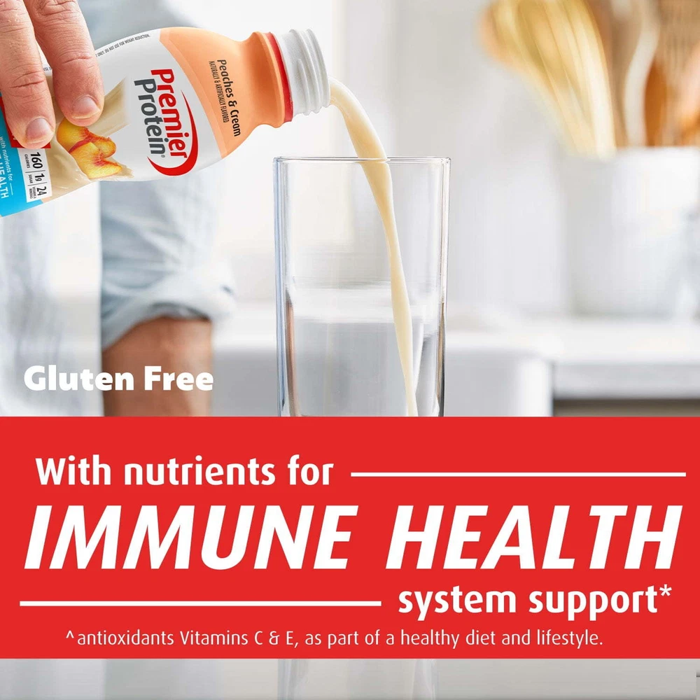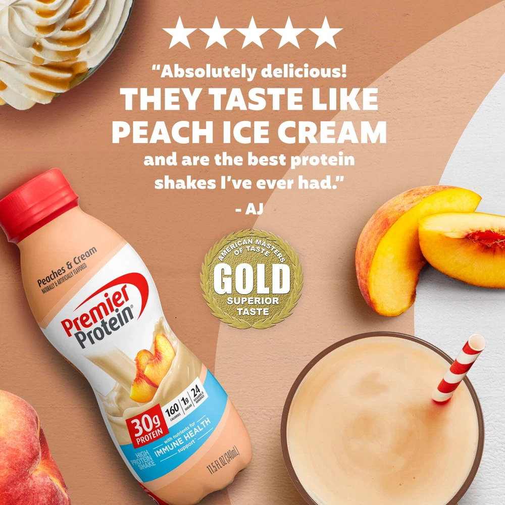 Product details Packaged in a recyclable 11.5 fl oz bottle, each Premier Protein Shake contains 30 grams of protein, complete with all of the essential amino acids, 1g of sugar, 3-5g carbs (depending on flavor), 160 calories, 24 vitamins & minerals, and is also low in fat. We use a proprietary blend of milk protein and casein in our shakes to help fuel muscles quickly and for several hours to help support your goals. Enjoy a shake as a healthy snack, a breakfast on-the-go, an afternoon snack, or as pre- or post-workout fuel. They are delicious as is but are also highly customizable. Try blending with your favorite fruits and vegetables for a delicious smoothie or adding to cereal or oatmeal. Available in 12 delicious flavors: Chocolate, Vanilla, Cafe Latte, Caramel, Cookies & Cream, Strawberries & Cream, Bananas & Cream, Peaches & Cream, Cinnamon Roll, Chocolate Peanut Butter, Cake Batter Delight and Cookie Dough. Get ready for the sweet, luscious flavor of peaches and cream; Winner of American Masters of Taste Gold Medal for SUPERIOR TASTING ready-to-drink protein beverages. 30g of protein to help curb your hunger, as a mid-day snack or for post workout recovery; includes all essential amino acids. 24 Vitamins and Minerals: Support a healthy immune system as part of a healthy diet and lifestyle (Antioxidants Vitamins C and E plus Zinc), 50 percent daily value of calcium and 30 percent daily value of Vitamin D to help maintain healthy bones. Guilt free indulgence: 1g Sugar, 3-5g Carbs (depending on flavor), 160 Calories and Low Fat; Gluten Free, Keto and Bariatric Friendly, Kosher. We're all in it together when it comes to helping out the environment! That's why we've designed a more sustainable shake bottle. We've lowered our carbon footprint and created a bottle that's easier to recycle by using less material, eliminating the foil seal on the bottle, and switching to PET plastic. Oh, and don't worry- your shakes will still taste just as amazing as always! Skip the hassle of protein powder with the convenience of this ready to drink protein shake; great on the go nourishment that also pairs well with coffee, cereal, a pancake recipe, or in your favorite smoothie. NOTICE: Use this product as a food supplement only. Do not use for weight reduction. Contains: Milk & Soy Try all twelve (12) flavors: Chocolate, Vanilla, Caramel, Cookies & Cream, Cafe Latte, Chocolate Peanut Butter, Strawberries & Cream, Peaches & Cream, Bananas & Cream, Cinnamon Roll, Cake Batter Delight, and Cookie Dough.