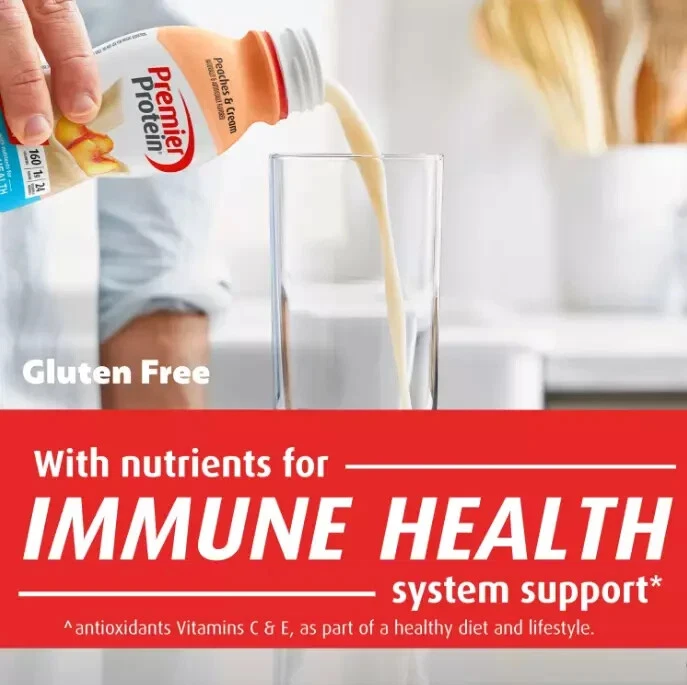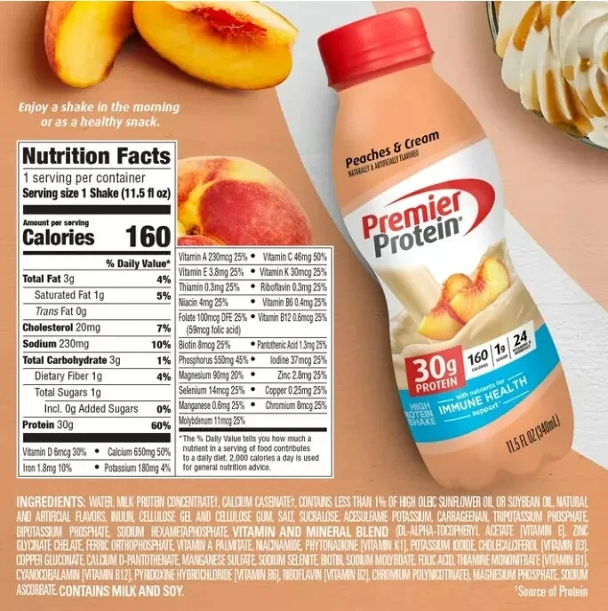 bout this item Brand Premier Protein Flavor Peaches & Cream Number of Items 12 Allergen Information Milk, Soy Package Information Bottle Get ready for sweet, luscious peach flavor that will make you wonder if you even need ice cream and cobbler; Winner of American Masters of Taste Gold Medal for SUPERIOR TASTING ready-to-drink protein beverages 30g of protein to help curb your hunger, as a mid-day snack or for post workout recovery; includes all essential amino acids 24 Vitamins and Minerals: Support a healthy immune system as part of a healthy diet and lifestyle (Antioxidants Vitamins C and E plus Zinc), 50 percent daily value of calcium and 30 percent daily value of Vitamin D to help maintain healthy bones Guilt free indulgence: Satisfying low fat shake with 1g sugar, 3g carbs, 160 calories and Keto friendly Try all eleven (11) delicious smooth and creamy flavors: Chocolate, Vanilla, Caramel, Cookies & Cream, Cafe Latte, Strawberries & Cream, Peaches & Cream, Bananas & Cream, Cinnamon Roll, Chocolate Peanut Butter and Cake Batter Delight Skip the hassle of protein powder with the convenience of this ready to drink protein shake; great on the go nourishment that also pairs well with coffee, cereal, a pancake recipe, or in your favorite smoothie NOTICE: Use this product as a food supplement only. Do not use for weight reduction Contains: Milk and Soy. Ingredients Water, Milk Protein Concentrate†, Calcium Caseinate†, Contains less than 1% of High Oleic Sunflower Oil or Soybean Oil, Natural and Artificial flavors, Inulin, Cellulose Gel and Cellulose Gum, Salt, Sucralose, Acesulfame Potassium, Carrageenan, Tripotassium Phosphate, Dipotassium Phosphate, Sodium Hexametaphosphate, Vitamin and Mineral Blend (Dl-alpha-tocopheryl Acetate [Vitamin E], Zinc Glycinate Chelate, Ferric Orthophosphate, Vitamin A Palmitate, Niacinamide, Phytonadione [Vitamin K1], Potassium Iodide, Cholecalciferol [Vitamin D3], Copper Gluconate, Calcium D-Pantothenate, Manganese Sulfate, Sodium Selenite, Biotin, Sodium Molybdate, Folic Acid, Thiamine Mononitrate [Vitamin B1], Cyanocobalamin [Vitamin B12], Pyridoxine Hydrochloride [Vitamin B6], Riboflavin [Vitamin B2], Chromium Polynicotinate), Magnesium Phosphate, Sodium Ascorbate. CONTAINS: MILK AND SOY.