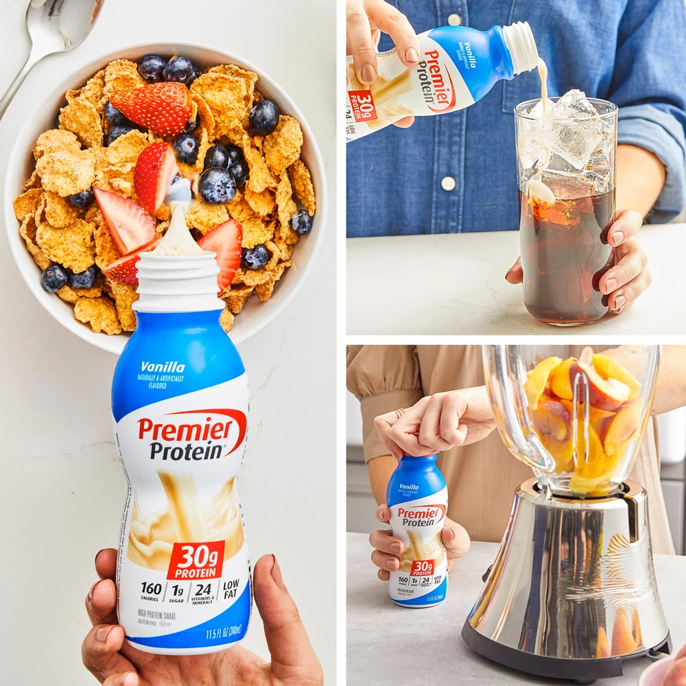 Product details Packaged in a recyclable 11.5 fl oz bottle, each Premier Protein Shake contains 30 grams of protein, complete with all of the essential amino acids, 1g of sugar, 3-5g carbs (depending on flavor), 160 calories, 24 vitamins & minerals, and is also low in fat. We use a proprietary blend of milk protein and casein in our shakes to help fuel muscles quickly and for several hours to help support your goals. Enjoy a shake as a healthy snack, a breakfast on-the-go, an afternoon snack, or as pre- or post-workout fuel. They are delicious as is but are also highly customizable. Try blending with your favorite fruits and vegetables for a delicious smoothie or adding to cereal or oatmeal. Available in 12 delicious flavors: Chocolate, Vanilla, Cafe Latte, Caramel, Cookies & Cream, Strawberries & Cream, Bananas & Cream, Peaches & Cream, Cinnamon Roll, Chocolate Peanut Butter, Cake Batter Delight and Cookie Dough. Classic and oh-so-dreamy vanilla flavor that tastes like vanilla wafers; Winner of American Masters of Taste Gold Medal for SUPERIOR TASTING ready-to-drink protein beverages. 30g of protein to help curb your hunger, as a mid-day snack or for post workout recovery; includes all essential amino acids. 24 Vitamins and Minerals: Support a healthy immune system as part of a healthy diet and lifestyle (Antioxidants Vitamins C and E plus Zinc), 50 percent daily value of calcium and 30 percent daily value of Vitamin D to help maintain healthy bones. Guilt free indulgence: 1g Sugar, 3-5g Carbs (depending on flavor), 160 Calories and Low Fat; Gluten Free, Keto and Bariatric Friendly, Kosher. We're all in it together when it comes to helping out the environment! That's why we've designed a more sustainable shake bottle. We've lowered our carbon footprint and created a bottle that's easier to recycle by using less material, eliminating the foil seal on the bottle, and switching to PET plastic. Oh, and don't worry- your shakes will still taste just as amazing as always! Skip the hassle of protein powder with the convenience of this ready to drink protein shake; great on the go nourishment that also pairs well with coffee, cereal, a pancake recipe, or in your favorite smoothie. NOTICE: Use this product as a food supplement only. Do not use for weight reduction. Contains: Milk & Soy Try all twelve (12) flavors: Chocolate, Vanilla, Caramel, Cookies & Cream, Cafe Latte, Chocolate Peanut Butter, Strawberries & Cream, Peaches & Cream, Bananas & Cream, Cinnamon Roll, Cake Batter Delight, and Cookie Dough.