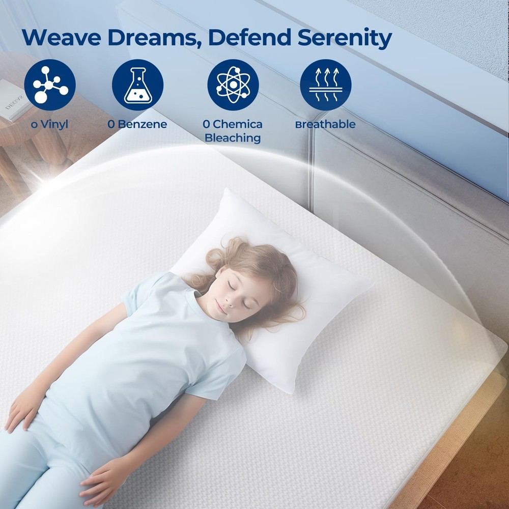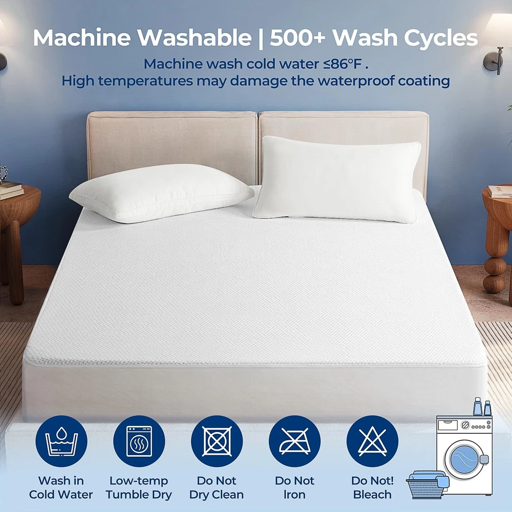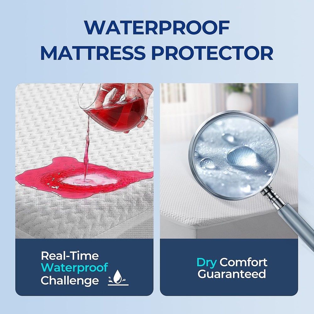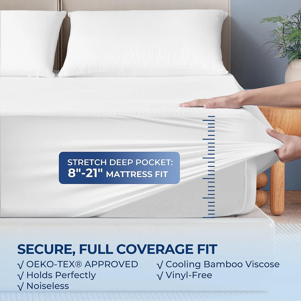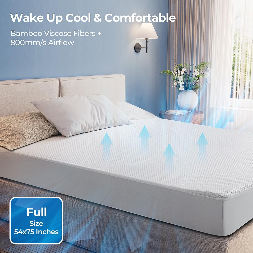 Introducing our bamboo viscose Fiber Waterproof Mattress Protector, a revolutionary bedding accessory that combines the natural benefits of bamboo viscose fiber with exceptional waterproofing. Key Features: Enhanced Waterproofing: Our mattress protector is equipped with a state-of-the-art waterproof layer, ensuring complete protection against spills, stains, and liquid damage. You can trust that your mattress will stay dry and clean. Breathable and Cooling: The bamboo viscose fiber construction allows for excellent breathability, promoting airflow and maintaining a cool and comfortable sleep environment. Gentle: Crafted from bamboo viscose fibers, our mattress protector is gentle on the skin and ideal for those with sensitivities. Soft and Luxurious: Experience the plush comfort of bamboo viscose fibers that provide a soft and smooth surface for a restful sleep experience. Easy Maintenance: Our mattress protector is machine washable and easy to care for, ensuring convenience and durability. Each full mattress protector measures 54 by 75 inches, Certified & tested for harmful substances with OEKO-TEX STANDARD 100 requirements [High Quality Material] - The full size mattress protector, made from bamboo viscose, is soft, moisture-wicking and more breathable than cotton terry covers. Its waterproof & elastic sides promote more airflow, hence are both comfortable and protective, for a better sleep [100% Waterproof] - The full mattress protector has a bamboo viscose quilted surface and TPU backing certified impermeable. Vinyl-free and ideal for kids, pets, incontinence, or eczema. The waterproof membrane keeps the mattress fresh and long-lasting [Deep Pocket & 360° Elastic Band] - The full size mattress protector waterproof has a fitted sheet-style design for easy removal and replacement. The elastic knit band provides a secure fit on mattresses of 8-21 inches deep. It protects against liquids, dust, stains, and fits various mattress types [3D Air Fabric & Noiseless] - The full size waterproof mattress protector is filled with 3D Air Fabric that repels liquids and allows air circulation. It safeguards the mattress while enhancing its elasticity and breathability. The noiseless bamboo viscose fabric with TPU backing ensures a peaceful, crinkle-free night's sleep