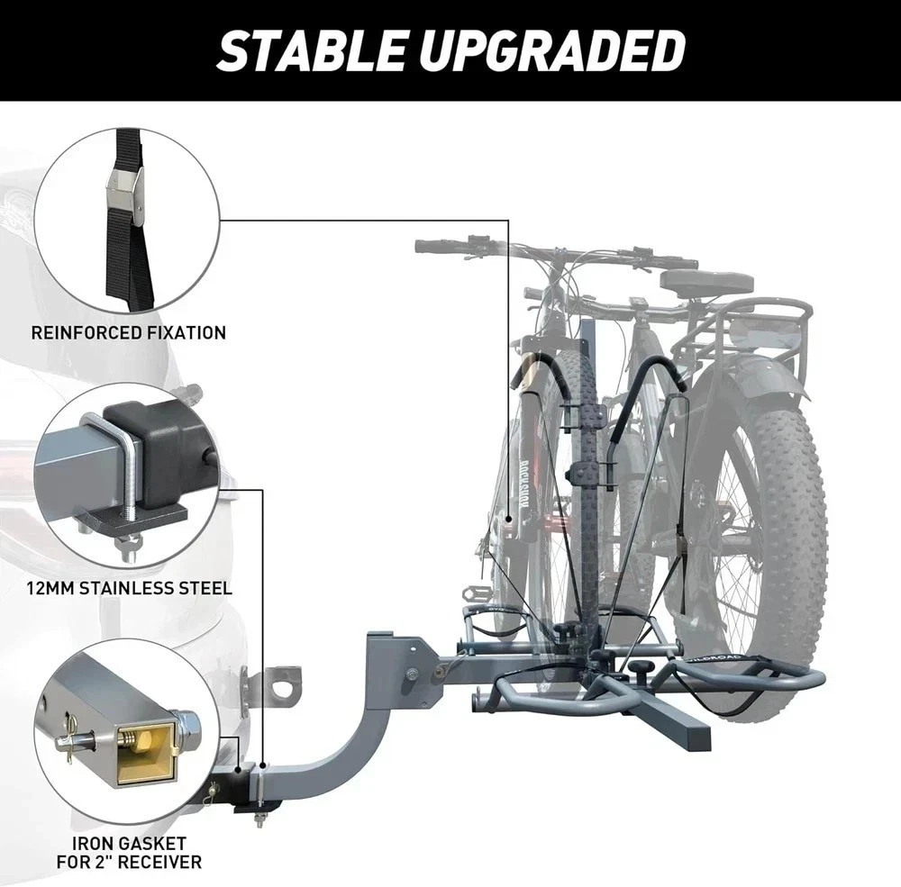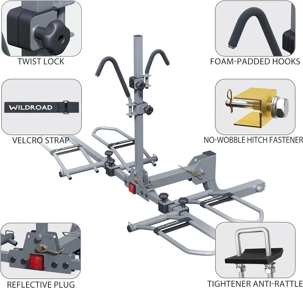 About this item 2-Bike Rack: WILDROAD hitch bike rack made for SUV, truck, off-road vehicle with 180 lbs. load capacity. Can be loaded with Standard bicycles, heavy-duty bicycles, mountain bikes and road bikes, even for fat tire bike and e-bike SAFE & STABLE: Our bike rack for car with premium foam-padded hooks and heavy duty nylon straps, it can fix the bicycle firmly without hurting the paint of the bicycle, No-wobble fastener and anti-rattle stabilizer, which can make the bike rack more stable to hold your bicycles FOLDABLE & TILTABLE: The bike racks for tow hitch is easy to assemble and mount on hitch, when not in use it can be folded up for space-saving. Special tiltable construction let you open the trunk without removing the bike rack, just need to tilt it down UNIVERSAL & ADJUSTABLE: This bike rack for hitch has adjustable hooks for holding bike frame, and adjustable tire holders with heavy duty velcro straps can fix different sizes of bicycles&tires, Real reflective plug at the end of it makes driving more safe in the night SATISFACTION GUARANTEED: At WILDROAD, we prioritize customer satisfaction. We are committed to providing exceptional quality. We stand behind the quality of our product and are dedicated to ensuring your complete satisfaction with your purchase Product Description Shipping We offer FREE shipping on all orders! We ship within Three business days of payment, usually sooner. We use a selection of shipping services such as UPS, FedEx, USPS etc. Local pickups and combined shipping options are not provided at this time. Return You can return a product for up to 30 days from the date you purchased it. Any product you return must be in the same condition you received it and in the original packaging. Please keep the receipt. Payment We accept payment by any of the following methods: PayPal Please pay as soon as possible after winning an auction, as that will allow us to post your item to you sooner! Feedback Customer satisfaction is very important to us. If you have any problem with your order, please contact us and we will do our best to make you satisfied. Contact Us If you have any queries, please contact us via ebay. We usually respond within 24 hours on weekdays. Please visit our eBay store to check out other items for sale! Thank you for shopping at our store. Disclaimer We are working with different suppliers in USA to deliver the item to your doorstep. If you have any issues regarding the item, Feel free to ask.
