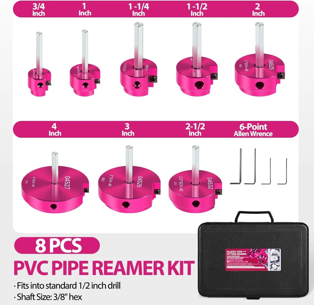 Premium 8Pcs PVC Pipe Reamer Kit - Complete Reamer Set, Fits Standard 1/2" Drills, Includes P3/4", 1", 1-1/4", 1-1/2", 2", 2-1/2", 3", 4" For Standard 1/2" Drills, Ideal for PVC, CPVC, ABS Pipes 【Comprehensive 8-Piece Set Design】 This PVC pipe reamer kit includes 8 different reamer sizes: 3/4", 1", 1-1/4", 1-1/2", 2", 2-1/2", 3", and 4". This set meets a wide range of pipe processing needs, from small to large, making it suitable for various plumbing tasks. 【Fits Standard 1/2" Drills】 This PVC pipe reamer kit is designed to fit standard 1/2" drills, The reamers feature a 3/8" hex shaft, ensuring compatibility with a wide range of drilling tools. Whether you're using a corded drill, cordless drill, or impact drill, this versatile kit seamlessly integrates into your toolkit, making it perfect for professional plumbers and DIY enthusiasts alike. 【Tailored Precision Design】 Crafted for North American pipe diameters, this product offers precise reaming for demanding precision work. Made from the latest hard alloy, it ensures high strength, durability, and a prolonged service life. Its custom design guarantees perfect compatibility with pipes, while its efficient cleaning functionality removes residual pipes and solvent cement residues, facilitating fitting reusability and saving time and material costs. 【The Preferred Reamer Tool for Professionals】 Trusted by professionals in the plumbing industry, this 8-piece PVC pipe reamer kit is an indispensable tool. With its complete size range covering all common pipe diameters, it ensures versatility and convenience for various repair and maintenance tasks. Plumbers rely on its proven reliability and comprehensive size range to tackle any plumbing job with precision and efficiency. It's the preferred reamer tool for professionals. 【Time and Money Saver】 This product helps users save time and money by eliminating the need to replace the entire pipeline system. By cleaning residual pipes and cement, and removing old broken pipes, it ensures the secure installation of new pipes. Simply using this product for pipe maintenance and repair saves a significant amount of maintenance costs and time investment. 【Reliability Guaranteed】 Our product is not only affordable but also tested for 1000 reams to ensure reliability. By cleaning old pipes and installing new ones, it saves the cost of replacing the entire pipeline system, providing a reliable solution for long-term use. 【Leak-Free Joint Assurance】 This PVC pipe reamer ensures leak-free joints and optimal flow for PVC, CPVC, and ABS pipes. By eliminating irregularities, it enhances overall system performance and longevity. Invest in this reamer for reliable connections and uninterrupted water flow. CONTACT US: If you meet any problem after receiving our product, please feel free to contact us. We will try our best to solve your problem. SHIPPING POLICY: Orders will be ship out within 1-2 business days after payment has cleared. Orders from Saturdays, Sundays or holidays will process on next business day and will be ship within 24 hours. Please allow 10-30 days for international deliveries. Some shipments could take longer subject to your local customs authorities. RETURE & WARRANTY: 1 We accept 30 days return guarantee for all Items If you are unsatisfied with something you bought from us, you may send it back within 30 days of receipt, and we shall be happy to exchange or refund. 2 Leave a message note in returned box quoting your item(s) ID and buyer ID. 3 All returned products must be in their original condition and packaging. Unfortunately, if products have been assembled or modified, we cannot take them as returns. 4 It is important that we know when your return is expected. Please save your return tracking number or post receipt, and email it to us. We need this in case there are any issues during transit. 5 Refund will only be issued upon our receipt of the returned parcel. Please allow 2 working days for us to process with your return. ABOUT REPLY: If you have any questions, please feel free to email our service specialists 24 Hours a Day, 7 Days a Week, and we will reply you ASAP. If no response within 24 Hours, please check the spam of mail box or kindly re-send it to us. ABOUT FEEDBACK: Please contact us before leaving Netural or Negative feedback if you are not satisfied our service or products. Good communication is helpful for both of us to resolve any problems and issues. We work hard to make sure EVERY CUSTOMER 100% SATISFIED and resolve any problem for you and always leave positive feedback to all our customers. If you are satisfied with our service, please leave FOUR 5-Detailed Selling Rating (DSR). Thanks!