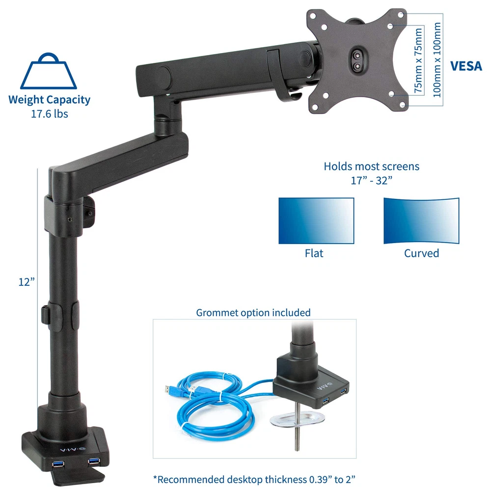 Premium Aluminum Construction - Provides excellent support for one monitor screen weighing up to 17.6 lbs, and the built-in elbow spring gauge allows perfect weight adjustment at any level. Fully Adjustable - Mechanical spring arm offers an exceptional range of flexible motion featuring -90° to +90° tilt, 180° swivel, and 180° rotation. Maximum screen height to the center of the screen is 24.4". Mounting Options - The sturdy desk clamp installs from the top side of your desk for easy setup, and an equally secure grommet mount is provided to accommodate a variety of desk layouts. Recommended desktop thickness ranges from 0.39” to 2”. Compatibility - Fits most 17” to 32” computer monitors on the market (both flat and curved screens). The quick release VESA bracket has 75x75mm and 100x100mm mounting capability. Two 3.0 USB ports are provided on the stand’s base for convenient access when you want to charge a device or sync something with your computer. We've Got You Covered - Sturdy steel design is backed with a 3 Year Manufacturer Warranty and friendly tech support to help with any questions or concerns.
