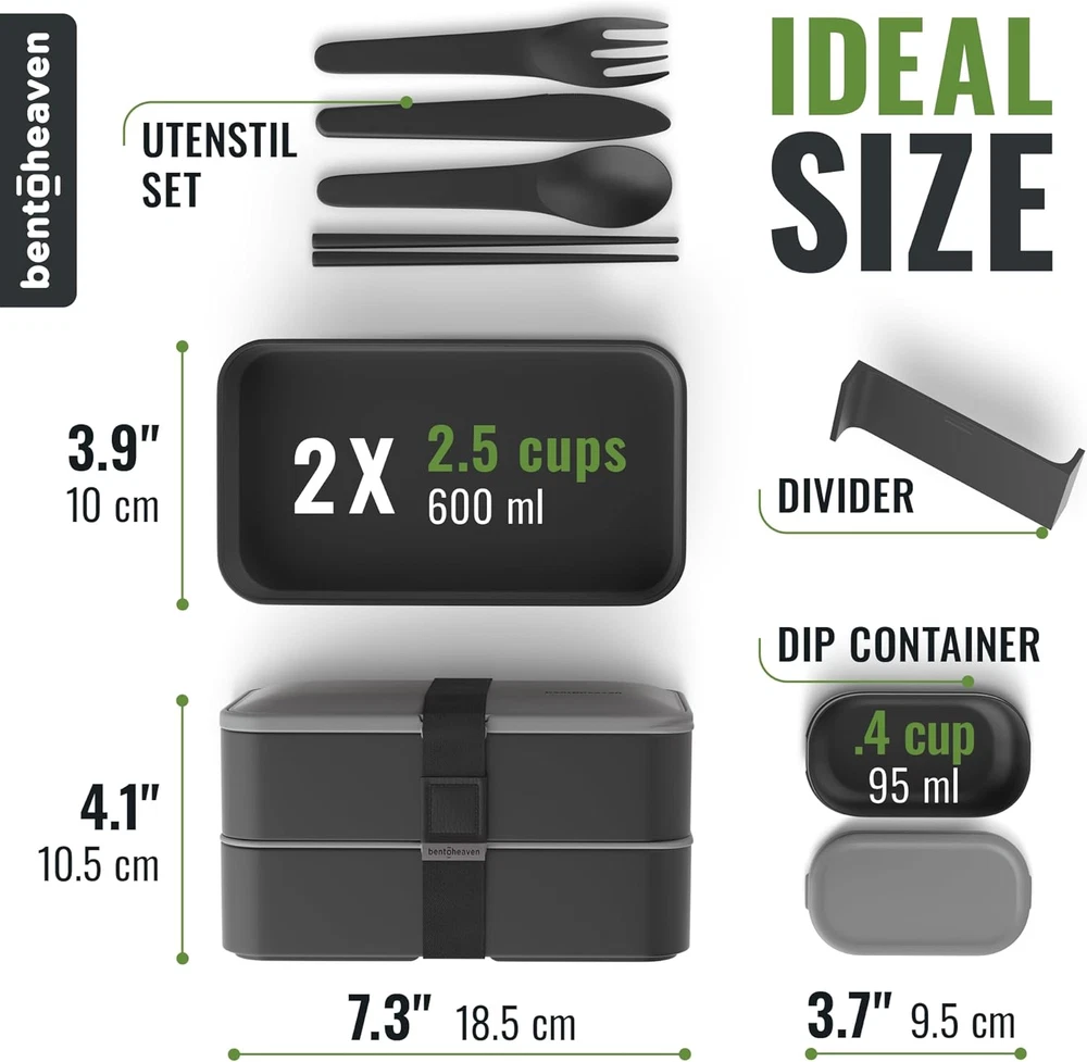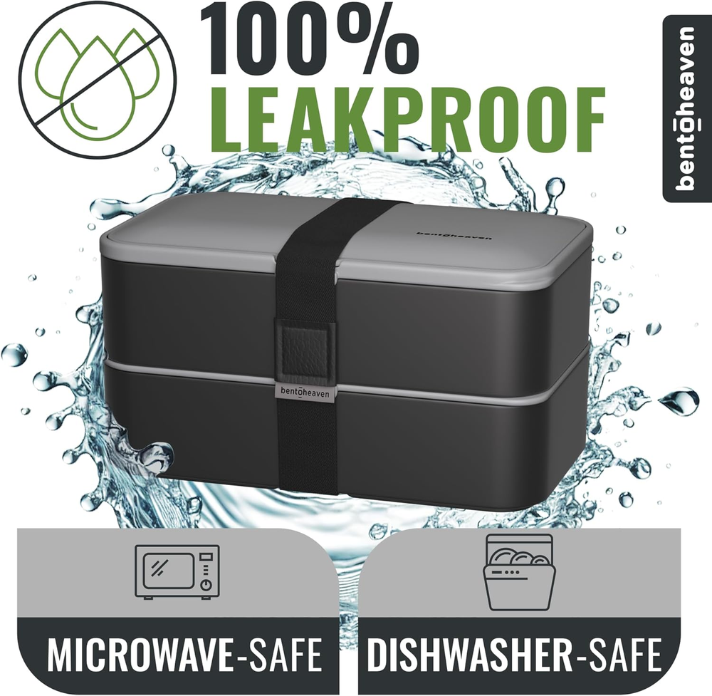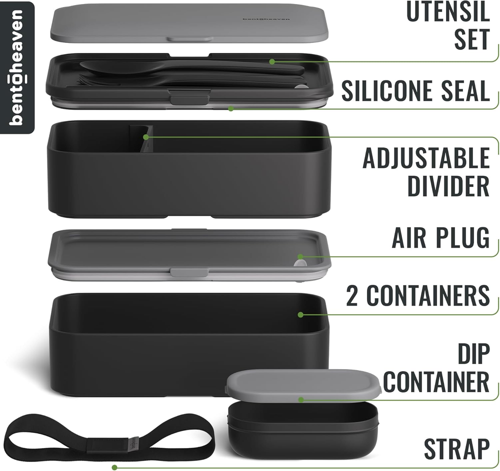Your meals deserve a Premium Bento Box! It features 2 stackable compartments that hold 40 oz., 2 silicone sealed lids, divider, dip container, chopsticks, fork, spoon, knife, and a sealing strap. Leakproof Bento Lunch Box! The Bentoheaven lunch box’s strong silicone makes it 100% leak-proof, while remaining super easy to open due to the built-in air vent plug. Dishwasher and Microwave-safe Bento Lunch Box for Adults & Kids! Made with lab-tested 100% BPA-free and food-grade materials, keeping your lunch both fresh & safe. Recipe e-book inlcuded! To help you make the most out of your Japanese Lunch Box, you’ll get an e-book with 30 lunchbox recipes with healthy, nutritious meals. Purchase with a Purpose: Your purchase allows us to support Feeding America in helping the millions in this country who struggle to afford high-quality food. Product Description The video showcases the product in use. The video guides you through product setup. The video compares multiple products. The video shows the product being unpacked. Bentoheaven Bento Box Adult Merchant Video Are the lids leak-proof? The lids are highly leak-resistant with silicone seals to prevent spills. However, for very liquid-heavy foods, we recommend keeping the box upright for added security. Can the compartments hold larger meals like sandwiches? The compartments are ideal for standard meals but may be too shallow for oversized sandwiches. For larger items, consider slicing them to fit comfortably. Is the bento box suitable for portion control? Yes, the bento box is designed for portion control, making it perfect for balanced meals. Its compact compartments help manage food portions effectively. How durable are the materials used in the bento box? The bento box is made of high-quality, BPA-free materials, ensuring durability for daily use. It is dishwasher-safe and designed to last. Does the box come with utensils, and are they practical? Yes, the box includes reusable utensils (fork, spoon, knife, and chopsticks) in a dedicated compartment. They are sturdy, easy to clean, and perfect for on-the-go meals. Complete Your Collection! Add to Cart Add to Cart Add to Cart Add to Cart Add to Cart Add to Cart Customer Reviews 4.5 out of 5 stars 11,788 4.5 out of 5 stars 11,788 4.5 out of 5 stars 11,788 4.6 out of 5 stars 48 4.6 out of 5 stars 48 4.5 out of 5 stars 810 4.5 out of 5 stars 11,788 Price $24.99 $ 24 . 99 $29.99 $ 29 . 99 $29.98 $ 29 . 98 $59.99 $ 59 . 99 — $28.99 $ 28 . 99 $29.99 $ 29 . 99 Variant Symph-Onyx Outer Space Bright Light Midnight Glacier Cobalt Ice Gray/Black Steel My Heart Description Japanese-Style Bento Lunch Box Japanese-Style Bento Lunch Box Japanese-Style Bento Lunch Box Insulated, large capacity bag Insulated, large capacity bag Insulated Classic Lunch Bag Japanese-Style Bento Lunch Box Highlights Stylish, Compact, Versatile Stylish, Compact, Versatile Stylish, Compact, Versatile Exceptional material quality Exceptional material quality Minimalistic, Classic Stylish, Compact, Versatile Materials Premium Food-Safe, BPA-free Premium Food-Safe, BPA-free Premium Food-Safe, BPA-free Premium Food-Safe, BPA-free Premium Food-Safe, BPA-free Premium Food-Safe, BPA-free Premium Food-Safe, BPA-free Design Designed in Europe Designed in Europe Designed in Europe Designed in Europe Designed in Europe Designed in Europe Designed in Europe