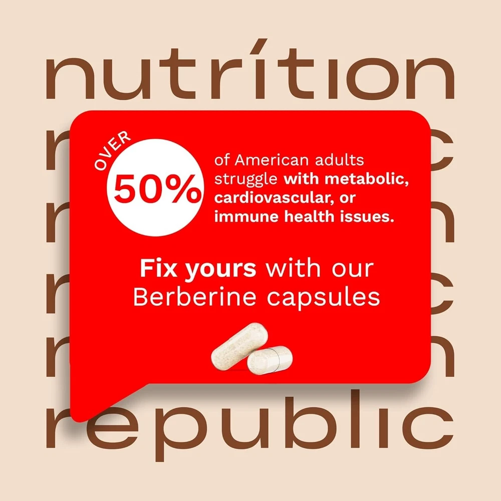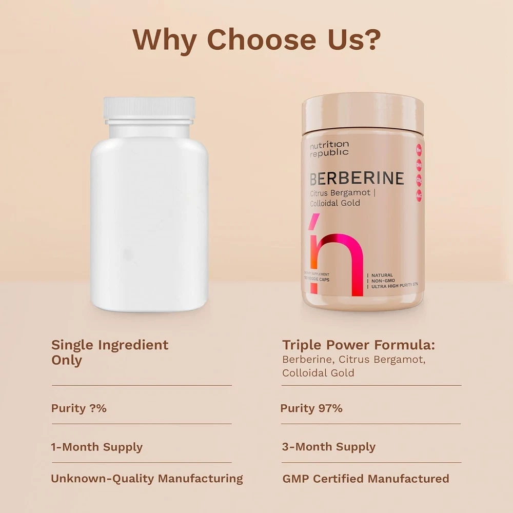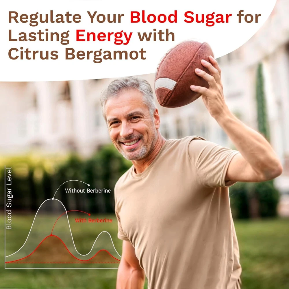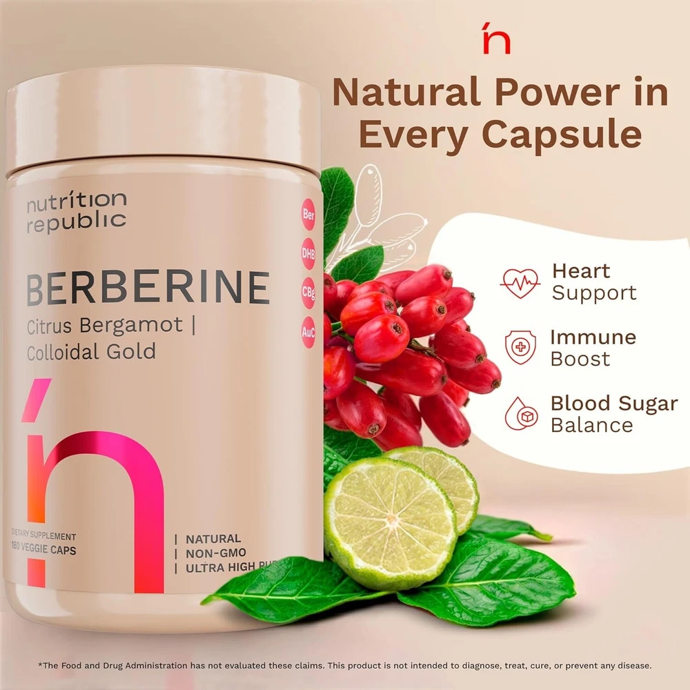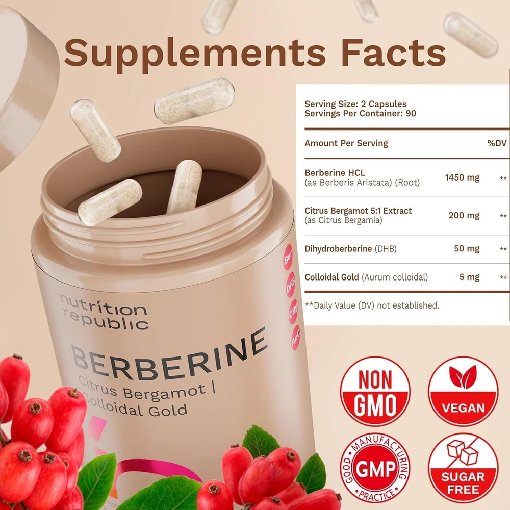 COMPLETE BERBERINE SUPPORT: Our advanced Berberine Supplement offers a powerful combination of Berberine HCl, Citrus Bergamot, and Colloidal Gold. This unique blend provides comprehensive support for daily wellness, helping you maintain natural balance and vitality. HIGH PURITY 1450MG FORMULA: Our supplement delivers a concentrated dose of 1450mg Berberine HCl, formulated for superior purity and potency. This high-strength blend ensures effective support for overall well-being with quality you can trust. NATURAL ENERGY & WELLNESS: Berberine, along with Citrus Bergamot and Colloidal Gold, supports the body’s natural energy processes. This synergistic formula promotes balance, making it a great addition to your daily routine for long-term support. WITH CITRUS BERGAMOT & COLLOIDAL GOLD – Our berberine supplement is enhanced with Citrus Bergamot and Colloidal Gold, known for their natural wellness properties. Together, they offer a more complete and balanced approach to daily support. QUALITY YOU CAN TRUST: Our product is Non-GMO, Gluten-Free, Vegan, and made without artificial additives. Manufactured in a certified facility and third-party tested for safety and purity, ensuring the highest standards in every capsule.