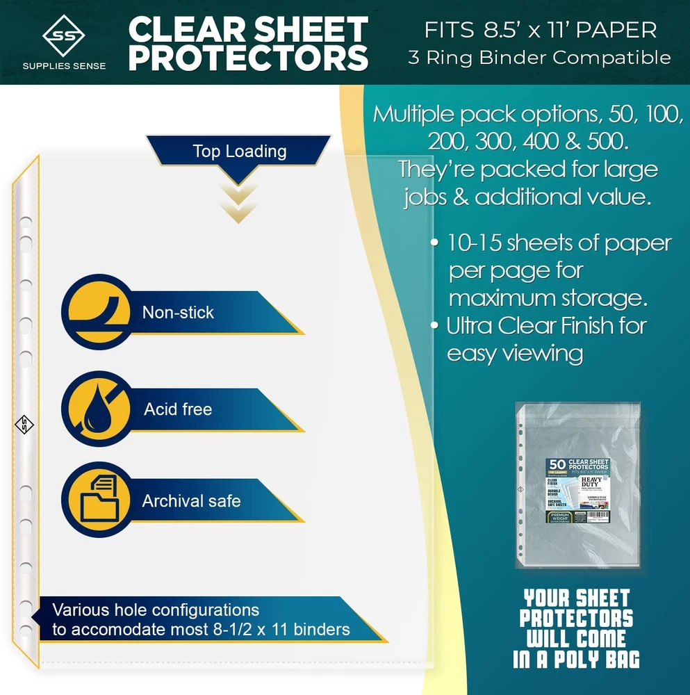 Premium Clear Sheet Protectors for 3 Ring Binders - 500 Pack, 8.5 x 11 Supplies-ingly Handy! We can make things easier for your organizational needs for office supplies or school supplies. Each sheet can hold up to 10-15 sheets of printing paper 8.5 x 11" (A4 size paper). Our sets are jam-packed with high-quality, crystal clear & durable page protectors suitable for everyday use. Great bulk sheet protectors you can use for a very, very long time of safe and secure storage, documentation and archiving. Goes perfectly with A4 binders too! Only the Best Qualities! All our sheets are Non-Glare, Acid-Free, Archival-Safe, with a flexible 11-Hole binder spine that fits 3 Ring Binders, A5 Binders, or Albums of your choice. Hassle-free storage of your valuable documents, photo papers, records, budget cards, recipes, reference materials, business documents & even collectibles such as kpop cards or your favorite limited edition art print. Heavy Duty All Day & Night! Strong, durable, everyday use protector sheets 8.5 x 11. Creating an effortless plus smooth storage & office organization experience. Even at home or school, our sheet pages will come in handy. You can use these sheets to make your ultimate photocard binder, recipe binder & even family scrapbooks. Today is a good day to get even more organized. 8.5 inches x 11.0 inches x 0.01 inches. Weight: 10.55 oz Item model number SSSP Sheet Size 8.5 x 11 Centimeters Number of Items 50 Color Clear Material Plastic Polypropylene Material Type Plastic Polypropylene Manufacturer Part Number SSSP Style 50 Pack Item Weight 10.55 ounces Product Dimensions 11 x 8.5 x 0.01 inches Size 8.5 x 11 centimeters