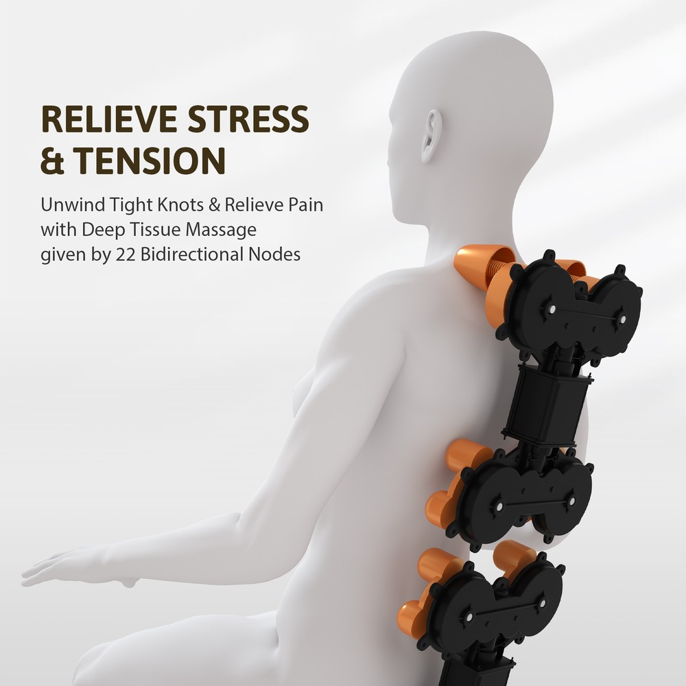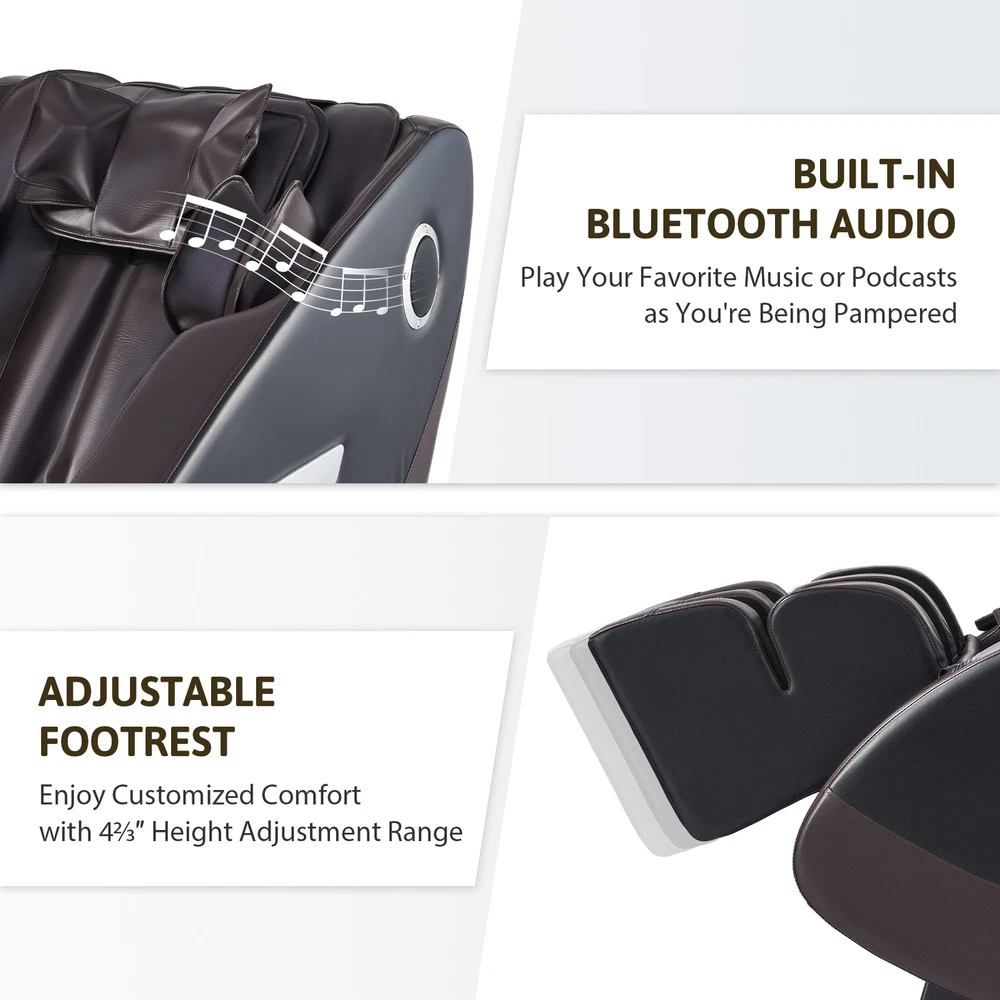 NOTE Because of the size and weight of this product, it will ship in 2 separate packages which may arrive at different times. DESCRIPTION This multifunctional massage chair provides unrivaled comfort for your relaxation needs. Our full-body massage chair’s 22 nodes generate kneading power while multiple inflating air cushions cradle and squeeze your arms, shoulders, hips, and calves to quickly get rid of all your tension and stress. This massager targets your shoulders, back, legs, and feet, restoring your vitality with 15 to 30 minutes of vibration, pressure, and kneading. The lower back heating system releases tightened knots to provide long lasting relief. The footrest adjusts by 4.3 inches to accommodate all your family members. This 8D massage chair's zero gravity mode will bring your experience to another level by allowing you to slide into a weightless position that decompresses your spinal vertebrae and relaxes your muscles. The built-in Bluetooth speakers let you play music, audiobooks, or podcasts while getting massaged. This chair’s various massage patterns and intensity levels suit your particular needs, and the remote control makes it easy to control. FEATURES ERGONOMIC 8D CHAIR This 8D massage chair uses 22 kneading nodes and multiple inflating cushions to generate massaging and squeezing power that relieves stress and tension from head to toe. ZERO-GRAVITY RECLINE This all in one full body massager gently elevates your feet to the same level as your heart and reclines into a weightless position where you can feel back pain relieved. COMPLETE RELAXATION Heating pads in the lumbar area add warmth to loosen knots and reduce tension; use our Bluetooth system to listen to calming music, sounds from nature, and more DURABLE CONSTRUCTION This circulation booster's sturdy metal frame supports up to 330 pounds ; the foam padding inside the plush, ultra-soft faux-leather ensures lasting comfort; do take care, however, that your doorways are at least 30 inches wide to accommodate this spacious chair TOTAL CONTROL At the push of a button, the intuitive corded controller customizes your massage mode, position, intensity, speed, and heat to give you just the right pressure in just the right spot SPECIFICATION Material: Faux Leather, ABS, Nylon , Carbon Steel, Copper Color: Brown Input: 110V/60Hz Rated Power: 90W Dimensions: 59 x 29.5 x 38.2 in. (150x75x97cm) Head Rest Width: 9.8 in. (25 cm) Leg Rest Width: 5.9 in. (15 cm) ea. Weight Capacity: 330 lb. (150 kg) Package Weight: 85 & 33 lb. (39 & 15 kg) Min. Door Width: 30 in. (75 cm) PACKAGE LIST 1 x Massage Chair 1 x Instruction Manual
