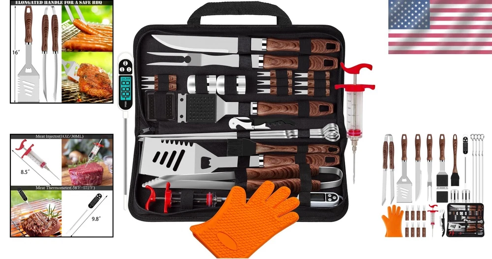 Brand: Unbranded Type: BBQ Tool Set Number Of Pieces: 26 Personalize: No Handle Material: Stainless Steel Is Dishwasher Safe: Yes Size: Standard Number in Pack: 26 Finish: Polished Head Material: Stainless Steel Features: Dishwasher Safe, Heat Resistant, Long Handle, Non-Slip, Hanging Loops, Portable, Durable, Organized Pouch, Lightweight, Easy Clean gtin13: Does not apply Material: Stainless,stainless Steel Set Includes: Grill Utensils Set, Multi-task spatula, Fork, Knife, Tongs, Basting brush, Grill mitts, Meat injector, Instant thermometer, Waiter’s Corkscrew, Grill brush with scraper, Extra brush head, Shakers for salt and pepper, BBQ skewers, Corn holders, Durable zipper bag Material Type: Stainless,stainless Steel Style: Modern Is The Item Dishwasher Safe?: Yes Item Weight: Lightweight Number of Items in Set: Twenty-Six-Piece UPC: Does not apply Color: Brown