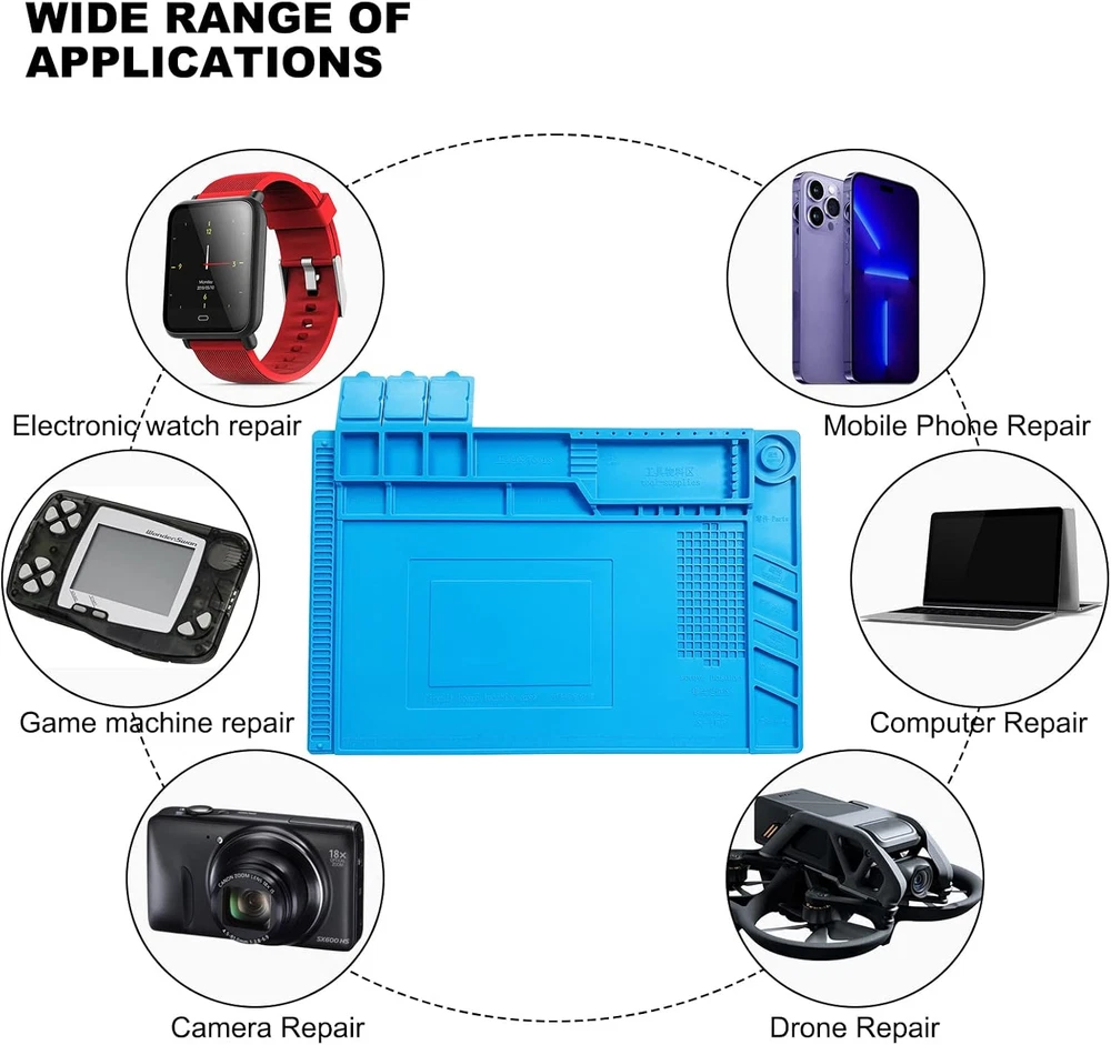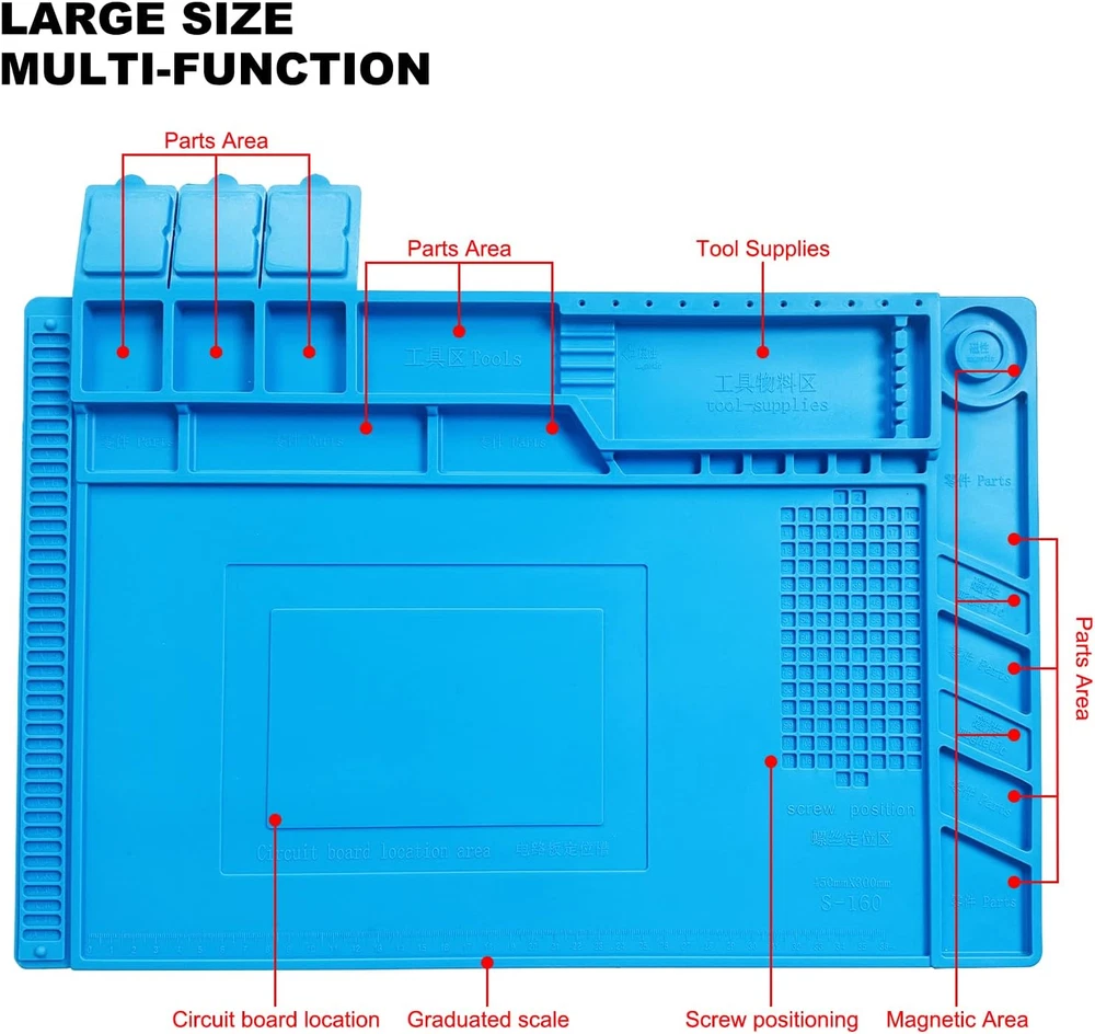 Silicone 【HEAT AND ANTI-STATIC 】 Solder pad can resist high temperature 932°F(500°C), at the same time has good heat dissipation and anti-static function, in the protection of your workbench will not be damaged at the same time can protect your line components will not be damaged 【LARGE SIZE AND MULTI-FUNCTION 】 17.7*11.8 Large size design, welding pad can provide a larger work space, to meet your multiple projects at the same time, multi-area design, make your maintenance more convenient 【HIGH QUALITY MATERIAL】 Silicone welding pad adopts high quality silicone material, high temperature resistance, anti-static, flame retardant, non-slip, no odor, no deformation, while working can also give you a comfortable working environment 【WIDE RANGE OF APPLICATION 】 Large solder pad is the ideal repair platform for laptop computers, mobile phones, cameras, electronic watches, electronic toys and other electronic products, can also be used for electric soldering iron, heat gun electronic welding. 【AFTER-SALES AND COMMITMENT】 This solder mat is specially designed for table welding, is the best gift for friends and family, if you have any questions, feel free to contact us, we will reply to you within 24 hours, I wish you a happy life Product Description Workbench pad, whether you are an electronic repair worker, or do manual, this soldering pad is a good choice for you Workbench pad, whether you are an electronic repair worker, or do manual, this soldering pad is a good choice for you Organize and Simplify : With its multi-functionality and practical features, this repair mat helps you stay organized and makes your repair work a breeze. No more searching for tiny screws or struggling to keep track of different parts. It's time to improve your work efficiency and enjoy a clean and tidy maintenance platform. Safety First : The heat insulation properties of this soldering station magnetic mat ensure your platform is protected from the high temperatures involved in soldering work. Focus on your project without the worry of damaging your workspace. Professional Grade : Whether you're a professional technician or a DIY enthusiast, this silicone repair mat is designed to meet your needs. Its quality construction and thoughtful design make it a reliable tool for a wide range of electronic repairs. Stay in Place: The anti-slip design on both surfaces of the mat ensures it stays securely in place, providing a stable work surface. No more slipping or sliding around on your desk, allowing you to work with confidence. Versatile and Practical : This electronics work mat is not limited to soldering work only. It can be used for various repair tasks, making it a versatile addition to your toolkit. From cellphones to eyeglasses, this mat has got you covered. High quality silicone material High temperature resistant Can withstand 500 degrees high temperature, to protect the maintenance table, not blown by high temperature Also has the characteristics of gathering heat, heat gathered on the pad, blowing welding CPU is also faster Resistant to oil and water If the mat is accidentally stained with oil, water and other liquids, will not penetrate the mat, just use a dry cloth or absorbent paper towels a wipe will be clean Not afraid of glue, such as AB glue, instant glue, etc., put the glue on the mat, wait for the glue to dry, gently tear on it Anti-deformation Using high-density silicone material, thickened, very elastic, anti-pull, bend at will, anti-static, soft toughness, with automatic recovery structure One solder pad, 9 core functions High temperature resistance up to 500 degrees, large working area, 1/3 larger than the traditional pad With motherboard snap area, no need to worry about the motherboard moving when working, while with screw digital positioning grid, easy to summarize With magnetic tool compartment, convenient for magnetization of tools and adsorption of parts Screwdriver hole more convenient for your tools storage, selected high-quality silicone, high temperature resistance, no odor Workbench pad with a scale to help you work, while the pad can be rolled up and folded, easy to carry without deformation Efficiency at its Best: Say goodbye to the time-consuming task of sorting and classifying small parts. With the easy-to-use part boxes and screws positions on this mat, you can quickly locate what you need, saving you valuable time during your repair projects. Protect Your Workspace : Worried about damaging your desk or work station during repairs? This magnetic silicone repair mat acts as a protective barrier, ensuring your platform remains safe from scratches, burns, and spills. Compact and Lightweight: Despite its impressive features, this repair mat is designed to be portable and easy to carry. Take it with you wherever you go and have a reliable workspace at your fingertips.