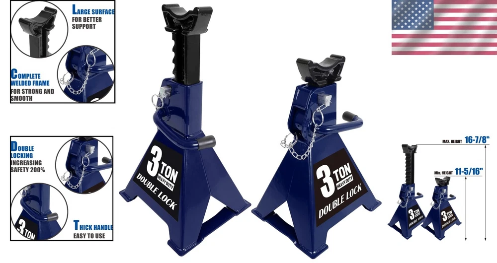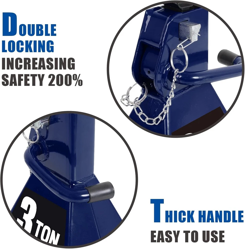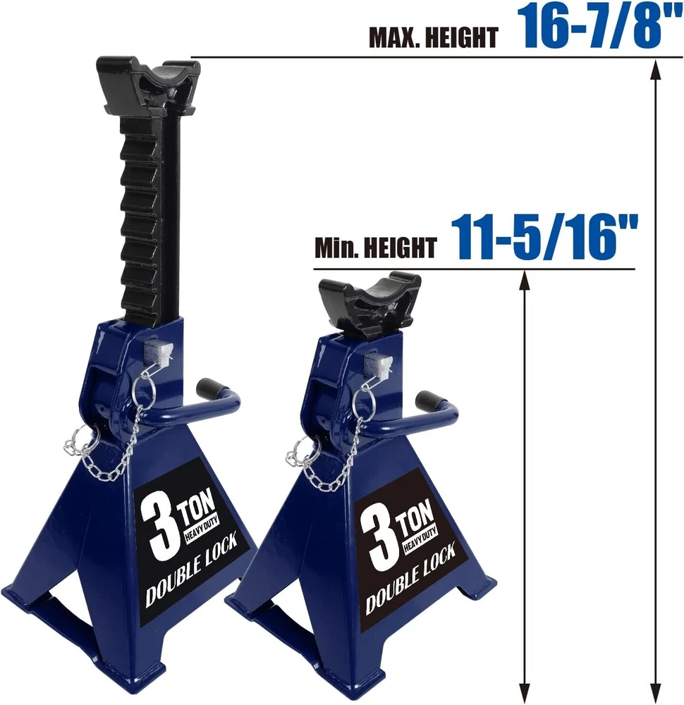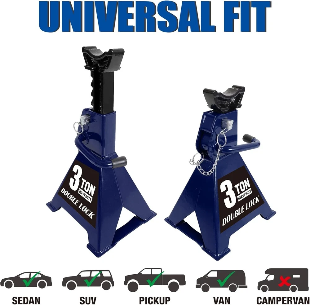 Load Capacity: 3 Ton Set or Single Item: Set Material Type: Alloy Steel Drive: Manual Capacity per Stand: 6000lbs. Vehicle Type: Passenger Vehicle, SUV, Light Duty Truck Style Name: Wide Base Item Weight: 16.3 Pounds Size: 3 Ton Item Dimensions L X W X H: 7.95 X 7.2 X 11.3 Inches gtin13: Does Not Apply Warranty: No Warranty Material: Steel Brand: Unbranded Color: Blue Item Dimensions: 7.95 X 7.2 X 11.3 Inches Number of Pieces: 2 UPC: Does Not Apply Compatible With Vehicle Type: Car Type: Jack Stands Style: Wide Base Maximum Lifting Height: 16.88 Inches Manufacturer Part Number: Jack Stands