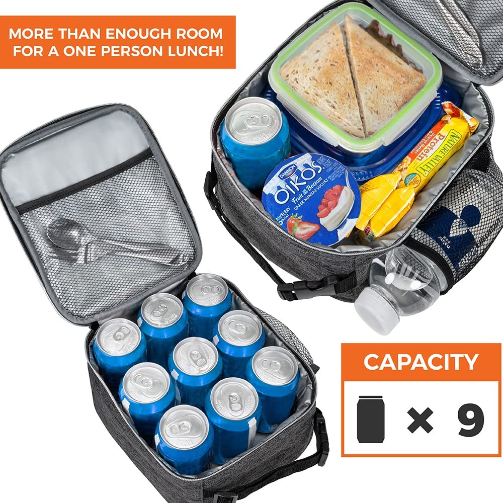 Premium Thermal Insulated Compact Lunch Bag by This durable, functional, and easy to use Premium Compact Lunch Bag by is perfect for taking food/snacks to school and for men and women to bring lunch to work or on the go. These lunch bags are lined with thermal insulated lining and are spacious enough to fit one persons lunch. Contains side pockets to carry extra items and a multi-functional strap with a buckle, making the lunch bag easy to carry. Measures at 10" x 8" x 3.7" (L x W x H) and is made from high-quality nylon and polyester fabric with reinforced zippers, ensuring maximum durability. creates quality products for your many lifestyles. Our Vision To provide premium kitchen and wine products that greatly simplifies your life. We will continue to innovate and bring exciting products to market so you can achieve more in life! Our Products At , we offer an extensive line of kitchen tools (such as salt & pepper mills), lunch bags, and wine bags/accessories made of highest quality for all occasions. Our products are meticulously designed with materials and functions that truly simplify your life so you can focus on creating your favorite meals or entertaining your guests. LUNCH BAG FOR KIDS: The insulated lunch box for boys girls is perfect for carrying food, snacks, lunch to school, office, work or picnic. With top handle buckle, the lunch pail lunchbag can hook onto your backpack or office bag, making it easy to carry and on the go. It also comes with side water bottle pocket and front pocket so you can conveniently store utensils and essential supplies. Small lunch cooler will meet all your childrens lunch and meal prep needs at school and classroom. INSULATED LUNCH BOX BAG: Our insulated leakproof lunch cooler keeps your food, salad, and drink hot or cold for hours so they will be at optimal temperature during lunch or dinner. The adult lunch pail lunchbox for women, men has soft thermal lining that is BPA and PVC Free and acts as an insulated protection to keep your food, bento, containers safe during travel. Lunch bag for kid boy girl is made with 600D polyester and reinforced zippers to keep stable temperature of lunch food. SMALL LUNCH BAG FOR MEN WOMEN: This compact lunch box is ideal for adults and professionals to take lunch to work and office. There is an inner mesh pocket to hold your utensils. Its small compact portable size also means the lunch bag can conveniently fit inside a backpack or office travel bag. This is the simple insulated lunch box for school, work, office, picnic, hiking, beach, and camping. CHARCOAL GREY SIMPLE LUNCH BOX KIT: This lunch bag comes in vibrant color that kids, boys, girls will love. Its functional design means this lunch bag is practical for school and work. It is a great back to school, birthday, and christmas gift, an ideal gift idea for on the go parents packing lunch for kids, children, and perfect lunchbox lunch bag for men women professional for taking lunch food to work. SAFE WORK LUNCH BAG TOTE: The small medium compact lunch bag is sized 10 x 8 x 3.7 inches (L x W x H) and can easily fit 6 cans or one persons lunch. The inside lining can be easily wiped clean with a damp cloth. Tested for safety, the lunch box passed CPSIA Lead, CSPA Phthalates & Cadmium Test - Manufacturer recommended age: Ages 3+.