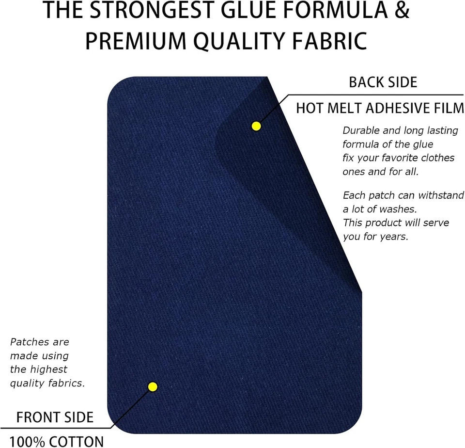 Package Includes: 6 iron-on fabric patches, size 3" by 4-1/4" (7.5 cm x 10.5 cm).Front side of the patches is cotton, rear side is covered with the strongest hot-melt adhesive film. Patches made in EU using high quality materials. Easy to operate: It will take only a few minutes to repair or decorate your outfit, as only an iron is required. Preheat your iron to the maximum, then place the patch on the desired spot and iron over the patch with pressure for 60 seconds. You don’t have to sew patch on or use further fabric glue, hot-melt adhesive film on each patch is very durable by itself. Money Saver: Repair crotch areas, knees, elbows, pockets etc. when it already has tears marks, or use the patches to prevent future problems.Place a patch inside of the garment on a weak spot before the problem transpires, prolong the life of your new clothes. Machine Washable: Applied patches are washable at high temperature; they can also be tumble dried on a high temperature setting. Even if applied patch starts to peel off after some time, simply re-iron the patch again.One patch can be re-ironed at least 3 times, even after washing. To prevent the felting off and curling up, pay special attention to the corners, butt areas and seams when applying the patches. CAUTION: Do not apply patches using hair straighteners or other heating objects, only use an iron. Carefully read the instructions of the fabric which you are going to repair, it has to withstand the highest temperature of an iron. Machine Washable Package Includes:6 iron-on fabric patches, size 3" by 4-1/4" (7.5 cm x 10.5 cm).Front side of the patches is cotton, rear side is covered with the strongest hot-melt adhesive film. Patches made in EU using high quality to operate: It will take only a few minutes to repair or decorate your outfit, as only an iron is required. Preheat your iron to the maximum, then place the patch on the desired spot and iron over the patch with pressure for 60 seconds. You don’t have to sew patch on or use further fabric glue, hot-melt adhesive film on each patch is very durable by itself.Money Saver: Repair crotch areas, knees, elbows, pockets etc. when it already has tears marks, or use the patches to prevent future problems.Place a patch inside of the garment on a weak spot before the problem transpires, prolong the life of your new clothes.Machine Washable: Applied patches are washable at high temperature; they can also be tumble dried on a high temperature setting. Even if applied patch starts to peel off after some time, simply re-iron the patch patch can be re-ironed at least 3 times, even after washing. To prevent the felting off and curling up, pay special attention to the corners, butt areas and seams when applying the patches.CAUTION: Do not apply patches using hair straighteners or other heating objects, only use an iron. Carefully read the instructions of the fabric which you are going to repair, it has to withstand the highest temperature of an iron. Machine Washable