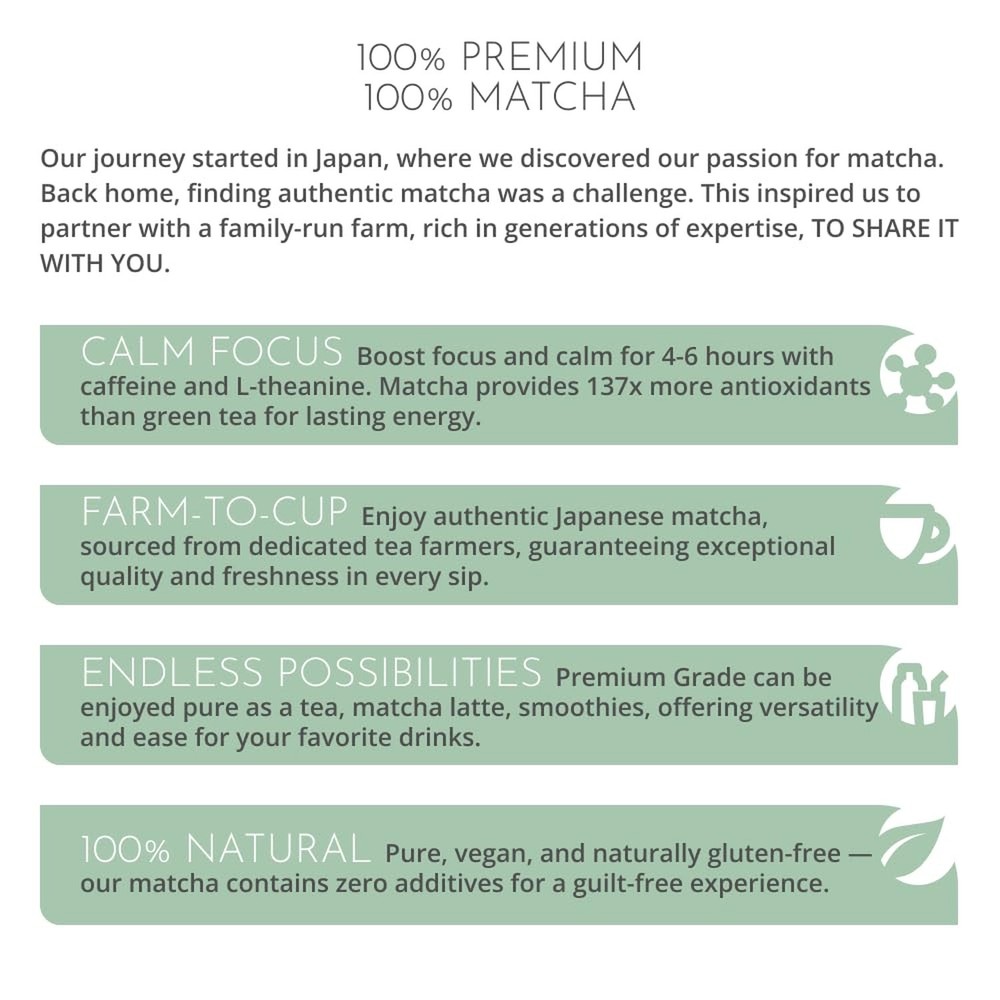 Matcha Powder, Premium Grade Japanese Matcha Tea, Grown in the Volcanic Soil of Kyushu, Farm to Cup Tea from Japan, 1.06oz Product Details Size: 1.06 Ounce (Pack of 1) Brand: Matcha Moments MPN: 820XNSHW93 EAN: 4260515770058 UPC: Does not apply Brand: Matcha Moments Item Form: Powder Flavor: Premium Grade Tea Variety: Matcha Unit Count: 1.06 Ounce Is Discontinued By Manufacturer : No Product Dimensions : 2.36 x 2.36 x 2.36 inches; 1.06 ounces Manufacturer : Matcha Moments Country of Origin : Japan Units : 1.06 Ounce Best Sellers Rank: #34,151 in Grocery & Gourmet Food (See Top 100 in Grocery & Gourmet Food) #205 in Matcha Tea #205 in Matcha Tea Customer Reviews: 4.3 4.3 out of 5 stars 2,271 ratings Calm Focus: With a unique combination of caffeine and L-theanine, matcha provides 4-6 hours of calm concentration. Consuming matcha means enjoying the entire ground tea leaf, with high levels of chlorophyll and antioxidants (137 times more than regular green tea) Farm-to-cup: Matcha tea often passes through many hands before reaching consumers. Our matcha comes directly from dedicated tea farmers in Japan who are passionate about their work. Enjoy It Pure or in Mixes: Premium Grade matcha is perfect for mixed drinks such as smoothies, protein shakes etc. but also delightful as a pure tea. 100% Natural: Our matcha powder is 100% pure Matcha tea.Nothing Added (vegan and naturally gluten-free)