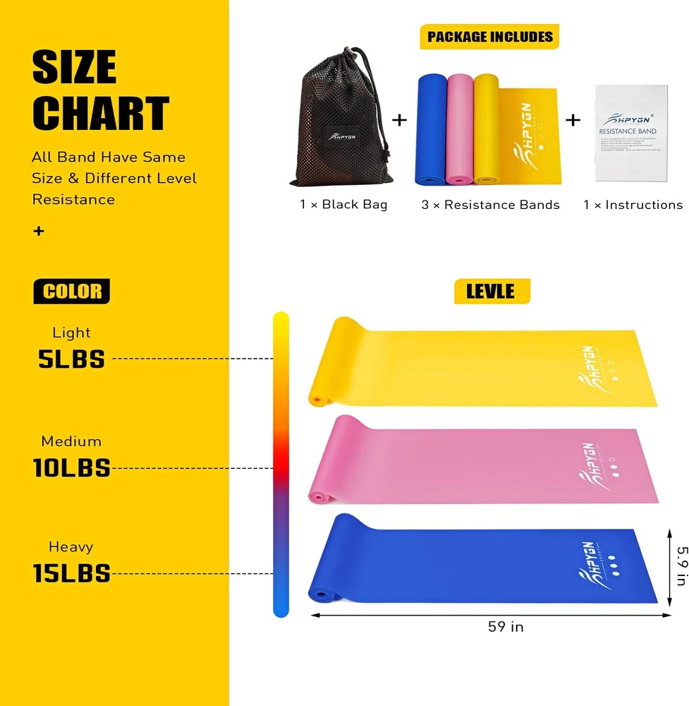 therapy bands Imported 2024 Upgrade Exercise Band: Each Physical Therapy Bands measures 4.9 foot long X 6 Inch wide.A superior band product for resistance training and rehabilitation, provides both positive and negative force on muscles and joints, stretches tones and conditions all major muscle groups. Our bands are scent free and latex free without a sticky surface, is ideal for conditioning & rehabbing muscles. Suitable for Many Exercises: People Love it Because it is exercise bands are ideal for assisting in Sports Athletes, Seniors, Physical Therapy, Rehabilitation, Wrestling, Bodybuilding, Pilates, Yoga, Kickboxing, Crossfit and so on. Simple yet effective workouts will increase strength & improve motion. Easy to Use & Carry: The resistance band set comes with a storage bag, easy to carry anywhere, in travel, home, gym, etc. Simple & easy to use product for upper & lower body exercises that can be performed anywhere, is ideal for conditioning & rehabbing muscles. Different Level of Resistance: The resistance bands for working out is divided into 3 different levels of resistance:Yellow band(Light, 0.35mm), Pink band(Medium, 0.45mm), Blue band(Heavy, 0.55mm).Never worry about the Physical Therapy Bands too hard, easily switch between the 3 levels to your preference anytime. Suitable Users: This physical therapy band is suitable for a wide range of individuals, including athletes, regular exercisers, the elderly, rehabilitation trainers. It can be utilized in various activities such as physical therapy, rehabilitation, wrestling, bodybuilding, Pilates, yoga, and more. Simple yet highly effective exercises with it can help build strength and accelerate recovery. Product Description Our latex-free reistance bands perfect for stretching the hip, quadsAbs, lose weight. body shaping, and work out the entire body. Effectively help you shape a beautiful figure and relieve the pressure. Top Choice of Physical Therapists Maximize Healing with Our Physical Therapy Training Aid Exercise Bands for Strength & Flexibility - Ideal for Seniors, Athletes, Injury Recovery (MCL/ACL, Knee Surgery, Bone Repairs) & Maternity Fitness Latex-Free Resistance Bands for Full-Body Workouts - Tone Hips, Quads & Abs, Lose Weight, Improve Strength & Mobility, Alleviate Joint Pain Resistance Bands for Yoga & Pilates - Portable, Multi-Dimensional Elastic Bands for Strength Training, Versatile Workout Gear, Space-Saving Muscle Building Alternative to Free Weights Improve Flexibility for Seniors Improve the functional ability of older adults, and aid in treating many chronic diseases Improve Balance Ability Can effectively improve children's balance ability and develop better posture habits Prenatal Aid for Pregnant Women Relieve stress, improve discomfort symptoms during pregnancy, and help smooth delivery in the future Resistance Training It can effectively shape the body shape and is very suitable for dancers and athletes Ideal Gift for Family and Friend Buying resistance band for oneself, parents, loved ones, and friends is the beginning of a surprise 1 Older Adults 2 Child 3 Pregnant Women 4 Adult 5 Perfect Workout Gift Elevate Your Fitness Game with the Ultimate Resistance Band Set: Your Ideal Companion for Full-Body Workouts, Anytime, Anywhere! Latex-Sensitive User Friendly Exercise bands are made of TPE, skin-friendly, latex-free, perfect for those with latex allergies or sensitivities. Simple & easy Simple & easy to use product for upper & lower body exercises that can be performed anywhere, is ideal for conditioning & rehabbing muscles. Improve Flexibility for Older A superior band product for resistance training and rehabilitation, improves athletic performance, and It can be used for warm-up and much more. Portable Carrying Bag Workout bands Portable carry case makes it very easy for you to take it anywhere, making them ideal for travelling or a busy life Envision working out at the beach, on a campsite, or in a park, breaking free from the gym's walls. Exciting, right? Plus, when traveling makes hitting the gym tough, this resistance band is your go-to for a workout in your hotel room or at home. It's small, light, and just as effective Explore Other Great Products from HPYGN Add to Cart Add to Cart Add to Cart Add to Cart Add to Cart Customer Reviews 4.3 out of 5 stars 1,187 4.5 out of 5 stars 2,815 4.7 out of 5 stars 338 4.7 out of 5 stars 270 4.7 out of 5 stars 270 Price $13.97 $ 13 . 97 $19.97 $ 19 . 97 $8.99 $ 8 . 99 $7.17 $ 7 . 17 $7.17 $ 7 . 17 Standard Use Leg Butt Training Workout Muscle Training aide Arm & exercise aide Workout Attachment Workout Attachment Perfect For Flexibility, rehab & fitness Stretching, rehab & exercise Cable Handles Gym Equipment Home-Gym Works Perfectly Home-Gym Works Perfectly Targeted Body Part Lower body Full body Upper body Full body Full body Multi-Use Tool ✔ ✔ ✔ ✔ ✔ Professional Quality ✔ ✔ ✔ ✔ ✔