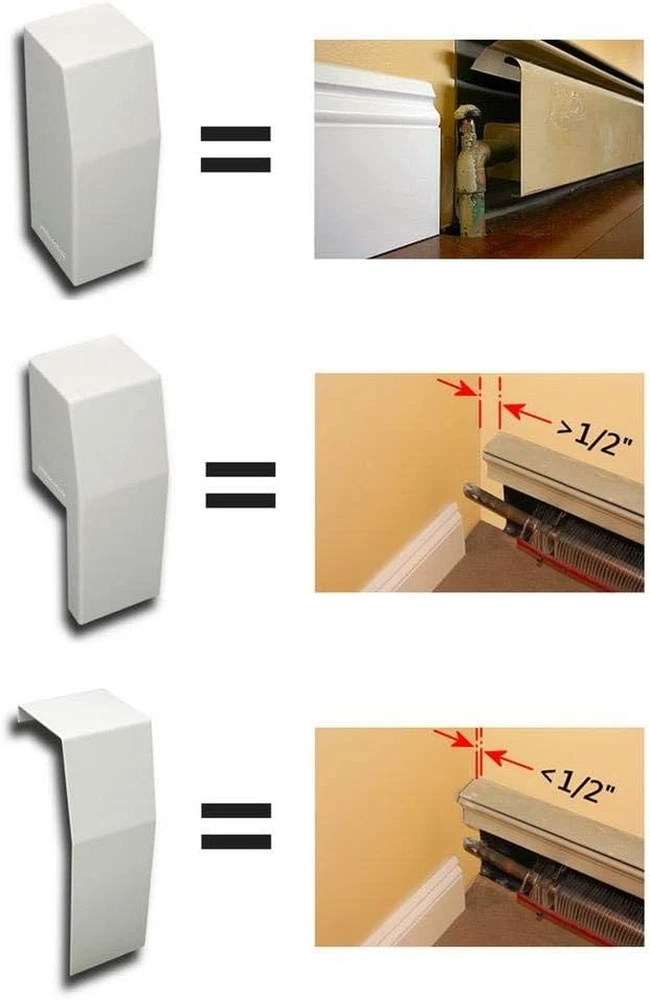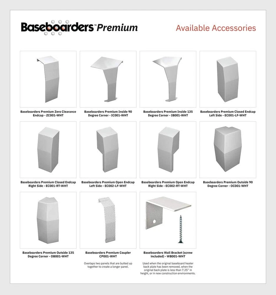 Store New Arrivals Add to Favorite View Feedback Contact Premium Series Left Closed Endcap Accessory - Galvanized Steel Easy Slip-On Baseboard Heater Accessory for Covers [Cover Sold Separately] Description Item model number EC001-LF-WHT Part Number EC001-LF-WHT Power Source corded electric Size Name Accessory Color Left Closed Endcap Material Galvanized Steel Size Accessory π LEFT CLOSED ENDCAP ACCCESSORY: For use with our premium baseboard heater covers. Perfect for finishing the premium asthetic on the left side of the cover. Comes as part of the L&R Bundle Kit. π PREMIUM SERIES IS PERFECT IN BATHROOMS: The premium series comes with a against rust, and is perfect in humid rooms like bathrooms. The Premium Series provides a clean and modern aesthetic at the right price. π PREMIUM COVERS AND ACCESSORIES: Baseboarders Premium Series covers and all accessories are only compatible with our own branded Premium Series products. By using only our branded products we ensure the best fit, and safety π HIGH QUALITY GALVANIZED STEEL: All Baseboarders products use galvanized steel with a powder coated semi-gloss white finish. Panels are fabricated with 22 gauge galvanized steel and end caps with 18 gauge galvanized steel. Premium panel holes are 1/8 inch in diameter to allow proper airflow π EASY INSTALLATION: Our easy slip-on installation covers work for both hydronic and electric baseboard heaters. Electric baseboard heaters tend to operate at higher surface temperaturs so the surface may be hot to the touch when in use. Product Description Breathe New Life Into Your Old, Dented and Rusted Baseboard Heaters With Our Simple, Easy-to-Install Baseboarders Premium Series Steel Covers Amazingly Durable Each Baseboarders Premium panel and accessory is made of hiqh quality steel , is professionally powder-coated and is warrantied not to rust . Designed with Safety In Mind Single piece panel construction ensures proper airflow around the heating element while prohibiting direct access to it, making it safer for children and pets . Easy Slip-on Installation Installation is an easy DIY project, requiring no tools or hired help. Simply remove the existing baseboard heater endcaps and front cover panel, snap your new Baseboarders Endcaps onto your Baseboarders panel, position the Baseboarders assembly onto the original back plate & push down firmly into place, that's it β you're done! Baseboarders Premium Series Provides a Clean and Modern Aesthetic - Our Most Versatile and Popular Product Line Baseboarders Premium Series...Designed for Form and Function 2', 3', 4', 5', 6' & 7' standard panel lengths ( 6.75'' H x 3'' D) Made with high quality rust resistant galvanized steel Powder coated semi-gloss white finish Panels can be custom cut for shorter lengths with tin snips The Premium Series offers the most flexibility and will solve most installation challenges. It is available in every common panel length and every accessory you may need. Baseboarders Premium provides a clean, modern aesthetic at the right value. Accessories include open Endcaps, Zero Clearance Endcaps, Inside Corners, and Outside Corners. Look For These Baseboarders Premium Series Accessories Premium Open Left and RightEndcap (EC002-LF-WHT, EC002-RT-WHT) Premium Closed Right and Left Endcap (EC001-RT-WHT, EC001-LF-WHT) Premium Coupler (CP001-WHT) Premium Zero Clearance Endcap (ZC001-WHT) Premium Inside and Outside 90 Corner (IC001-WH, OC001-WHT) Premium Inside and Outside 135 Corner (IB001-WHT, OB001-WHT) Wall Brackets (WB001-WHT) Note: Only Baseboarders brand Premium accessories fit Premium panels. Retrofitting Guide to Ensure Proper Fit / Measuring for Length and Layout STEP 1: Remove one endcap and the front panel. Measure between the floor and the top of the heater. Objective: 7.5" or greater If less than 7.5" use the Wall Brackets (WB001) for mounting. This will bring the height up by a minimum of 1.25". STEP 2: Measure from the bottom of the heating element to the top of the heater. Objective: Between 5β³ and 6.75β³ If less than 5β³ use the Wall Brackets (WB001) for mounting. If the distance is greater than 6.75β³, the Premium TALL profile should be used. STEP 3: Measure from the outside face of the finned tube heating element to the back plate. Objective: Less than 3.25β³ If larger 4β³ x 4β³ or 4β³ x 6β³ commercial style element is in place, a wood molding will solve the depth issue. STEP 4: Measure for length and layout There is no need for fractional or perfect measurements. Each endcap can offer up to 1.75" for a total of 3.5" when using an endcap at both ends of the panel. Standard straight lengths are measured from end to end using the original back plate. If a straight section is missing the back plate, measure from one extreme end of desired coverage to the other extreme end of coverage. Then subtract 1β³. This is the ideal panel length. Baseboard heaters longer than 6β² will require the use of multiple panels and couplers to register the ends together. Example: 8β² = Two 4β² panels and a Baseboarders Basic Coupler to connect them. If Inside Corners are required, panel lengths can be determined by: a. Removing endcaps, b. Measuring side 1 from pipe to corner, c. Subtract 3'' for depth of the adjacent cover, d. Repeat with side 2. ABOUT US We offer the best prices around on high quality products. Our E-store includes media such as books, movies, music and games while offering electronics, toys, sporting apparel, clothing, tools, general home, garden items and more. SHIPPING We are always working hard to ensure your package arrives as soon as possible. Please understand that some factors like weather, high postal traffic, and the performance of shipping companies are outside of our control. We offer free shipping to the lower 48 states and ship within 2 business days of payment, usually sooner. We do not accept P.O. Boxes. Please provide a physical address. For shipping outside of the continental 