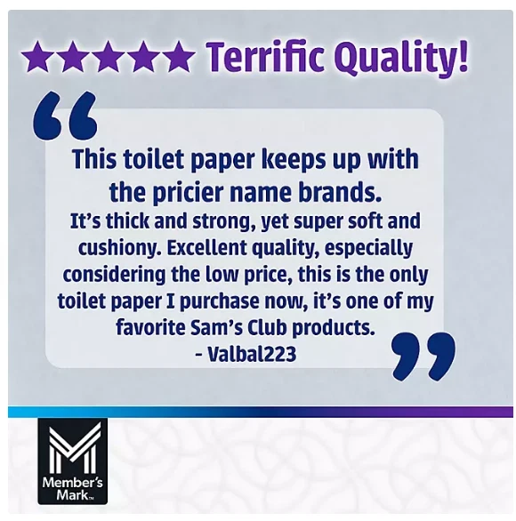 Dominate Deals Welcome to Dominant Deals! Explore amazing products at unbeatable prices. If you need any help, we're here for you. Happy shopping! HIGHLIGHTS Package contains 45 rolls, 235 sheets/roll Total sheets 10,575 Superior softness with the strength you need 2-ply sheets produce less lint and are tested septic safe 45 large rolls = 1,254 sq. ft. total PRODUCT OVERVIEW Get a comfortable, confident clean with Member's Mark Ultra Premium Bath Tissue, 2-Ply Large Roll (235 sheets, 45 rolls). Member's Mark bath tissue is soft, strong and incredibly absorbent, with more sheets per roll than other leading brands. How Does Member's Mark Ultra Premium Bath Tissue Compare to Leading Brands? Member's Mark Ultra Premium bath tissue is crafted with superior softness, comparable to other leading brands, with the strength you need for a confident clean. Unlike the leading brands, Member's Mark bath tissue produces less lint and gives you substantially more sheets per roll. With 235 sheets per roll, you can use fewer sheets. The soft bath tissue is also backed by Member's Mark 100% satisfaction guarantee; if for any reason you're unsatisfied, we'll refund or replace your purchase. Is the Ultra Premium Bath Tissue Safe for Older Septic Systems? Member's Mark bath tissue is rigorously tested to ensure that it's safe for all septic systems. Each roll has more sheets, so you use less product, helping septic systems break down the bath tissue more efficiently. Soft Bath Tissue That Lasts Member's Mark bath tissue doesn't just give you more per roll. The premium bath tissue comes in a large, 45-roll count for 1,254 square feet of bath tissue, even more value than the leading brands.3 SHIPPING GUIDELINES We offer FREE shipping on all orders! Items are usually dispatched within 3-4 business days of payment, with delivery typically taking 3-5 business days after shipment. If your item is lost or there's an unexpected shipping delay, please reach out to us and we?ll assist you with a refund. RETURN GUIDELINES Customers can return the product within 30 days of purchase if they?re not fully satisfied. The item must be returned in its original packaging, and the customer is responsible for return shipping costs. THANK YOU H
