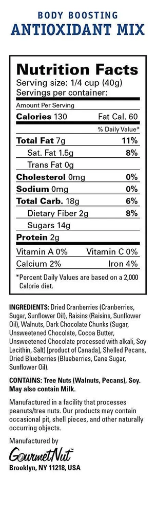 your day with our Antioxidant Trail Mix – a carefully crafted and thoughtfully sourced blend of the freshest pecans, walnuts, dark chocolate, raisins, blueberries, and cranberries. Each mix is made in small batches so you can feel confident about fueling your body with the best ingredients Mother Nature has to offer. Elevate your snacking experience with America's fastest-growing premium trail mix, and take your taste buds on an adventure with our wholesome, better-for-you mixes. PREMIUM INGREDIENTS - We are a trail mix first company, so that means we carefully source the highest quality ingredients that go into each mix. To make our Antioxidant Trail Mix extra delicious, we combine only the best whole pieces of pecans, plump cranberries, crunchy walnuts, sweet raisins, ripe blueberries and decadent dark chocolate for our Antioxidant Trail Mix. ONLY THE GOOD STUFF - Non-GMO Project Verified, No artificial Ingredients, Gluten Free, Vegan, Certified . Our trail mixes do not contain any sulfites or other preservatives. OUR BENEFIT TO YOU - Our trail mix is the perfect healthy snack packed with antioxidants, so you can feel good about what you're eating. Wholesome, simple ingredients make this mix the perfect way to indulge without the guilt! YOUR DAY - Whether you're on-the-go or staying in, makes snacking easy, delicious, and healthy! With a flavor for every mood, our mixes are great in yogurt, salad, or by the fistful. FOR YOUR INFORMATION - Manufactured in a facility that processes peanuts/tree nuts. Our products may contain the occasional pit, shell piece, or other naturally occurring objects.