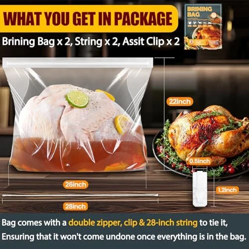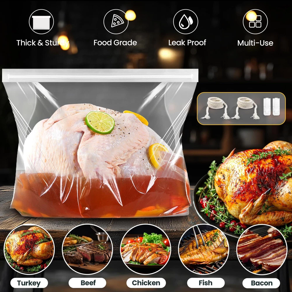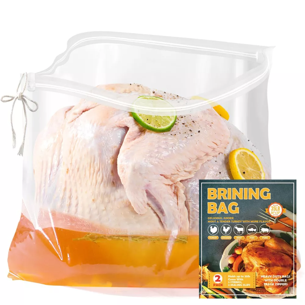 LEAK-PROOF SEAL: Still struggling to brine a delicious turkey? SCHVUBENR turkey brine bags feature a reinforced double-zipper closure for a secure, leak-proof seal. With 2 cotton strings and 2 sealing clips included, you can confidently brine your turkey without spills or messes. HEAVY-DUTY & DURABLE: Made from high-quality, BPA-free materials PA+PET, our brining bags are designed for durability. At 140 microns thick, our sturdy bags can handle large turkeys and brine solutions without tearing or leaking, offering a dependable brining experience. EXTRA LARGE CAPACITY: With dimensions of 26" x 22", our extra-large turkey brine bags can fit/hold turkey up to 35~40 pounds. The spacious, gusseted bottom ensures stability and ample room for both turkey and brine, perfect for Thanksgiving or holiday feasts! EASY TO USE & MESS-FREE: Simply place your turkey in the bag, add brine, squeeze out the air, and seal with the provided strings or clips. Then store in the fridge for a clean, hassle-free brining process without mess! MULTIPURPOSE USE: Ideal for more than just turkey, our brine bags are great for marinating and brining a variety of meats like chicken, pork, and beef. They ensure flavorful, well-seasoned results every time. Note: These are for brining only, not cooking. Contact us within 24 hours if you need assistance.