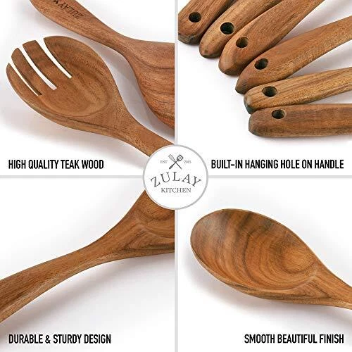 Return Policy Fast Delivery Trusted seller Premium Wooden Utensils For Cooking - 6 Pc Set Non-Stick Soft Comfortable Grip Wooden Cooking Utensils - Smooth Finish Teak Wooden Spoon Sets For Cooking Product Description Top Notch Craftsmanship: Assemble your kitchen with high-quality wooden utensils that serve the purpose for most cooking needs. These 6 piece utensil set include a salad spoon, salad fork, serving spoon, skimmer, spatula, and turner. Classic and elegant with a good assortment of practical sizes that are shaped perfectly for their own functionality. A very attractive addition that will bring class and sophistication to your kitchen. Does Not Scratch Precious Cookware: The Zulay Wooden Cooking Utensil Set is made of premium quality Teak wood, close-grained hardwood with high organic oil, and silica content that is known for being one of the hardest, strongest, and most durable of all timbers. Beautifully crafted, soft to touch, lightweight, and very solid basically defines what great workmanship is. Now you can use your precious non-stick cookware without worrying about damages and scratches. Easy To Clean, Easy To Store: Outstanding quality that will definitely last! Teak wood is particularly valued for its durability and water resistance. It is recommended to give them a quick thorough rinse, wash with a soapy cloth, and then either hang dry, or dry in an upright position. They’re coated and well polished with a clear lacquer which is good for retaining its beautiful gloss. Comes with a hanging hole on each end for easy carriage and storage. Great Gift For Cooking Enthusiasts: Beautifully crafted from teak wood wooden utensils gives an aesthetically pleg ambiance to any kitchen. Great gift idea for housewarming, birthday, Christmas, thanksgiving. Perfect for loved ones that like to cook, chefs, or even for your own personal use. A perfect tool for freshening up or starting up your very own kitchen. No Hassle, Kitchen Happiness Zulay Guarantee: We love and take pride in our Wooden Cooking Utensil Set and we back this up with a . Have the confidence that this product will last, if t are ever any issues, just contact us and we will make it right. Order now and be assured that this product will live up to your expectations, d. If it does not, we got you covered. Chances are, you will never need to reach out! Shipping Returns Payment Shipping Shipping is FREE to all addresses other than APO/PO boxes in the lower 48 states. All our stock ships from US-based warehouses. Shipped via USPS or UPS (depending on location and package weight) Unless stated otherwise, all orders will ship within 24-72 hours of your payment being processed. Check our feedback to see the great reviews of FAST shipping we offer. Returns Seller does not accept returns Payment We currently accept payment via eBay managed payments only. Once payment is cleared, we will dispatch your shipment within 1-3 business days. Please refer to the "Shipping" tab for more information regarding shipping speed to your destination.