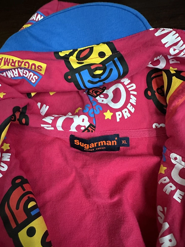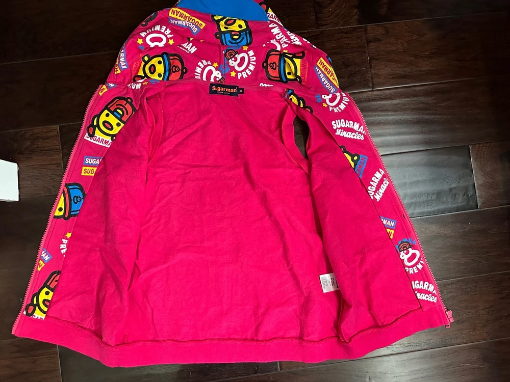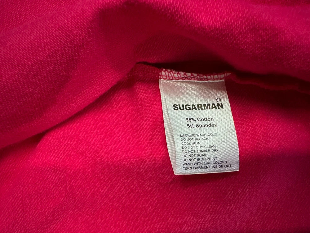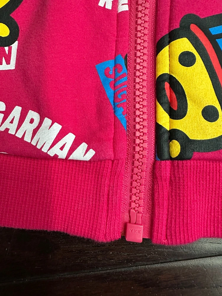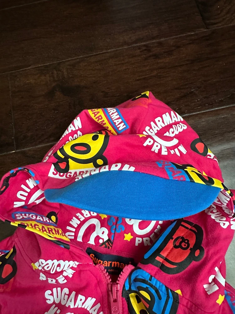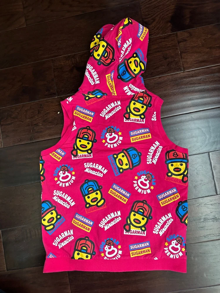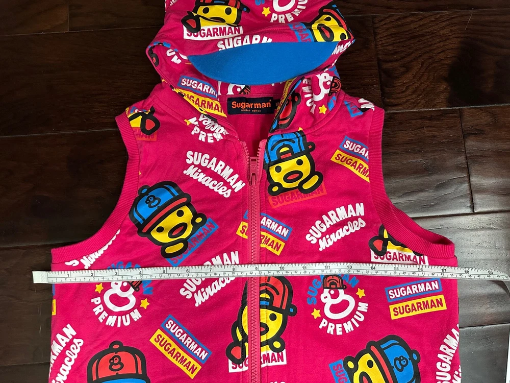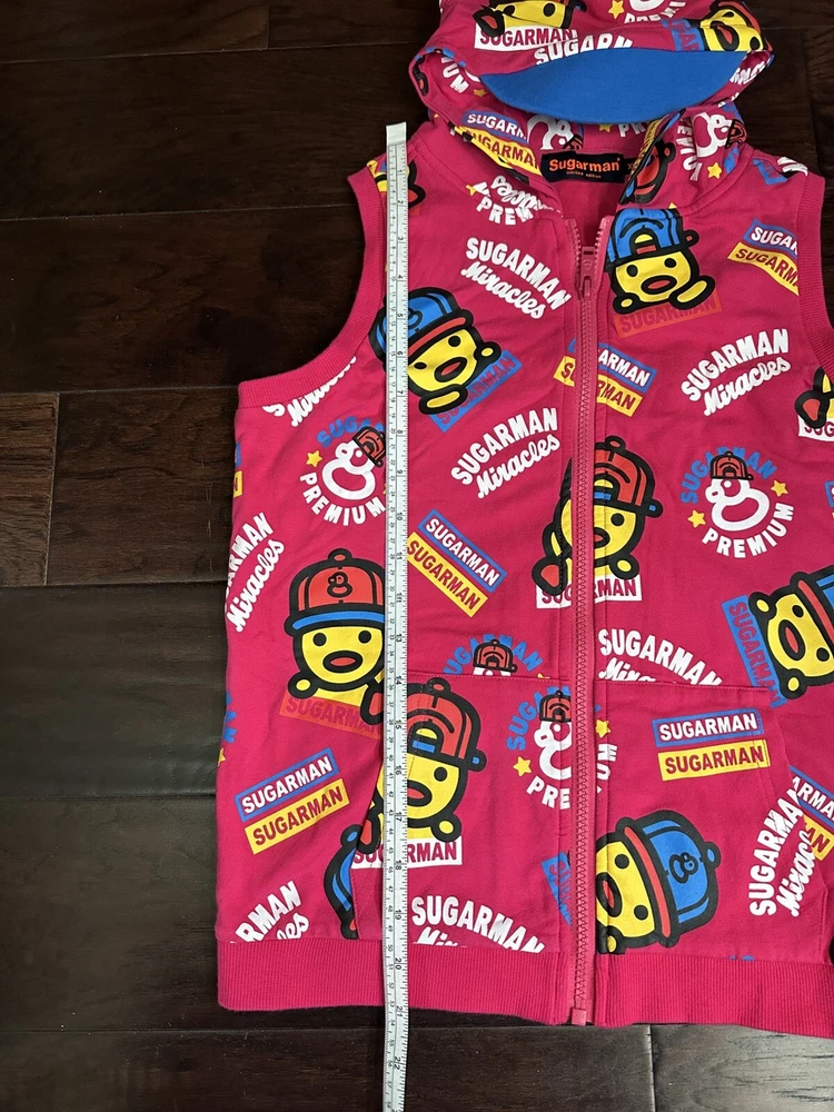 This limited edition Pink Hoodie Vest by Kid Sugarman is a must-have for any stylish young girl. The sleeveless design and full zip closure make it perfect for layering over any outfit. The XL size and duck figure detail add a touch of fun to this trendy piece. Made from a blend of polyester and cotton, the fabric is soft and comfortable, with a spandex base for added stretch. The 95% cotton and 5% spandex fabric type ensures a durable and long-lasting garment. It has a little stain at the bottom of the front vest, it is barely visible . Overall it is in a good condition.