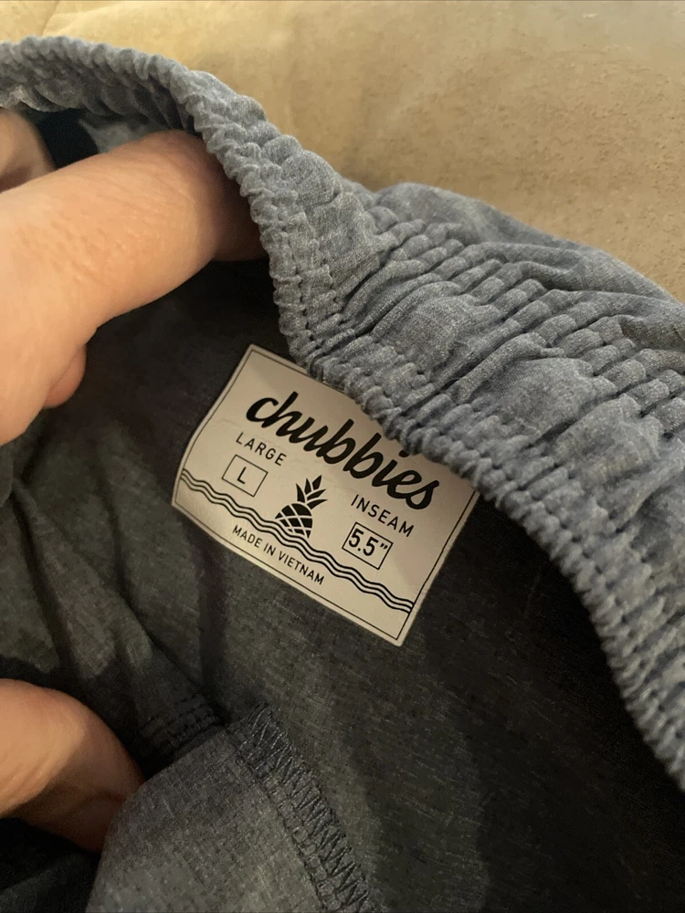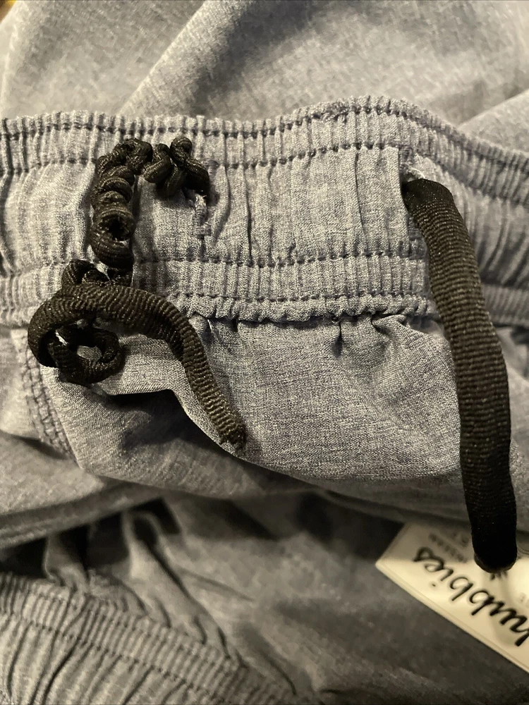 Preowned. Elastic waist with drawstring. Drawstring is a bit twisted but still functional (see pic). 5.5” inseam. They are bluish gray in color. Comes from smoke free, pet friendly (cat) home. Please pay close attention to all pictures as they are part of the description. Sold as you see pictured. No returns or refunds. 86% polyester, 14% elasthanne.