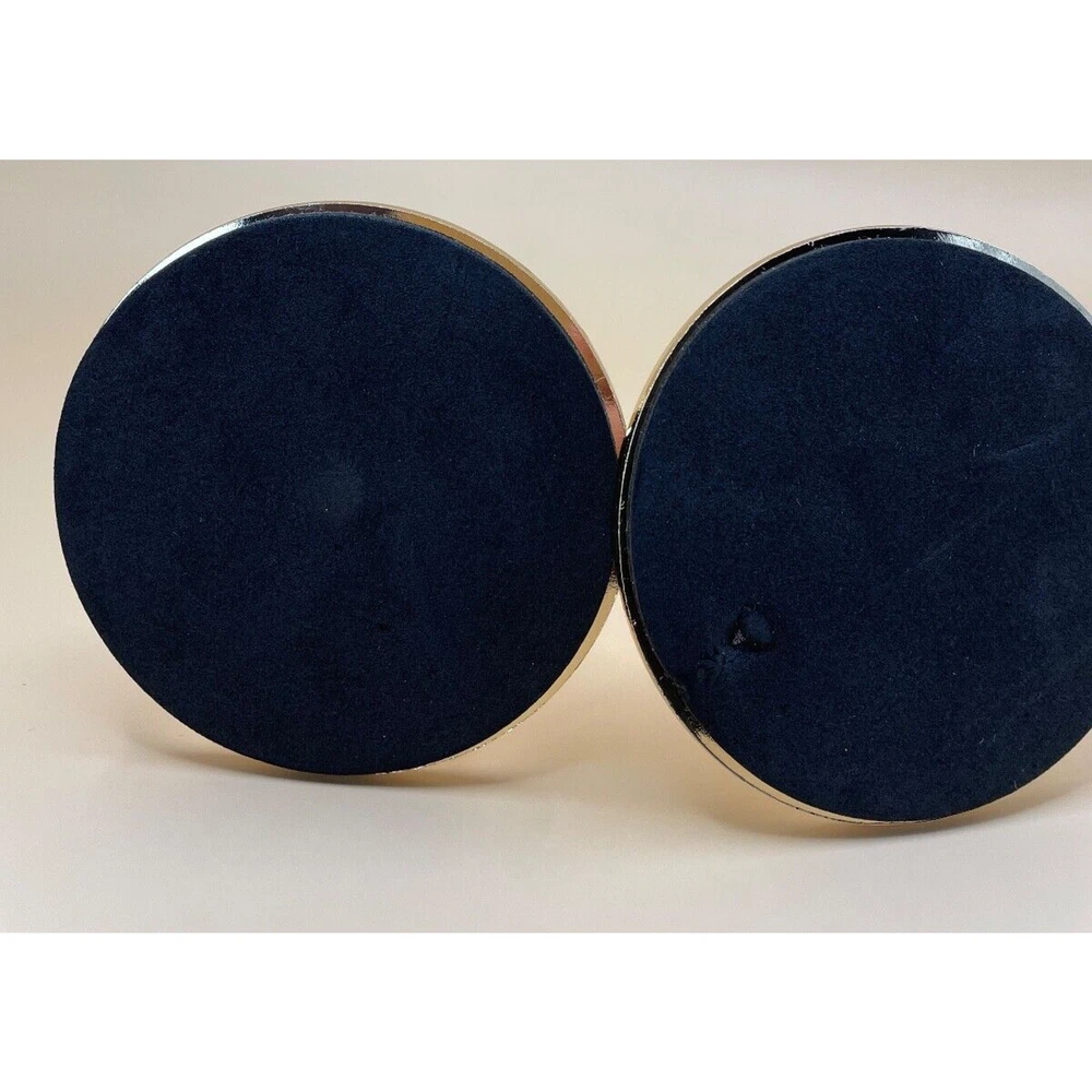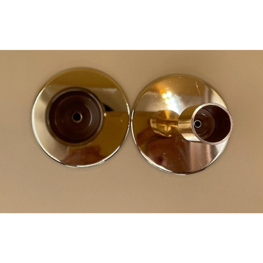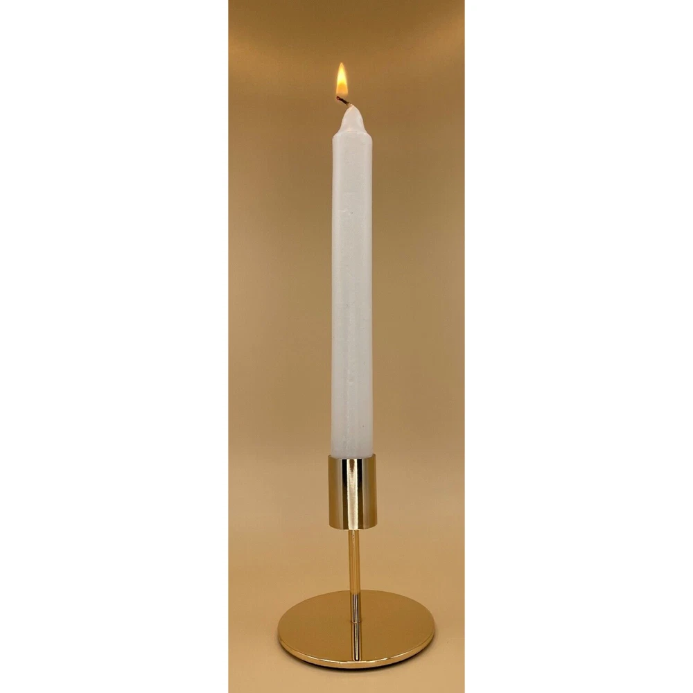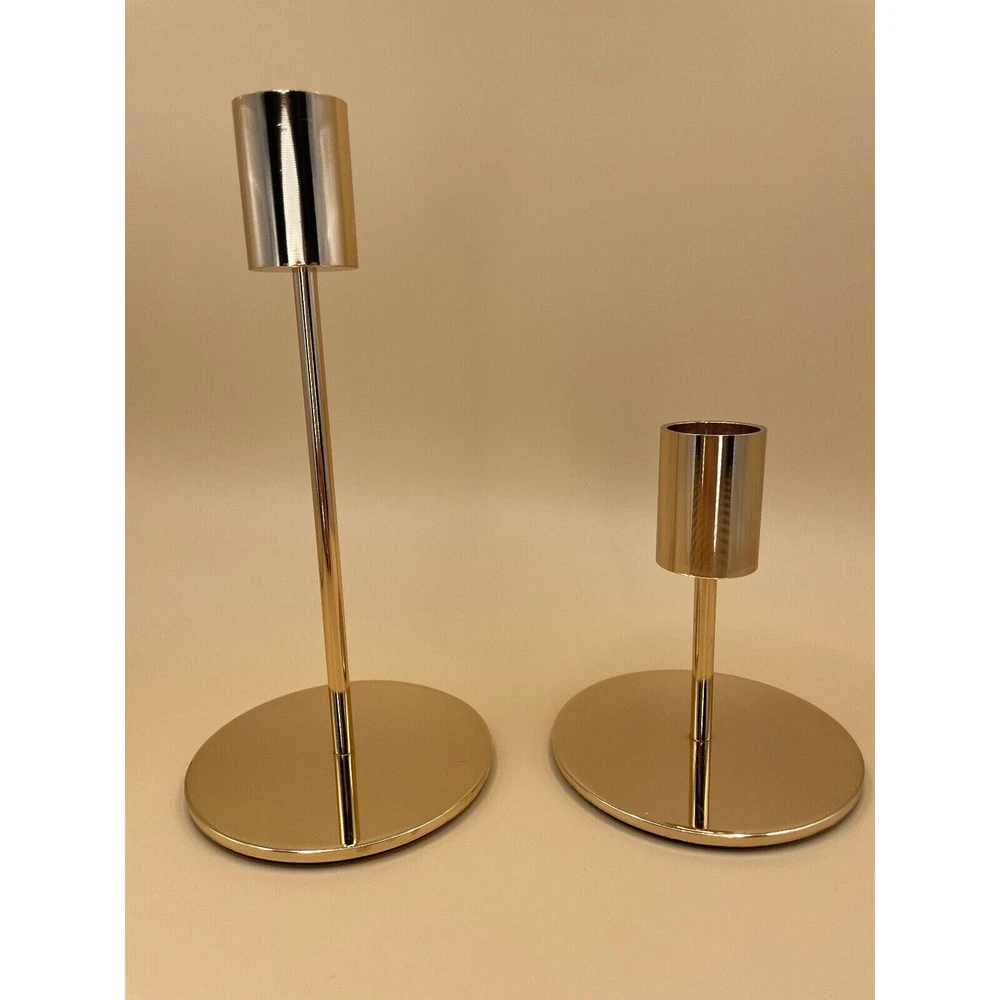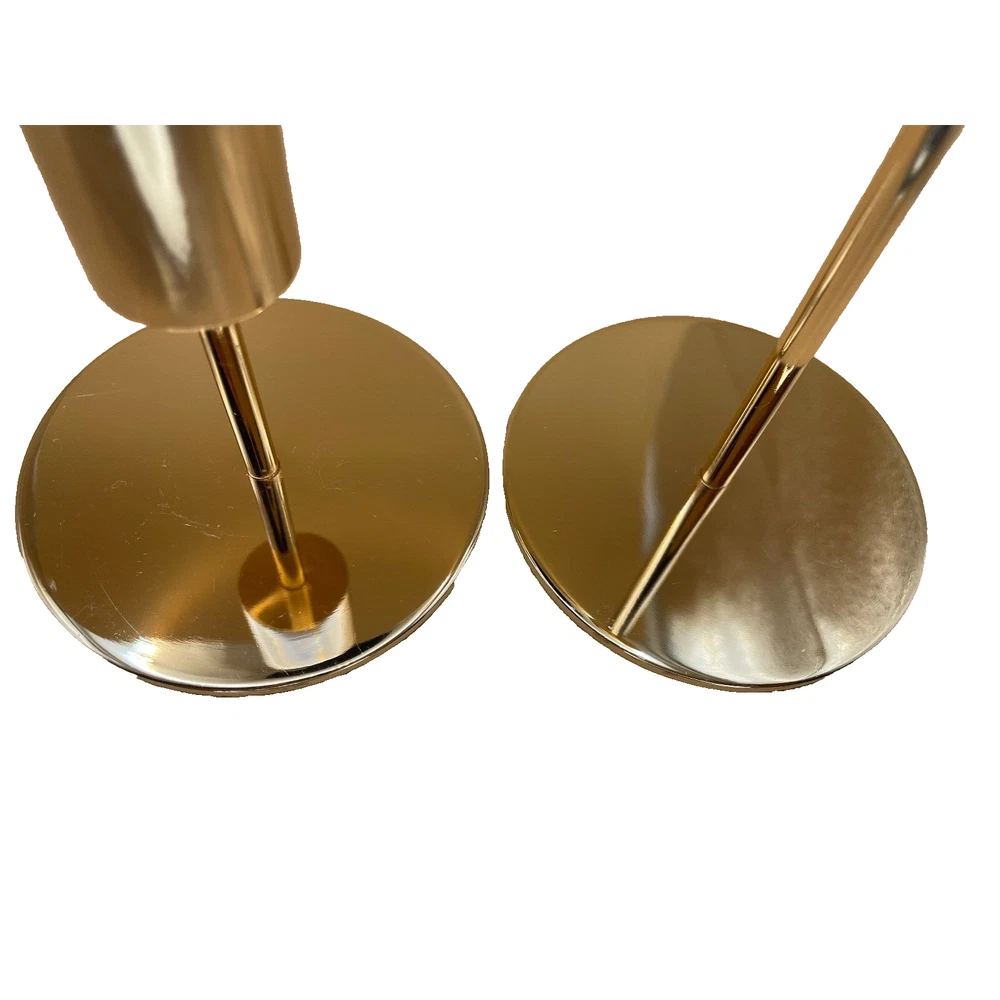 Elevate your candle game with this pre-owned gold taper candle holder set of two! Crafted from sturdy metal, these candle holders are perfect for creating a romantic and luxurious vibe in any room. The round shape and anti-slip feature ensure that your candles stay in place while adding a touch of elegance to your decor. These candle holders are suitable for taper/dinner candles and come in two different sizes (4.5" and 6.5" in height). The decorative metal base and minimalist design make them a perfect fit for any room, whether it's your living room, bedroom, dining room, kitchen, entryway or foyer. This candle holder set weighs 10 oz together and requires no additional parts. Clean with a damp cloth for easy maintenance. This minimalistic candle holders are in good pre-owned condition. Please do notice there are some scratches but very minimal and there is a tiny unnoticeable hole on the back. Please refer to pictures.