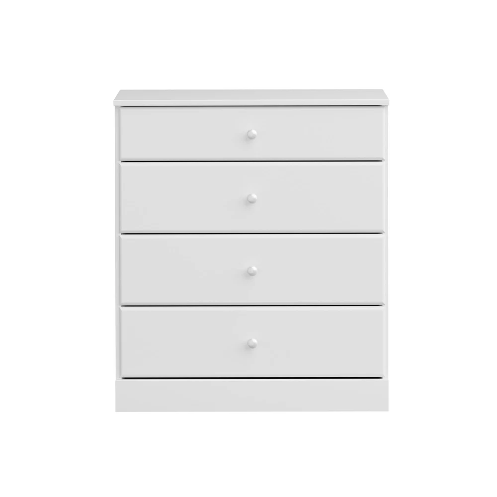 Add a classic, simple, storage solution to your bedroom with the Prepac Astrid 4-Drawer Chest. It's contemporary design and clean lines will complement any decor. Profiled drawer fronts and solid wood knobs help provide a timeless look. Use on its own or pair it with other matching pieces from the Astrid Collection. Constructed from non-toxic, CARB-2 compliant, laminated composite woods with a sturdy MDF backer. Ships Ready to Assemble, includes an instruction booklet for easy assembly. TIMELESS DRAWER DRESSER: Features 4 total full-size drawers as storage space while the profiled top, profiled drawer fronts, solid wood knobs, sleek black laminate finish and simple design complements existing décor VERSATILE STORAGE: Great for bedrooms, closets, living rooms, or as an entry table, and the spacious top can be used to display lamps, electronics, photos, jewelry boxes, and more MANUFACTURED IN NORTH AMERICA: Made from non-toxic, CARB-2 compliant laminated composite wood with a sturdy back panel, sturdy acrylic knobs, and drawers that run on smooth roller glides with built-in safety stops EASY ASSEMBLY: Durable high-quality drawer dresser ships flat-packed and can be assembled in 2 hours or less with the combined effort of two people, and includes an instructional booklet SPACE-SAVER: Assembled dresser measures 18.25" D x 30" W x 34" H to fit a room comfortably, and each drawer measures 12.75" D x 26.5" W x 4.5" H to store a variety of items