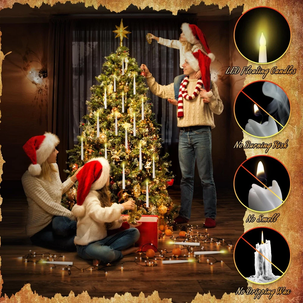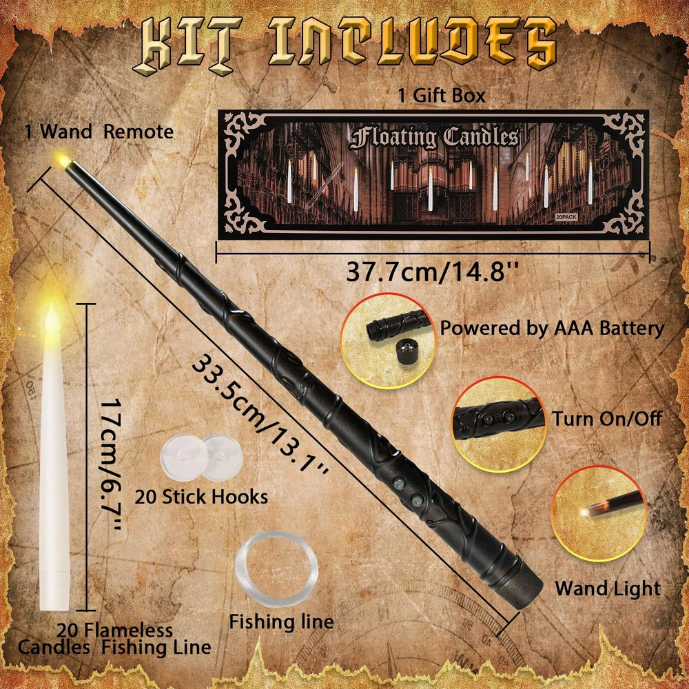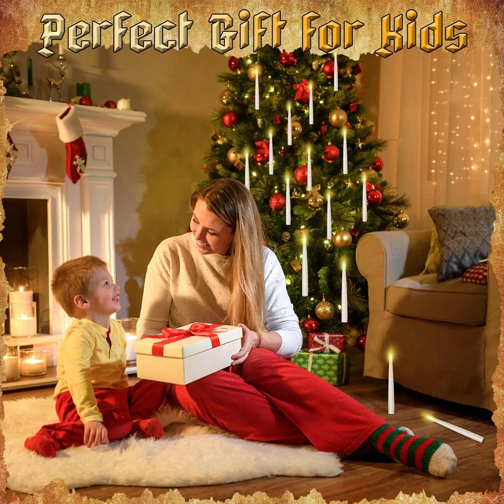 ENTER THE WORLD OF MAGIC - These 12 PCS of magic floating candles measure 0.6" (D) x 6.6" (H), have 20 hooks, and a 13" magic wand remote control that allows you to control the candles with a touch of fun and fantasy. Use your children's imagination to light Halloween candles with spells and hone their wand skills while competing to be the most powerful wizard. SAFE FLOATING CANDLES - Floating candles with wand use advanced 3D flickering technology that perfectly simulates the jumping and flickering of real flames. No need to worry about the risk of starting a fire or melting candles, this Halloween candle is perfect for families with pets and children, allowing you to enjoy the warm light while keeping your family safe. Powered by AAA batteries, they are decorative and more environmentally friendly. EASY HANGING DESIGN - Each candles comes pre-attached with string, making the installation easy. Simply tie the fishing line to the hook and attach the hook to the ceiling to hang the candles straight and evenly, our hanging candles can easily create a magical levitation visual effect on ceilings, walls, porches, shelves, or tables anywhere. Whether candles for holiday decorations or everyday accents. HALLOWEEN DECOR - Floating candles light up at parties, on porches, and in living rooms to add a touch of glamour to your home decor, parties, weddings, or any special occasion. Fixed on windows, walls or cabinets, perfect for holiday decorations, church services, window candles, fireplaces, tables, and home and outdoor decorations for room decorations. Halloween candles create a warm, comfortable living environment for you. EXCLUSIVE MAGICAL EXPERIENCE - This set of floating candles with remote is designed for magic lovers, suitable for Potter fans or curious children and adults about the magical world, whether it's the mystery of Halloween, cozy Christmas, celebrating birthdays or hosting a movie-themed party, these floating candles are the ideal gift for them. A unique magical experience for your loved ones, this flameless candle is a tribute to the Harry Potter series.