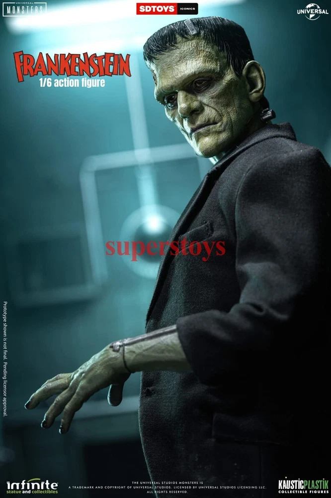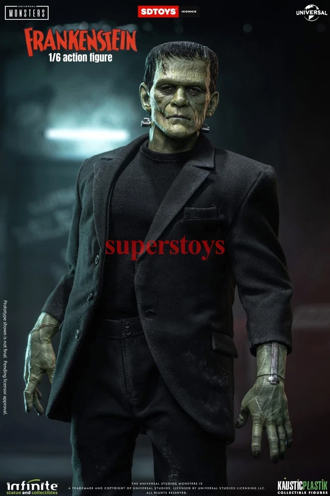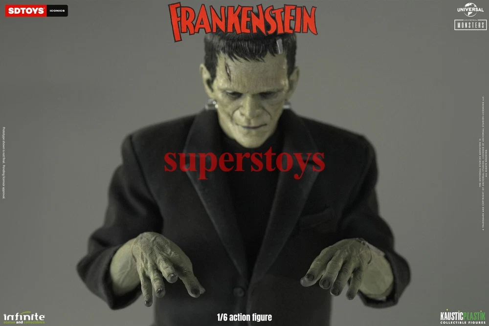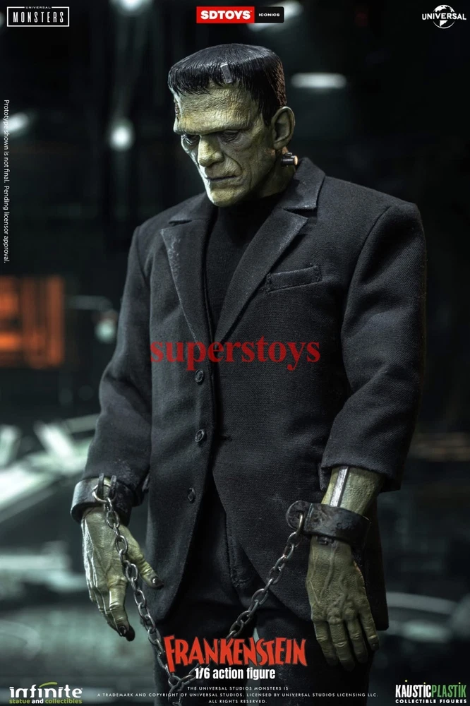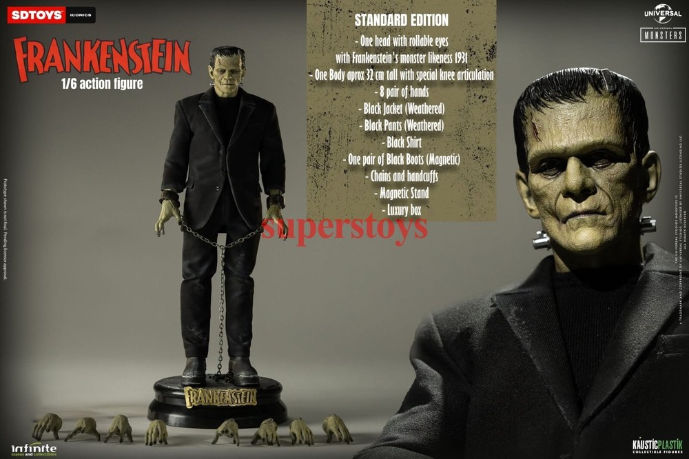 NOTE: This is a Presale Item Full payment is required for this presale. The release date automatically predicted by the eBay system is inaccurate, for more information about presale rules and item release dates, please feel free to contact me! Feel free to reach out if you have any other questions!!! Packing List: - One head with rollable eyes with Frankenstein's monster likeness 1931 - One Body aprox 32 cm tall with special knee articulation - 8 pair of hands - Black Jacket (Weathered) - Black Pants (Weathered) - Black Shirt - One pair of Black Boots (Magnetic) - Chains and handcuffs - Magnetic Stand - Luxury box