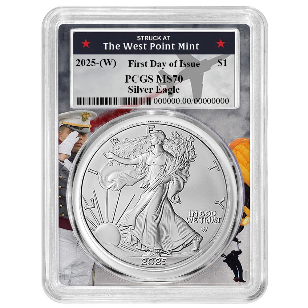 Free Shipping On All Orders Menu gold US Gold American Eagles American Buffalos Pre-33 Gold Gold Bars 1 oz Gold Bars Fractional Gold Bars Gold Rounds World Gold Coins Queen's Beast Series Canadian Maple Leafs S. African Krugerrands British Britannias Chinese Pandas Austrian Philharmonics silver US Silver American Eagles America The Beautiful 90% Silver 40% Silver Silver Rounds Silver Bars 1 oz Silver Bars 5 oz Silver Bars 10 oz Silver Bars Kilo oz Silver Bars 100 oz Silver Bars Silver Shot World Silver Queen's Beast Series Canadian Maple Leafs S. African Krugerrands British Britannias Chinese Pandas Austrian Philharmonics Mexican Libertads Australian Kangaroo's other Platinum Palladium Ancient Coins Error Coins Proof Sets Mint Sets Supplies and Publications auctions Store Categories Bullion Silver Eagles Gold Eagles Gold Buffalo Platinum Eagles First Spouse Gold Modern Commemoratives Ultra High Relief Pre-1933 U.S. Gold World Coins Error Coins Proof & Mint Sets Early U.S. Coinage Pre-33 U.S. Gold Morgan & Peace Silver $1 Dollars $1 Half Dollar 50c Quarters 25c Dime 10c Nickel 5c Small Cent 1c Supplies & Publications Original Government Packaging Ancient Coins No Reserve Auctions Other Store newsletter Add our store to your Favorites to receive our email newsletters about new items & special promotions. Sign up Presale - 2025 (W) $1 American Silver Eagle PCGS MS70 FDOI West Point Frame Product Description Presale Item (Estimated Ship Date 1/24/2025) Please note if your order includes a presale item, the order will be delayed until the presale item becomes available for shipping. Please note that these are business strike coins. PCGS will designate the U.S. Mint facility that struck these coins by including the mint mark in parentheses on the label. The mint mark contained in parentheses is not present on the coin. The American Silver Eagle is considered one of the most popular coins worldwide. The creation of these iconic 1 Troy oz of .999 fine silver coins was authorized through the Liberty Coin Act of 1985, and production began in 1986. Known to many as the official bullion coin of the United States, a redesign was introduced by the U.S. Mint in 2021. The original obverse design, based on Adolph A. Weinman’s 1916 “Walking Liberty” half dollar, has been updated with the help of modern technology. Now a closer reflection of Weinman’s original design, the obverse includes the addition of the traditional artist’s mark on the coin itself. As with the obverse, the reverse of the Silver Eagle also received an update in design. Before the summer of 2021, the design was that of the heraldic eagle of the United States, which was created by the former Chief Engraver of the United States Mint, John Mercanti. This design features an American bald eagle behind a heraldic shield with arrows and an olive branch in its talons. The new reverse design, also known as “Eagle Landing,” shows an eagle approaching a landing, carrying an oak branch to add to a nest. One of the U.S. Mint’s Artistic Infusion Program designers, Emily Damstra, created this new reverse design. Coin Features: 1 Troy oz .999 Silver Shipped in protective packaging Shop with confidence knowing when you buy from Pinehurst Coins, you are buying the best. Each coin has been carefully assessed by the Professional Coin Grading Service (PCGS) and is certified to be in near-perfect condition. These coins are shipped in their original PCGS certification slabs to protect their condition. Coins arrive in protective slabs courtesy of the PCGS Free Shipping on all orders The coin pictured is only a representation of the coin you will receive, not the exact coin (serial numbers will vary) If you have any questions or concerns, please do not hesitate to contact us. Our dedicated Customer Service team will be happy to assist you M-F from 9 am to 5 pm EST. Shipping Payment Returns About Us Shipping We offer free shipping on all of our listings! All items must be shipped directly to your registered eBay address, no exceptions. We will not ship it to an alternative or forwarding address. All of our packages are fully insured. Orders over $750.00 require Signature Confirmation. No insurance claim will be processed if the United States Postal Service or any other carrier designates the package as delivered via tracking number, regardless of circumstance. In general, we ship items using USPS First Class Mail or FedEx Ground. Other methods may be used depending on circumstance. eBay will post an estimated shipping time as soon as shipping information is uploaded to an order. This time frame is only an estimate, not a guarantee. Please be sure to verify that your order is correct prior to submitting payment. Once an order is placed it can only be canceled not adjusted. Orders are processed quickly and once they are moved to our shipping department an order can no longer be canceled, it would have to be returned (all returns are subject to restocking fees). Disclaimer: Once the item has left our facilities, it is under the control of the third party shipping service. We always do our best to provide our customers with speedy service; however some things are out of our control. There is always the possibility for a delay due to these third party services or the possibility of a product becoming damaged or lost in transit. The simple fact is, all of the above-described scenarios are unacceptable to us and we will never put this burden on our customers. If anything happens to a product in transit, we will always be willing to replace the product. Customer satisfaction is our number one priority and we do whatever we can to accommodate you. Pinehurst Coins will not accept purchases for any item that is mispriced due to technical issues, regardless if those issues are caused by eBay's system or our own. All mispriced orders will be canceled and your money will be completely refunded immediately. Payment For large orders with customers that we do not