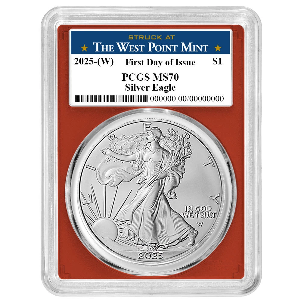 Free Shipping On All Orders Menu gold US Gold American Eagles American Buffalos Pre-33 Gold Gold Bars 1 oz Gold Bars Fractional Gold Bars Gold Rounds World Gold Coins Queen's Beast Series Canadian Maple Leafs S. African Krugerrands British Britannias Chinese Pandas Austrian Philharmonics silver US Silver American Eagles America The Beautiful 90% Silver 40% Silver Silver Rounds Silver Bars 1 oz Silver Bars 5 oz Silver Bars 10 oz Silver Bars Kilo oz Silver Bars 100 oz Silver Bars Silver Shot World Silver Queen's Beast Series Canadian Maple Leafs S. African Krugerrands British Britannias Chinese Pandas Austrian Philharmonics Mexican Libertads Australian Kangaroo's other Platinum Palladium Ancient Coins Error Coins Proof Sets Mint Sets Supplies and Publications auctions Store Categories Bullion Silver Eagles Gold Eagles Gold Buffalo Platinum Eagles First Spouse Gold Modern Commemoratives Ultra High Relief Pre-1933 U.S. Gold World Coins Error Coins Proof & Mint Sets Early U.S. Coinage Pre-33 U.S. Gold Morgan & Peace Silver $1 Dollars $1 Half Dollar 50c Quarters 25c Dime 10c Nickel 5c Small Cent 1c Supplies & Publications Original Government Packaging Ancient Coins No Reserve Auctions Other Store newsletter Add our store to your Favorites to receive our email newsletters about new items & special promotions. Sign up Presale - 2025 (W) $1 American Silver Eagle PCGS MS70 FDOI West Point Label R... Product Description Presale Item (Estimated Ship Date 1/24/2025) Please note if your order includes a presale item, the order will be delayed until the presale item becomes available for shipping. Please note that these are business strike coins. PCGS will designate the U.S. Mint facility that struck these coins by including the mint mark in parentheses on the label. The mint mark contained in parentheses is not present on the coin. The American Silver Eagle is considered one of the most popular coins worldwide. The creation of these iconic 1 Troy oz of .999 fine silver coins was authorized through the Liberty Coin Act of 1985, and production began in 1986. Known to many as the official bullion coin of the United States, a redesign was introduced by the U.S. Mint in 2021. The original obverse design, based on Adolph A. Weinman’s 1916 “Walking Liberty” half dollar, has been updated with the help of modern technology. Now a closer reflection of Weinman’s original design, the obverse includes the addition of the traditional artist’s mark on the coin itself. As with the obverse, the reverse of the Silver Eagle also received an update in design. Before the summer of 2021, the design was that of the heraldic eagle of the United States, which was created by the former Chief Engraver of the United States Mint, John Mercanti. This design features an American bald eagle behind a heraldic shield with arrows and an olive branch in its talons. The new reverse design, also known as “Eagle Landing,” shows an eagle approaching a landing, carrying an oak branch to add to a nest. One of the U.S. Mint’s Artistic Infusion Program designers, Emily Damstra, created this new reverse design. Coin Features: 1 Troy oz .999 Silver Shipped in protective packaging Shop with confidence knowing when you buy from Pinehurst Coins, you are buying the best. Each coin has been carefully assessed by the Professional Coin Grading Service (PCGS) and is certified to be in near-perfect condition. These coins are shipped in their original PCGS certification slabs to protect their condition. Coins arrive in protective slabs courtesy of the PCGS Free Shipping on all orders The coin pictured is only a representation of the coin you will receive, not the exact coin (serial numbers will vary) If you have any questions or concerns, please do not hesitate to contact us. Our dedicated Customer Service team will be happy to assist you M-F from 9 am to 5 pm EST. Shipping Payment Returns About Us Shipping We offer free shipping on all of our listings! All items must be shipped directly to your registered eBay address, no exceptions. We will not ship it to an alternative or forwarding address. All of our packages are fully insured. Orders over $750.00 require Signature Confirmation. No insurance claim will be processed if the United States Postal Service or any other carrier designates the package as delivered via tracking number, regardless of circumstance. In general, we ship items using USPS First Class Mail or FedEx Ground. Other methods may be used depending on circumstance. eBay will post an estimated shipping time as soon as shipping information is uploaded to an order. This time frame is only an estimate, not a guarantee. Please be sure to verify that your order is correct prior to submitting payment. Once an order is placed it can only be canceled not adjusted. Orders are processed quickly and once they are moved to our shipping department an order can no longer be canceled, it would have to be returned (all returns are subject to restocking fees). Disclaimer: Once the item has left our facilities, it is under the control of the third party shipping service. We always do our best to provide our customers with speedy service; however some things are out of our control. There is always the possibility for a delay due to these third party services or the possibility of a product becoming damaged or lost in transit. The simple fact is, all of the above-described scenarios are unacceptable to us and we will never put this burden on our customers. If anything happens to a product in transit, we will always be willing to replace the product. Customer satisfaction is our number one priority and we do whatever we can to accommodate you. Pinehurst Coins will not accept purchases for any item that is mispriced due to technical issues, regardless if those issues are caused by eBay's system or our own. All mispriced orders will be canceled and your money will be completely refunded immediately. Payment For large orders with customers that we d
