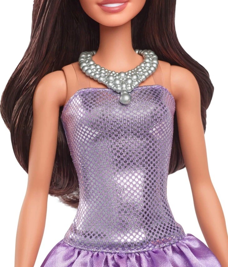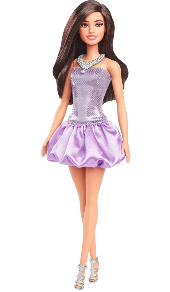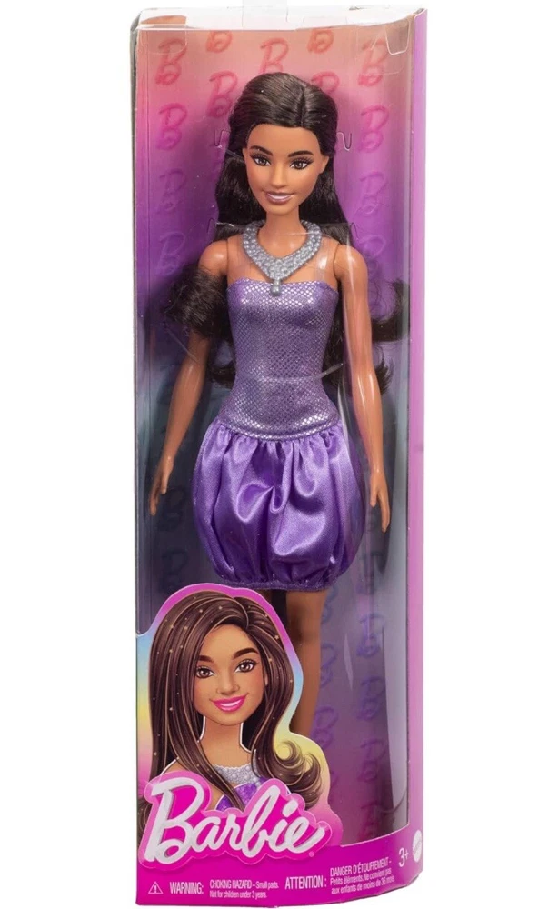 Presale ships by 1/1/2025 Designed to reflect the world kids see today, this diverse line of Barbie Fashionistas dolls showcases bright and trendy styles that inspire endless storytelling possibilities. Barbie doll wears her brown hair down in soft waves! Her look features fun details that make her personality pop, like a silvery necklace and matching strappy heels. She is headed to a glitzy and glam event in her purple bubble dress! The strapless bodice shines with a sequined print, while her satiny skirt adds plenty of fun flounce.