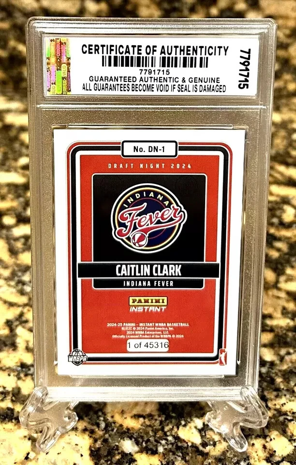 This is a PRESALE ORDER SET FOR APPROXIMATELY 40 DAY DELIVERY. Please see the GRADED GEM-MT 10 VICTOR WEMBANYAMA 2023 PANINI FIRST LOOK RPS-1 AND CAITLIN CLARK 2024 PANINI DRAFT DAY ROOKIE in the listing to see what your card will look like Graded! We have many more cards that aren't listed so feel free to ask if we have other items you are interested in. JDCC Authorized & Inspected AUTHENTIC MEMORABILIA Micro Graded CAITLIN CLARK 2024 Panini Instant GRADED GEM-MINT 10 ROOKIE CARD #166! W/H COA! Cards are Professionally inspected, encased and sealed by JDCC - JD’S Coins & Collectibles Inc.! This item is encased in a Crystal Clear Slab with tamper proof #'d hologram sticker and Certificate of Authenticity marked label for extra security and authenticity! The matching SERIAL #’D JDCC COA will accompany this item. Any tampering or removal of the hologram labels will void the JDCC grading authenticity of the item encased. For further protection the case is fitted with a plastic sleeve. It is best to keep the item in the plastic sleeve to protect the slab from any scratches, etc. This is a beautiful product for display and safekeeping! PLEASE FOLLOW OUR STORE FOR NEW INVENTORY & EXCLUSIVE OFFERS! I combine shipping at .50 cents per additional item capped at $9.99. International rates are $14.99. Feel free to send me offers for multiple items and qualify for discount shipping rates and lower costs per item! I send daily invoices every morning so be sure to wait for your combined shipping invoice before checkout or request an invoice when you are ready to pay. Please keep in mind shipping and handling fees don't just cover postage but also ebay/paypal fees, supplies, taxes and other costs. 5 Star feedback is Greatly appreciated and FOLLOW our store for New Inventory! Good luck and enjoy!