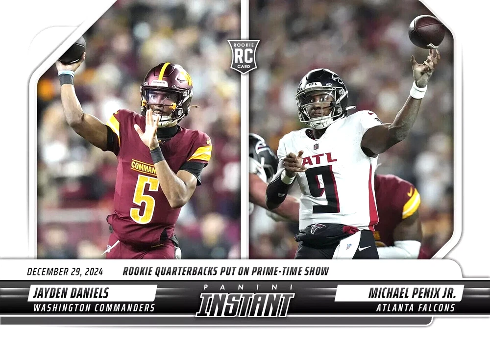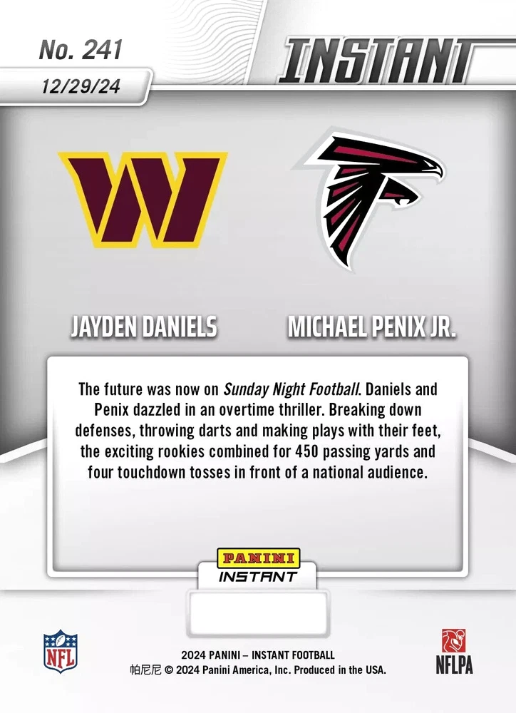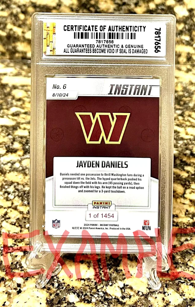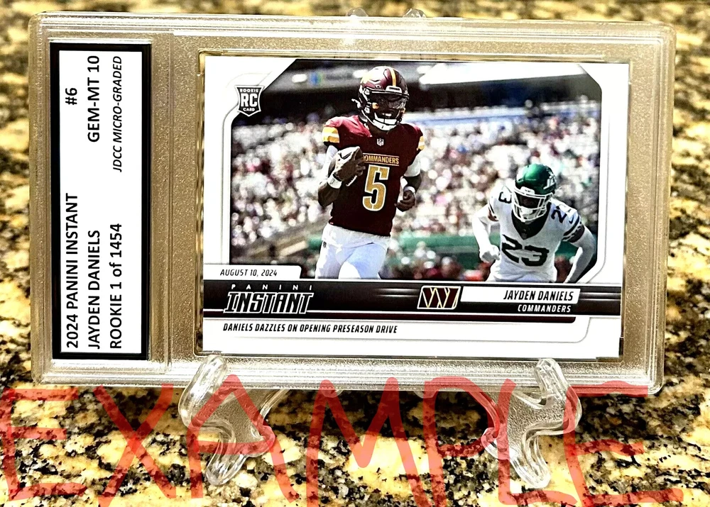 THIS IS A PRESALE ORDER SET FOR 40 DAY DELIVERY. Please see the GRADED GEM-MT 10 Jayden Daniels #6 in the listing as an EXAMPLE ONLY to see what your card #241 will look like Graded! You will receive JDCC Authorized & Inspected AUTHENTIC MEMORABILIA Micro Graded GEM-MT 10 Jayden Daniels & Michael Penix Jr. 2024 Panini GRADED GEM-MT 10 Rookie CARD #241! COA! Cards are Professionally inspected, encased and sealed by JDCC - JD’S Coins & Collectibles Inc.! This item is encased in a Crystal Clear Slab with tamper proof #'d hologram sticker and Certificate of Authenticity marked label for extra security and authenticity! The matching SERIAL #’D JDCC COA will accompany this item. Any tampering or removal of the hologram labels will void the JDCC grading authenticity of the item encased. For further protection the case is fitted with a plastic sleeve. It is best to keep the item in the plastic sleeve to protect the slab from any scratches, etc. This is a beautiful product for display and safekeeping! PLEASE FOLLOW OUR STORE FOR NEW INVENTORY & EXCLUSIVE OFFERS! I combine shipping at .50 cents per additional item capped at $9.99. International rates are $14.99. Feel free to send me offers for multiple items and qualify for discount shipping rates and lower costs per item! I send daily invoices every morning so be sure to wait for your combined shipping invoice before checkout or request an invoice when you are ready to pay. Please keep in mind shipping and handling fees don't just cover postage but also ebay/paypal fees, supplies, taxes and other costs. 5 Star feedback is Greatly appreciated and FOLLOW our store for New Inventory! Good luck and enjoy!