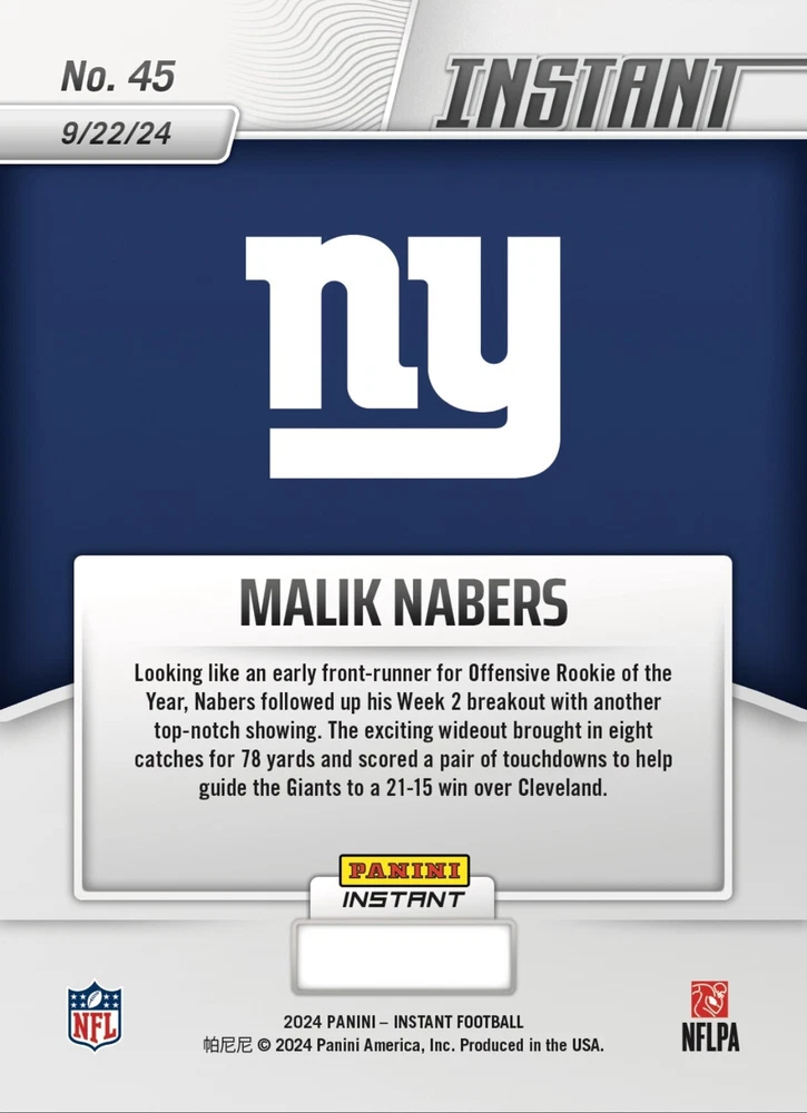 THIS IS A PRESALE ORDER SET FOR 40 DAY DELIVERY. Please see the GRADED GEM-MT 10 VICTOR WEMBANYAMA 2023 PANINI FIRST LOOK RPS-1 and CAITLIN CLARK DRAFT DAY ROOKIE in the listing to see what your card will look like Graded! You have the option of the BASE Ungraded Card or a Graded GEM-MT 10! PLEASE BE SURE TO CLICK ON THE CORRECT ITEM THAT YOU WANT We have many more cards that aren't listed so feel free to ask if we have other items you are interested in. JDCC Authorized & Inspected AUTHENTIC MEMORABILIA Micro Graded GEM-MT 10 Malik Nabers 2024 Panini GRADED GEM-MT 10 Rookie CARD #45! COA! Cards are Professionally inspected, encased and sealed by JDCC - JD’S Coins & Collectibles Inc.! This item is encased in a Crystal Clear Slab with tamper proof #'d hologram sticker and Certificate of Authenticity marked label for extra security and authenticity! The matching SERIAL #’D JDCC COA will accompany this item. Any tampering or removal of the hologram labels will void the JDCC grading authenticity of the item encased. For further protection the case is fitted with a plastic sleeve. It is best to keep the item in the plastic sleeve to protect the slab from any scratches, etc. This is a beautiful product for display and safekeeping! PLEASE FOLLOW OUR STORE FOR NEW INVENTORY & EXCLUSIVE OFFERS! I combine shipping at .50 cents per additional item capped at $9.99. International rates are $14.99. Feel free to send me offers for multiple items and qualify for discount shipping rates and lower costs per item! I send daily invoices every morning so be sure to wait for your combined shipping invoice before checkout or request an invoice when you are ready to pay. Please keep in mind shipping and handling fees don't just cover postage but also ebay/paypal fees, supplies, taxes and other costs. 5 Star feedback is Greatly appreciated and FOLLOW our store for New Inventory! Good luck and enjoy!