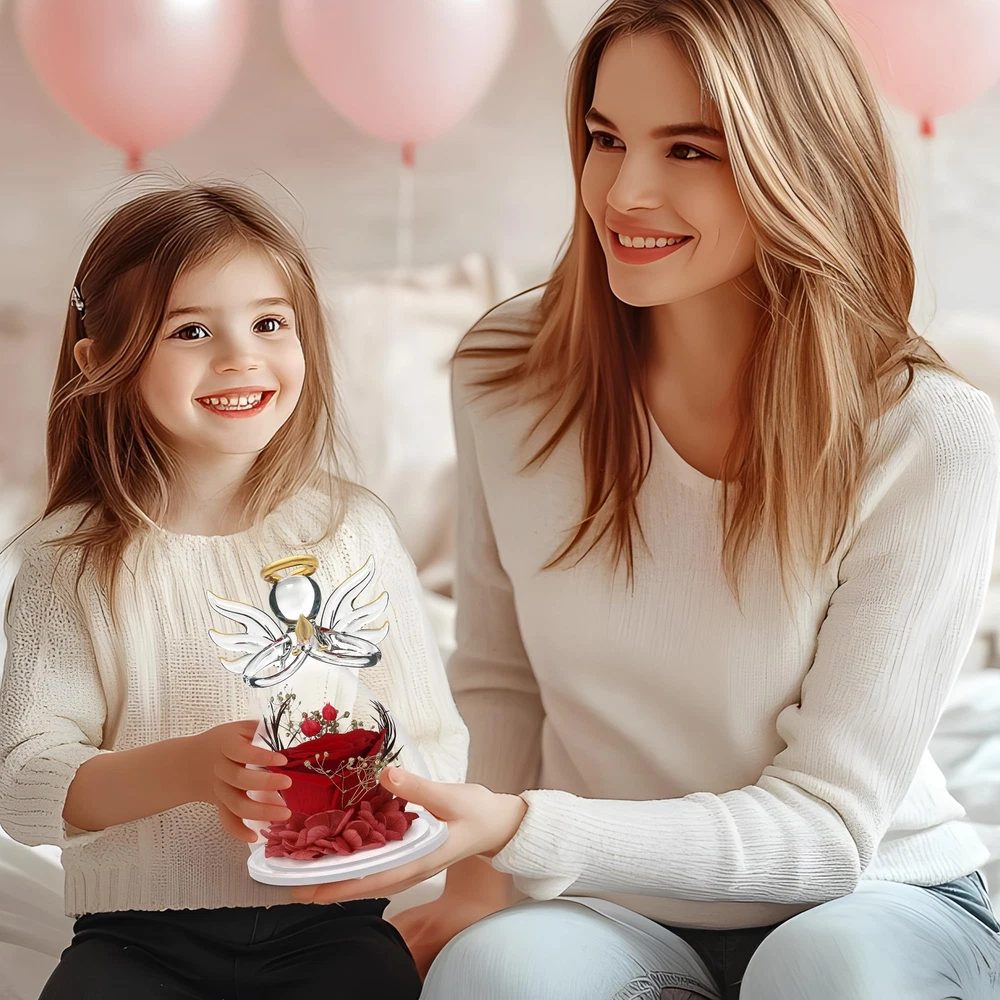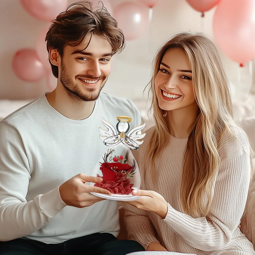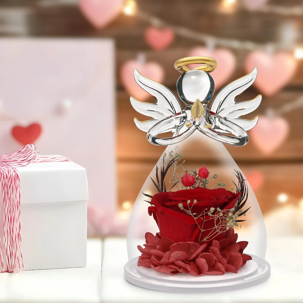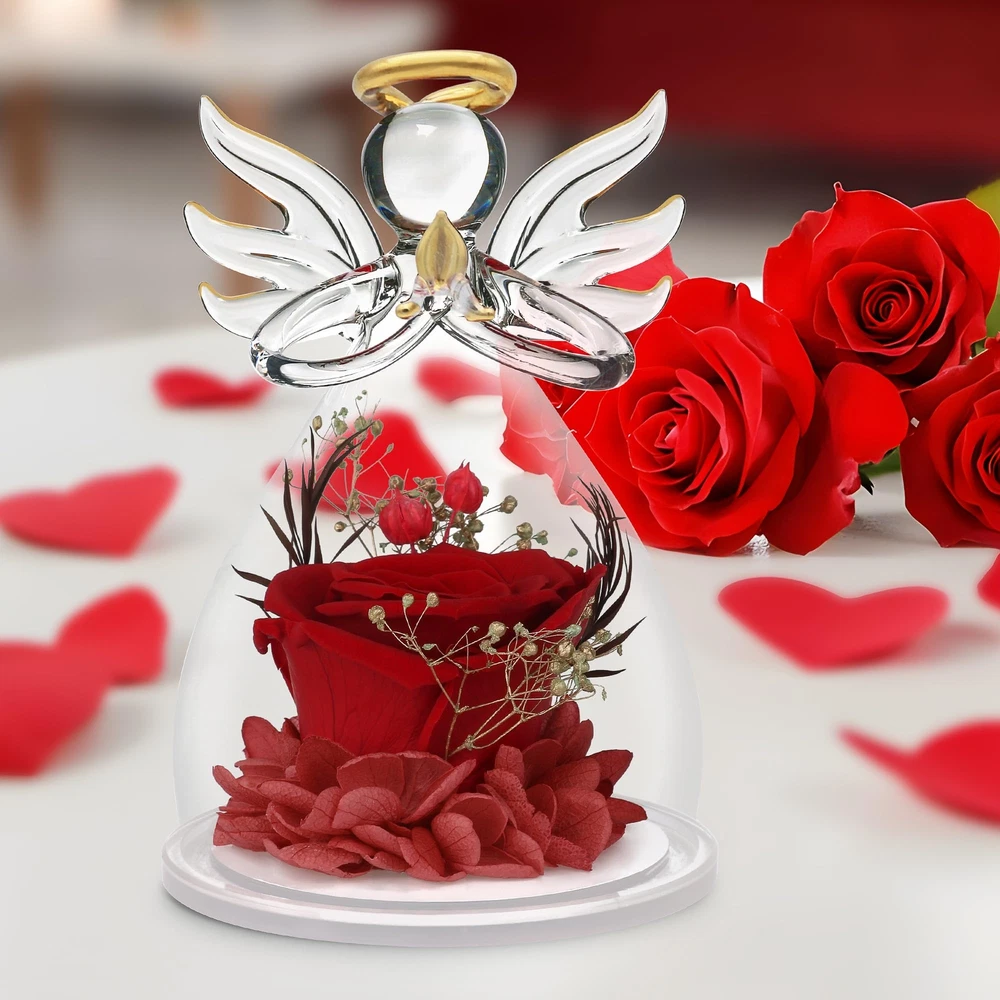 Beautiful And Vibrant Rose Flower Gifts for Women: Valentines day gifts for her,Mom gifts for her birthday,red rose gifts for her,romantic Valentines gifts for her.Delicate and beautiful red rose encased in a glass angels figurines is great birthday gifts for women.Red Preserved flower Rose,real hydrangea petals,real silver millet fruit,etc.Valentines Gifts for women.Making the person feel special and meaningful at birthday or any other important days Wonderful Angel Birthday Gifts for Women: Best angel rose Valentines gifts from daughter,rose flower gift for her,birthday gifts for women who have everything.Anniversary gifts for women.Angel Figurines with Real red Rose is a lovely gift that will be cherished by anyone who is special to the giver.Best friend gifts for women,Anniversary,Birthday,Mother's Day,Wedding decorations.Rose flower in glass angel figurines is great gifts for women or anyone who loves angels,flowers and red Mom Flowers Angels Gifts For Lasting Keepsake And Memory: Romantic Roses flower for mothers,gifts for her,Mothers day gifts for moms from daughter son.Angel birthday gift for Mom gifts.The preserved flower rose angel is about 4.33 H x 3 W Inch,a wonderful and touching mom gifts,sympathy gift.Unique glass rose flower Angel gifts for her valentine's day,women,wife,girl,mother,father,daughter,family,teacher,colleague,etc.Adding to memorable memories collection Crystal Clear Angel With Rose Inside As Valentines Gifts: Mom Valentines day gift from daughter,teacher valentine gifts,appreciation gifts,graduation gifts,grandma birthday gifts.The Angel Figurines made from clear glass,gold outline painted wings,halo and namaste palms.Heartwarming birthday gifts for women or someone special.Red rose flower in glass angel figurines Preserved Flower Rose Gifts With Gift Box:This preserved flowers rose angel is came with a black gorgeous gift box and no need package again. Angel figurines birthday presents for women,Heartwarming and Lovely Gift as beautiful memory forever Tips: Please contact us if have any question after/before receive preserved flowers Angel gift for her