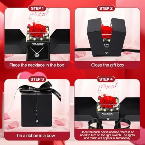 Return Policy Fast Delivery Trusted seller Preserved Real Rose Gift Box with Necklace, Eternal Flowers Rose Birthday Gifts Music Box for Her Mom Wife Grandma Girlfriend on Valentines Mothers Day Christmas Anniversary (Red) Product Description Eternal Love Preserved Real Rose: Experience the beauty of our Eternal rose, crafted from 100% natural roses through a meticulous handmade process. This stunning flower can be preserved for 3-5 years without any watering or maintenance, making it a perfect symbol of eternal love. Ideal for anniversaries, birthdays, and special occasions, it's a timeless gift for your loved ones Heartfelt Gift with Necklace: Surprise her with a unique double heart-shaped necklace engraved with "I Love You" in 100 languages. This romantic piece is nestled at the bottom of the rose box, serving as a heartfelt token of your affection. The intertwined hearts symbolize unbreakable bonds, making it an exclusive gift for her Birthday Gifts for Women: This beautifully packaged set includes 1 Preserved Rose and 1 Double Heart Necklace, making it a thoughtful present for birthdays, Mother's Day, Valentine's Day, and anniversaries. Whether for your girlfriend, wife, mother, daughter, or grandma, this gift is sure to delight and convey your love Magical Light & Music Experience: Enhance the romantic gesture with our exquisite music box. When opened, integrated lights illuminate the stunning rose while soothing music plays, creating a magical atmosp. With an automatic timer, the lights gently fade after five minutes, ensuring a captivating moment without manual intervention All-Inclusive Gift Set: Each package comes beautifully wrapped and includes everything you need: 1 Preserved Eternal Rose, 1 Gift Box, 1 Double Heart Necklace, 1 Gift Bag, and 1 Greeting Card. This luxurious gift set is ready to impress, making it easy to show your love and appreciation on any occasion Shipping Returns Payment Shipping Shipping is FREE to all addresses other than APO/PO boxes in the lower 48 states. All our stock ships from US-based warehouses. Shipped via USPS or UPS (depending on location and package weight) Unless stated otherwise, all orders will ship within 24-72 hours of your payment being processed. Check our feedback to see the great reviews of FAST shipping we offer. Returns Seller does not accept returns Payment We currently accept payment via eBay managed payments only. Once payment is cleared, we will dispatch your shipment within 1-3 business days. Please refer to the "Shipping" tab for more information regarding shipping speed to your destination.