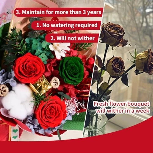 Return Policy Fast Delivery Trusted seller Preserved Red Rose Flowers Christmas Gift Bouquet-Fresh Rose Flowers Bouquet for Delivery Prime, Fresh Cut Flowers for Birthday Gift, Gift for Her:Mother's Valentine's Day Product Description Real Fresh Flowers: Our red preserved flower bouquets are made from every single flower sourced from natural farms. These flowers undergo special preservation techniques that keep them fresh and vibrant, allowing them to be stored and used for 1-3 years Crafted by Professional Florists: This red preserved flower flores bouquet is expertly crafted and packaged by experienced professional florists. It features a perfect combination of roses, cotton stem, hydrangea petals, eucalyptus leaves,red berries, artificial melon seeds flower, melaleuca, Baby's breath. The perfect color coordination creates a stunning and awe-inspiring bouquet that evokes unique emotions Exquisite Gift Packaging: Our bouquet boxes are beautifully designed and ready to be given as the perfect gift, with no need for additional packaging. The exquisite red forever rose flower bouquet. It can be gifted to your mother, wife, daughter, sister, or female friends. Brand new gift packaging to better protect the bouquet Floral Gifts: Forever flower bouquets are the perfect choice for birthdays, parties, Valentine's Day, Mother's Day, Christmas, anniversaries, graduations, wellness, and other special occasions. This bouquet will be a constant presence throughout the year, accompanying her through all seasons Lasting and Low Maintenance: Compared to fresh flower bouquets, this preserved flower bouquet maintains its fresh appearance and rich colors for 1-3 years. It requires minimal daily maintenance and care, without the need for watering. The bouquet should be kept away from humid environments and direct sunlight to ensure its long-lasting preservation and use Shipping Returns Payment Shipping Shipping is FREE to all addresses other than APO/PO boxes in the lower 48 states. All our stock ships from US-based warehouses. Shipped via USPS or UPS (depending on location and package weight) Unless stated otherwise, all orders will ship within 24-72 hours of your payment being processed. Check our feedback to see the great reviews of FAST shipping we offer. Returns Seller does not accept returns Payment We currently accept payment via eBay managed payments only. Once payment is cleared, we will dispatch your shipment within 1-3 business days. Please refer to the "Shipping" tab for more information regarding shipping speed to your destination.