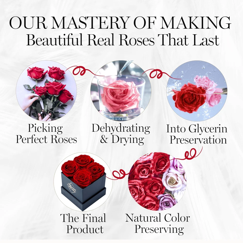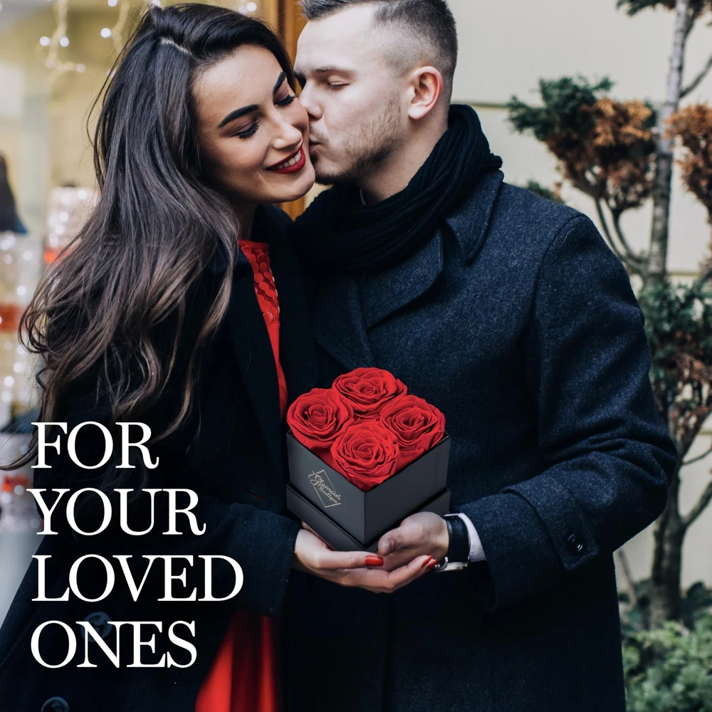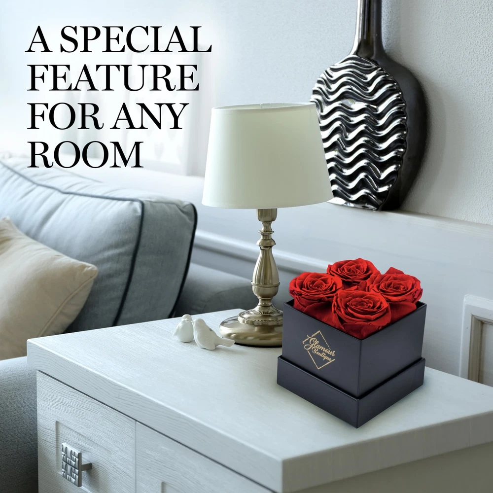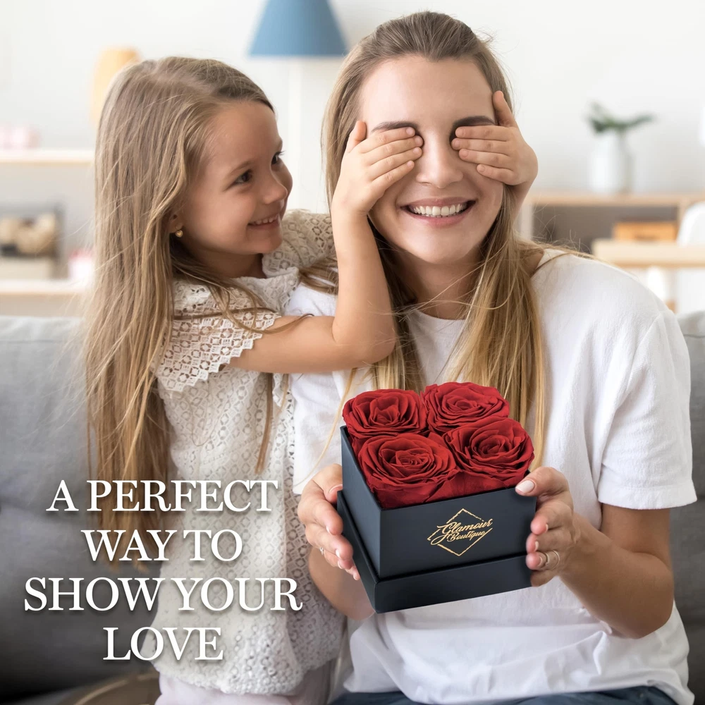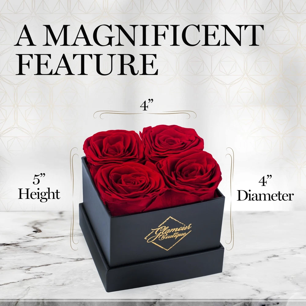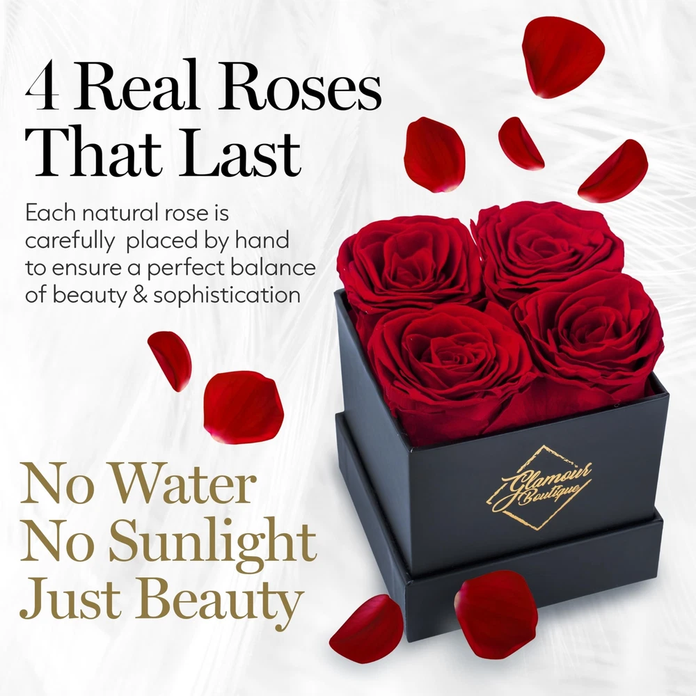 Preserved Roses in a Box - Valentines Day Gifts for Her & Mom, 4 Roses Flowers Decor for Birthday Gift, Cased in A Square Gift Box with Lid, 4” x4” x5 - Red Product Details Size: 4 Roses Black Box Color: 4 Roses Black Box Red Brand: GLAMOUR BOUTIQUE UPC: 719417523179 EAN: 0719417523179 MPN: Does not apply Package Dimensions: 6.06 x 4.41 x 4.33 inches Item Weight: 11.3 ounces Manufacturer: GLAMOUR BOUTIQUE Batteries required: No Flowers Forever: Ever wished that you could give a gift to your significant other that will last? With our preserved rose, you can surprise a loved one with their favorite flower and they get to keep them as long as they want! Premium-Quality Preserved Rose: The box comes with 4 flowers, each one is made from a real rose with intricate realistic details. It's also manually assembled and can last for 1-3 years. Secure Box Case: Encased in a durable white box with a cover, our preserved flowers make for a great valentine decor. Keep it at room temperature without being exposed to water or direct sunlight to maintain the quality. Available in Various Colors: Pick your loved one's favorite color for a gift that's truly personalRed, Pink, Purple, Yellow, Blue or White. Gift Idea for Special Occasions: Click 'Add to Cart' now and make it the excellent Valentines gifts for her, Valentines Day gifts for mom, birthday gifts for mom, gift for her on anniversary, get well and more!