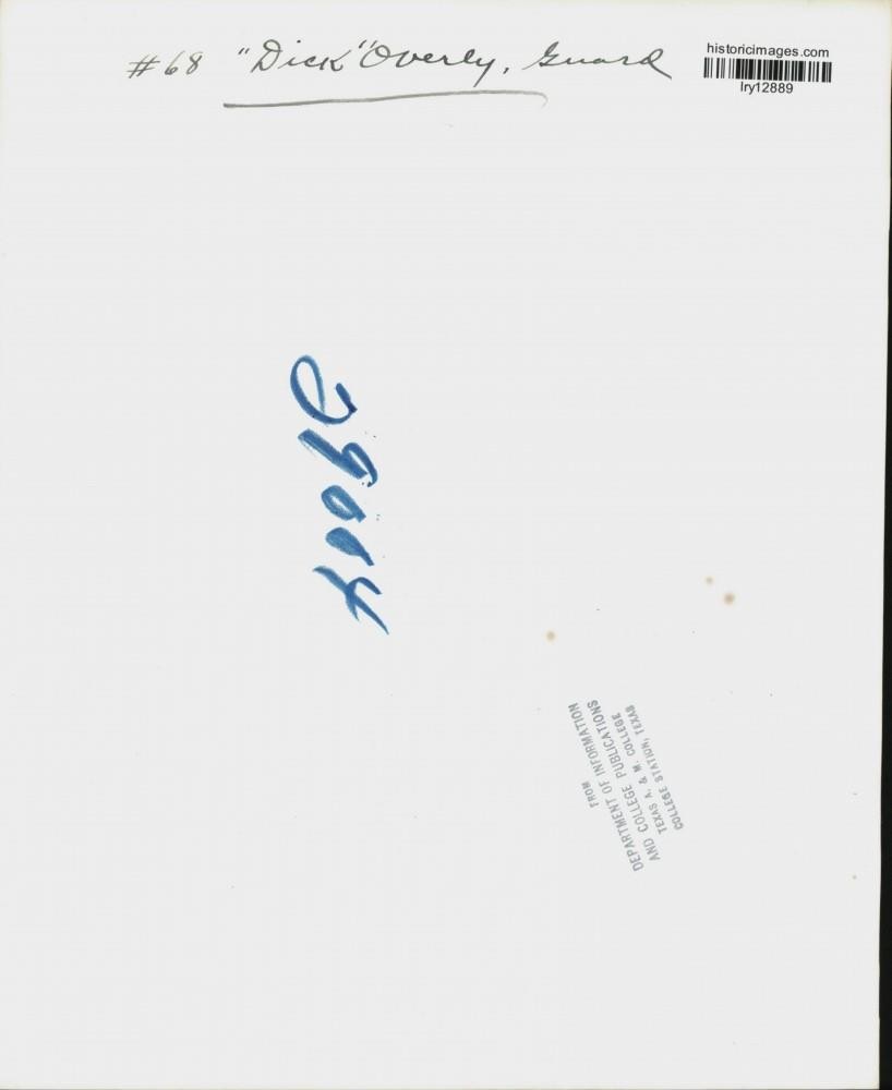 ebay template Note: Please study the images carefully to determine the condition of this vintage photograph, as it may not be in perfect condition. It may contain wrinkles, cracks, and possibly even tears due to its age and how it was handled before it got to us. A scanner may interpret colors and contrast differently than human eyes will, so it is possible that the actual photograph may be slightly darker or lighter in person. This vintage photograph is offered for sale as a collectible item and conveys no transfer of copyright. Press Photo Texas A&M Football player "Dick" Overly, Guard - lry12889 This is an original press photo. Texas A&M Football player, #68, "Dick" Overly, GuardPhoto measures 8 x 10inches. Photo is dated --none. PHOTO FRONT PHOTO BACK Historic Images Part Number: lry12889 Sell Smarter with Kyozou. Inventory and Ecommerce Management