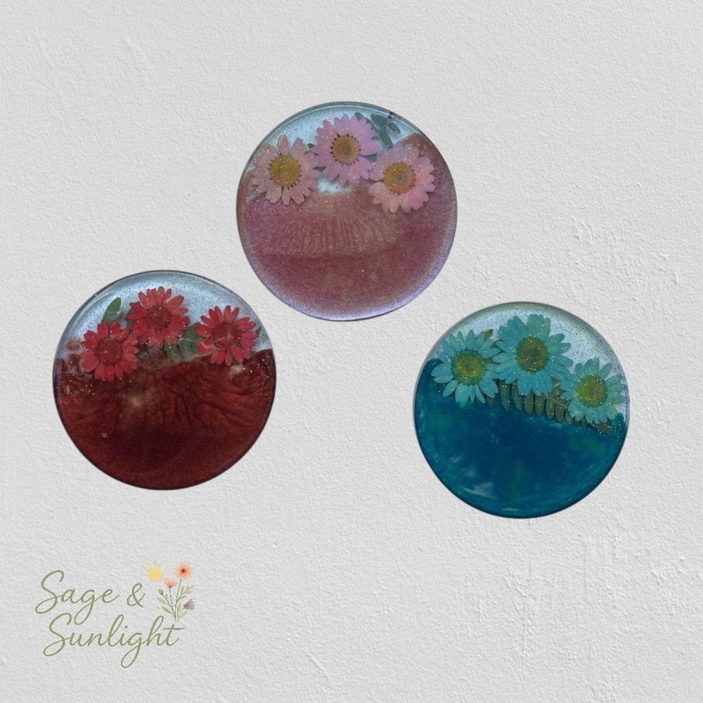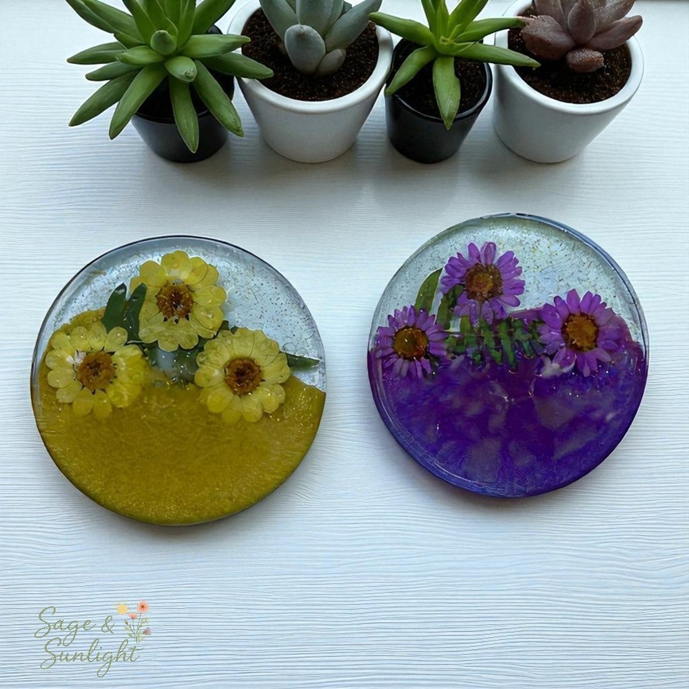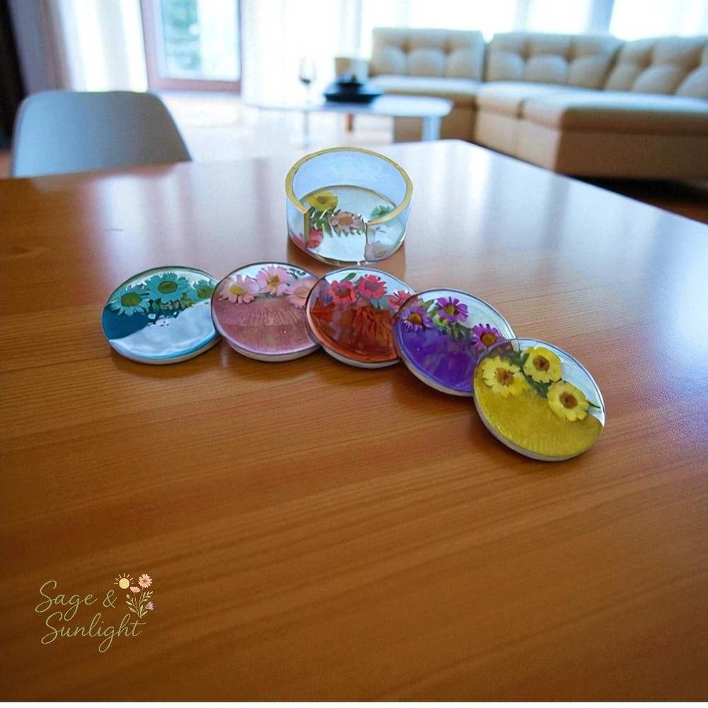 🌼 Colorful Pressed Daisy Resin Coaster Set 🌈 Bring a pop of color and nature’s charm to your home with this unique set of handmade resin coasters. Each coaster features a striking half-and-half design: one side in a vibrant hue (your choice of purple, yellow, blue, pink, or red), the other adorned with real dried pressed daisies and your choice of gold or silver trim. It also comes with a matching coaster holder. Whether you prefer a matching set or a mix of all five colors, these coasters add the perfect blend of modern color and natural elegance to any space. ✨ Highlights: Customizable: Choose a single color or one of each for a vibrant set Real pressed daisy flowers preserved in clear resin Made with premium epoxy resin for durability and shine Includes non-slip bumpers to protect surfaces Handmade with care — each coaster is one of a kind 🎁 Perfect For: Housewarming gifts Nature and flower lovers Spring or summer table décor Unique gifts for friends, moms, or bridesmaids 🌸 Add a little flower power to your coffee table — or gift a set to someone who loves color and creativity!