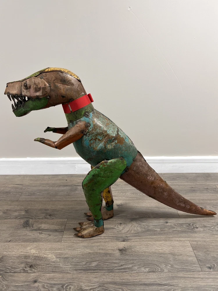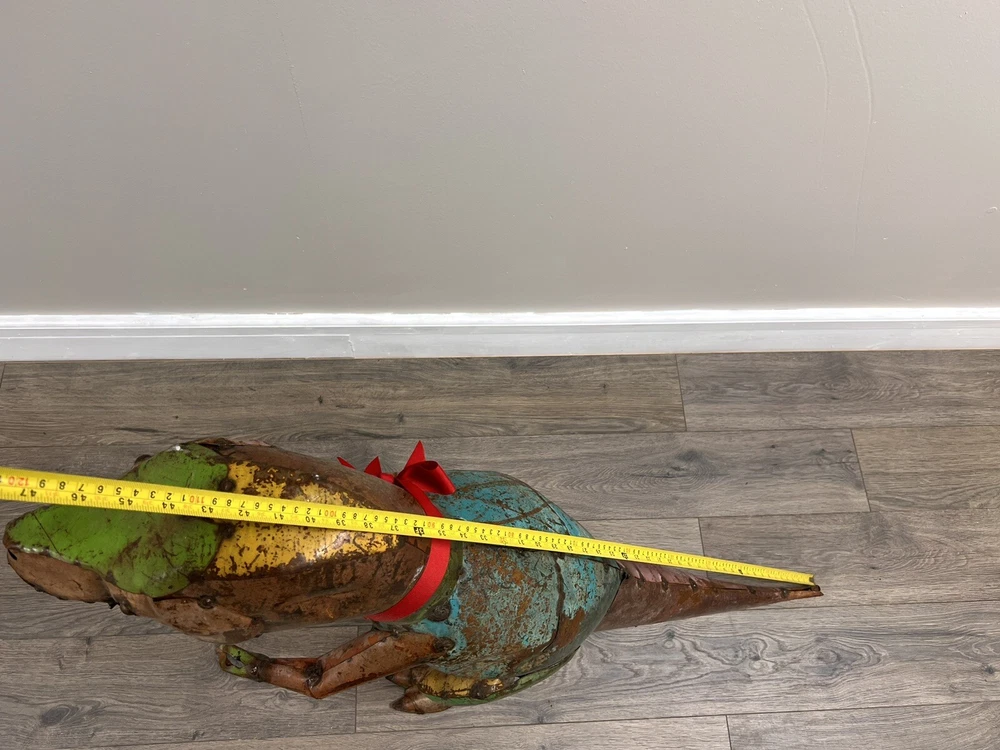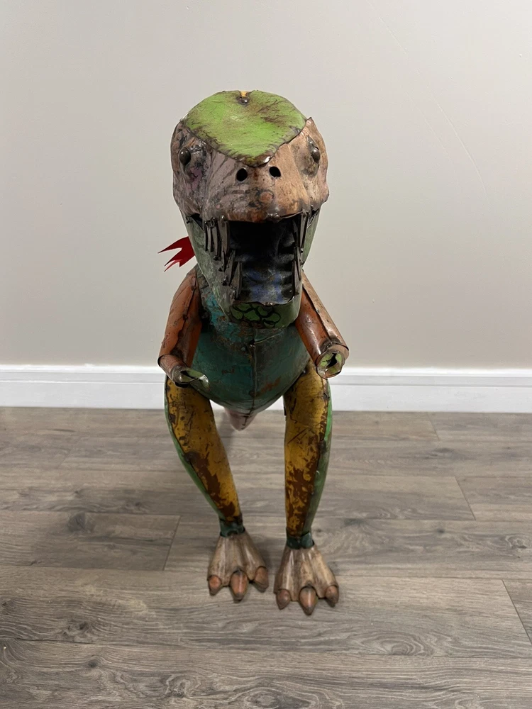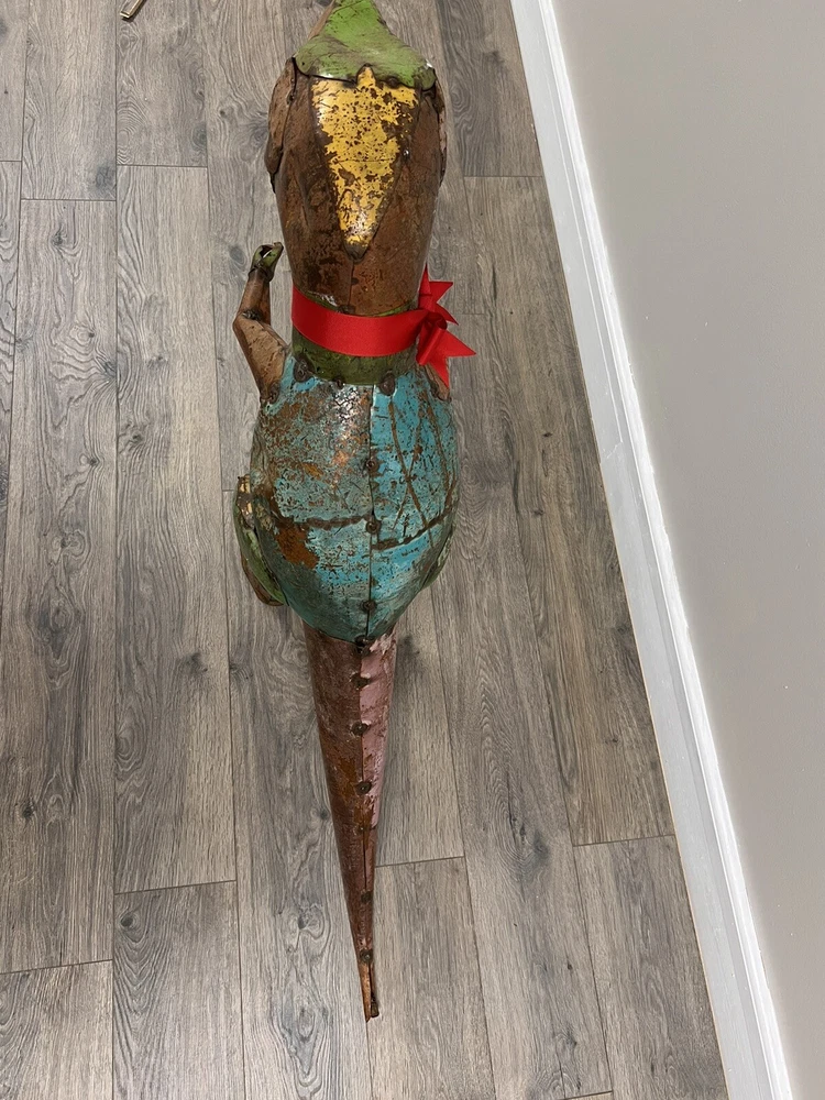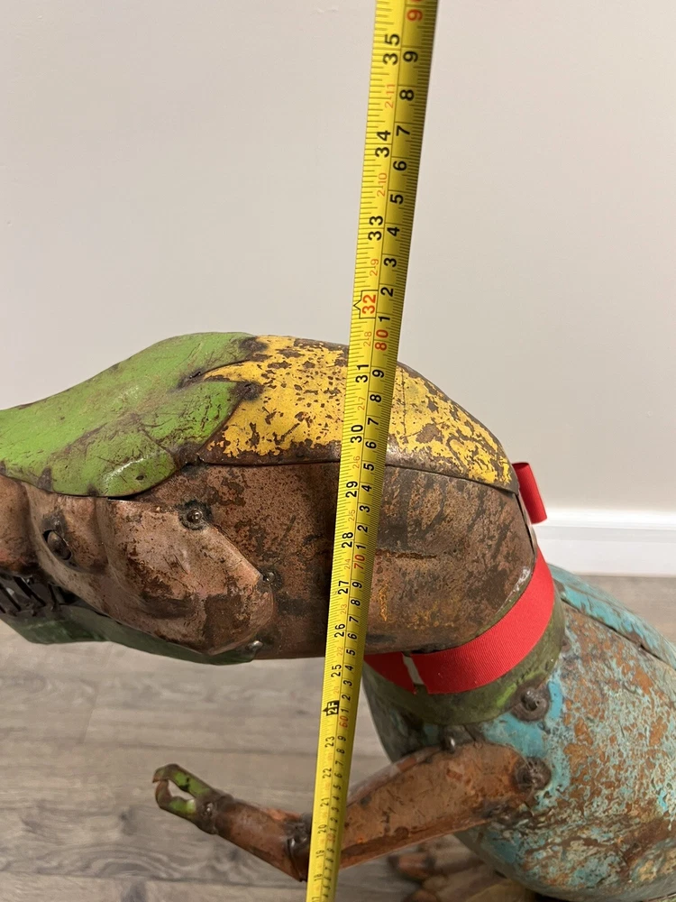 Add a touch of vintage charm to your garden with this rare, pressed steel/metal dinosaur yard art. Standing at an impressive 30 inches high, this piece is perfect for both indoor and outdoor display. Its sturdy material ensures it can withstand the elements, making it a long-lasting addition to your home decor collection. The unique animal theme of this piece makes it a great conversation starter, perfect for any yard, garden or outdoor living space. Its vintage style adds a timeless appeal to your home, making it a must-have for any collector. This metal animal is a great addition to your other outdoor decor, and its quality craftsmanship ensures it will be a cherished possession for years to come.