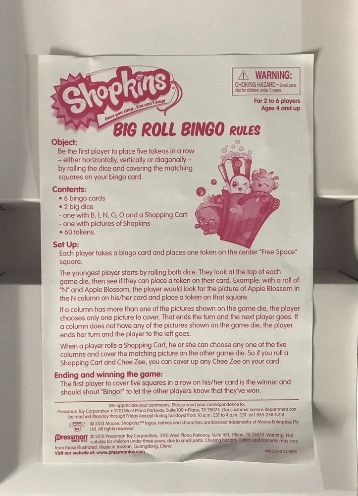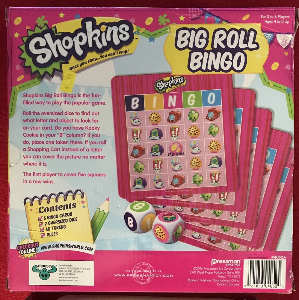 MPN: 4052A gtin13: 021853040524 Recommended Age Range: 4 and up Min. Number of Players: 2 players Type: Complete Game Game Type: Board Game Gender: Boys & Girls Game Title: Big Roll Bingo Age Level: 4-7, 8-11 Years, 12-16 Years, 17 Years & Up Year: 2016 Brand: Pressman Character Family: Shopkins UPC: 021853040524 Country/Region of Manufacture: China