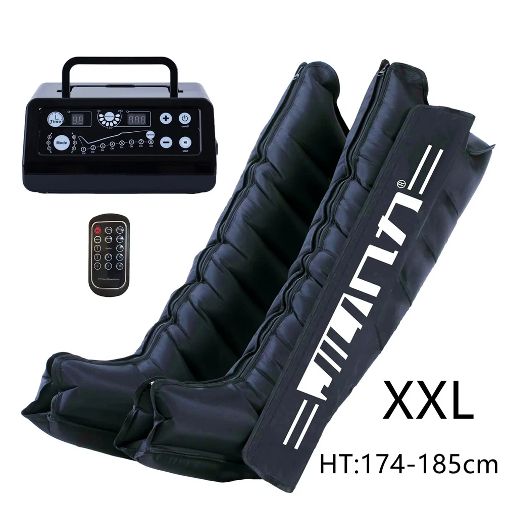 Due to European policy, European countries need to provide their individual value Added Tax (VAT) number to send, please contact customer service Pneumatic compression is a form of pressure massage in which a garment completely covering the limb (legs or arms) inflates and deflates in a cyclical pattern over a period of time. The process flushes fluids containing metabolic waste and ushers in fresh, nutrient-rich blood to the limbs, improving circulation and blood flow. This increased circulation will reduce muscle pain and soreness, decrease swelling, and offer greater pain relief and recovery. BOOST CIRCULATION Speed up cellular repair by providing more oxygen and nutrients to the muscles while removing lactic acid and other by-products caused by exertion. INCREASE LYMPHATIC FUNCTION Dramatically aid the body’s natural process of removing toxins and waste through the lymphatic system. RELIEVE MUSCLE TENSION Increase flexibility, improve muscle response and decrease the likelihood of injury by targeting tight, tense muscles and fascia. With more sizes, more features, more control, and more power than the competition.There are eight air chambers from the foot to the thigh, and each section can be opened and closed independently. Compared with 4-5 air chambers, it can promote blood flow more thoroughly About the AC controller, Weight:2.5KG, Size:23.5*24*10.5cm voltage: 100-110V/220-240V, power: 30w/40va, remote control distance: 5m Five kinds of loop programs A.take turns B.Increment C.Take turns in pairs D.all E.A+B rotation Pressure range 30-250mmhg,There are 7 levels of addition and subtraction Size S , suitable for height <155cmSize XL , suitable for height 155-173cm Size XXL, suitable for height 174-185cm Size XXXL, suitable for height >185cm Size trousers XL,suitable for height 160-185cm Size trousers XXL,suitable for height 185-205cm Voltage 100-240V, all over the world, plug has European plug and artist plug, we will choose the appropriate plug for you in the destination country The arms and trousers of the whole body can be inflated at the same time. Since there may be some overlap between the waist and trousers, it is recommended to use the waist alone. The product is equipped with three adapters to ensure that the arms and trousers are connected to the machine at the same time