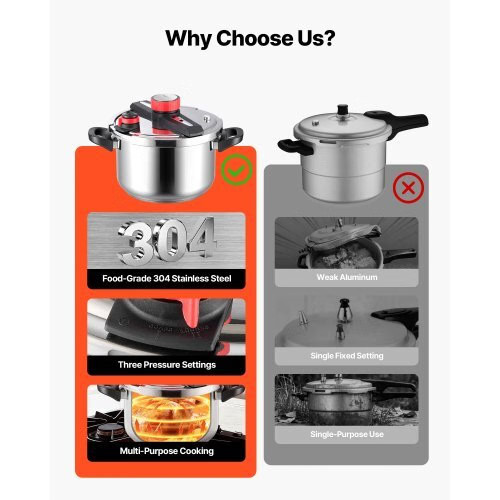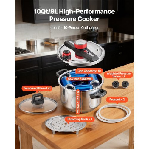 VEVOR Pressure Cooker, 10Qt Pressure Cooker Stainless Steel,Pressures Canner with Steaming Rack, Tempered Glass Lid, ThreePressures Settings for Meat, Beans, Rice, Soup, Sauces, Cook up to100 kPa Full Meals, Less Effort Premium Cooking Choice Triple-Layer Heating Quality Build and Comfort Everyday Cooking Upgrade Multiple Sizes Available Capacity: 10Qt/9L,Item Model Number: 26cm/9L,Pot Depth: 6.9inch/175mm,Can Capacity: 10,Product Dimensions: 15.9 x 11.2 x10.0/9.6 inch (405 x 284 x 255/245mm),Net Weight: 10.3 lbs/4.66kg,Pot Diameter: 10.2 inch/258mm