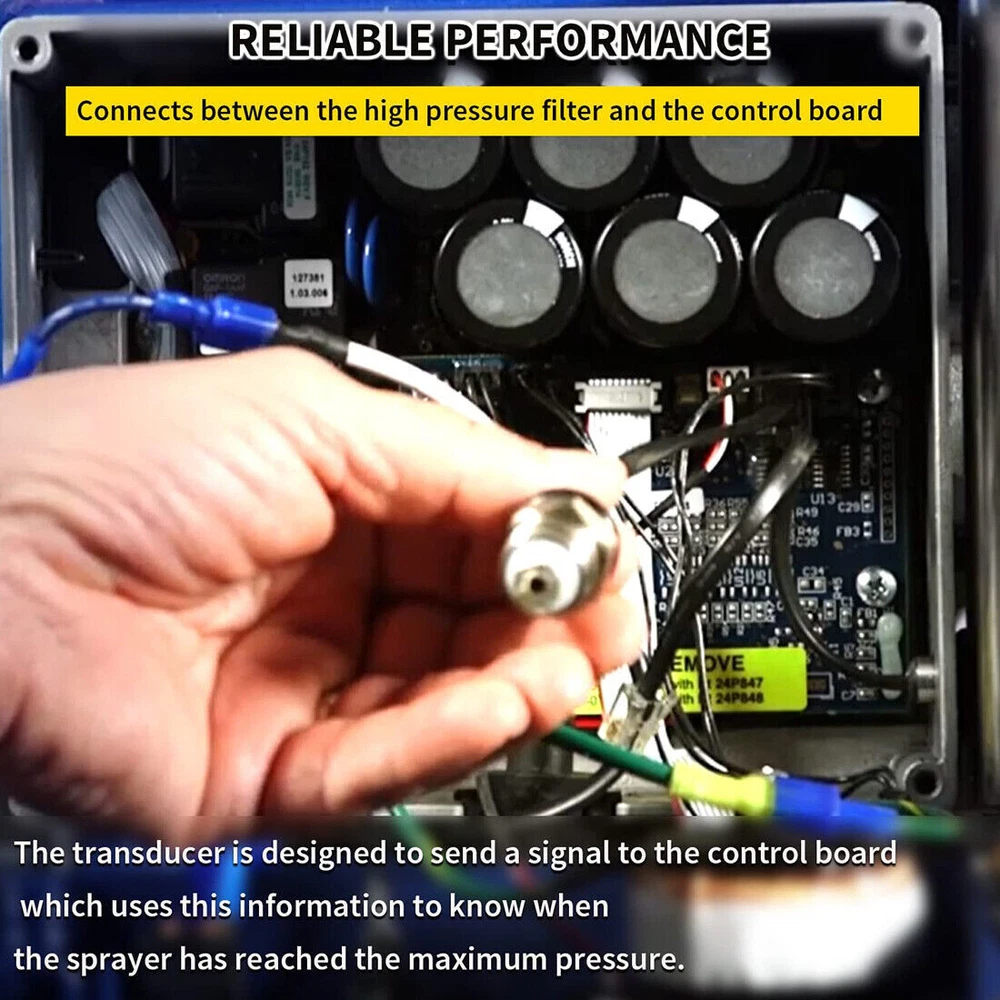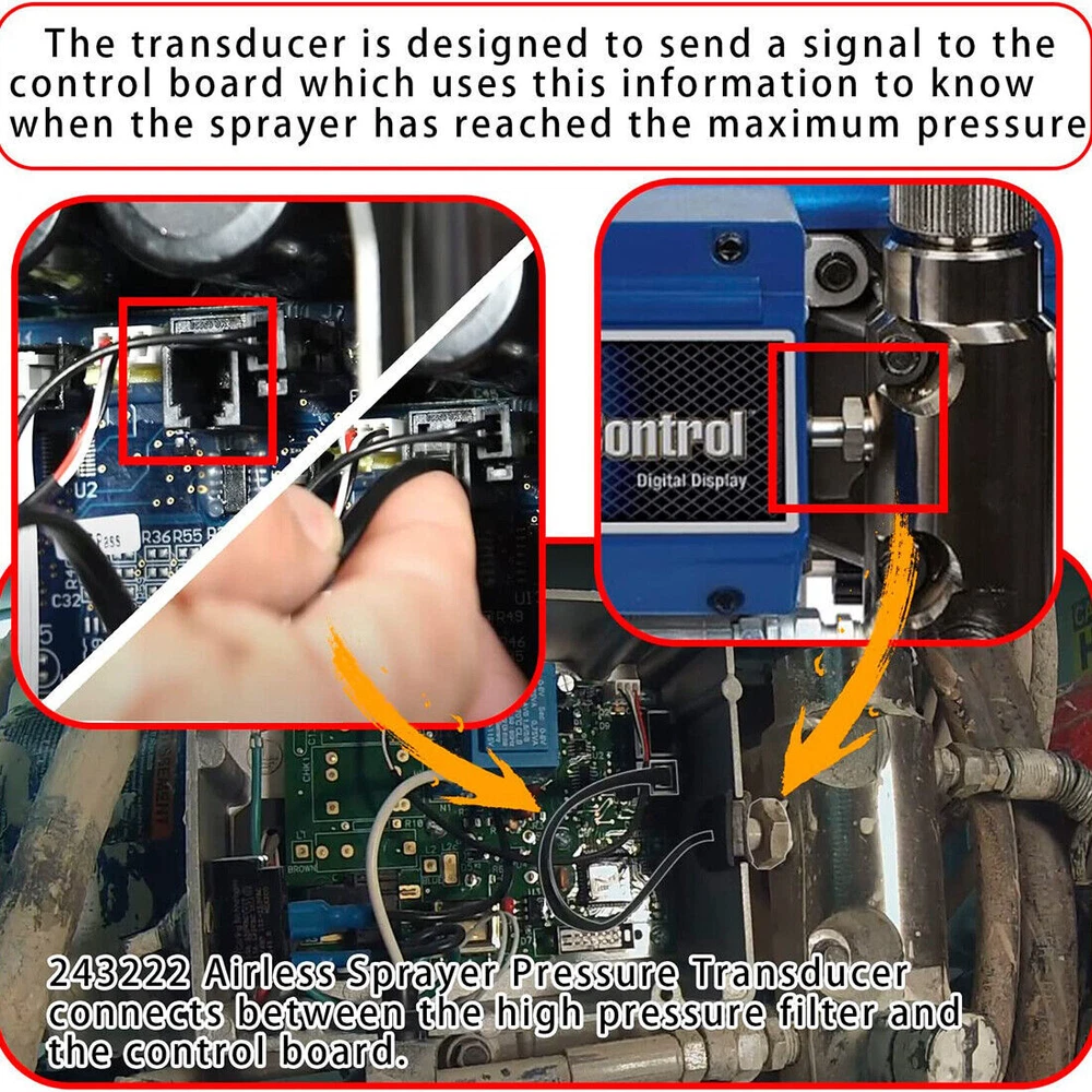 243222 airless paint sprayer pressure sensor is compatible with most Graco airless paint sprayers. Models are: 190ES, Ultra Models -210ES,210PC,230PC,295ST;UltraMax and UltraMax II-390, 395, 490, 495, 595;UltraMax and UltraMax II -695, 795, 1095, 1595;PC Pro- 390 395 490 495 595 695 795 1095 1595;GMAX and GMAX II -3400, 3900, 5900, 7900;Linelazers-3400, 3900, 5900, 7900. Please note: This product is compatible with Graco sprayers and is not compatible with Titan sprayers. 243222 airless sprayer pressure sensor is made of good materials and has excellent durability for better connection to high pressure filters and control panels. Sprayer Pressure Transducer adopt preciseness compensation technology and sensitive components, bear high volumes from 6bar to 6000bar.Replaceable Part Number: 243222. 243222 airless sprayer pressure sensor is connected between the high pressure filter and the control board. The sensor is sending a signal to the control board, and the control board uses that information to know when the sprayer has reached maximum pressure. Excessive pressure can cause the sensor to cause an error code to appear on your digital display, a timely reminder to replace or report an error. Over-pressurized machines can cause dangerous burst paint lines or damage to other components, such as pumps or drain valves. Sensor failure in Graco airless paint sprayers is a common occurrence; sensors are not repairable and they must be replaced. Guarantee:If you're not 100% satisfied with this Tools, simply return it for a full refund in 60 days.Premium Support & 24 Months Warranty.