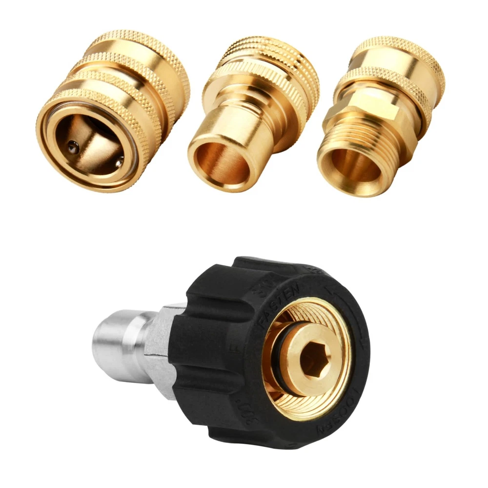 Pressure Washer Adapter Set Package:This pressure washer adapter set includes a variety of connectors. 2 pack M22-14 swivels + 3/8" plugs, 2 pack 3/8" quick disconnects + M22-14 males, 2 pack 3/4" female + 1/2" quick connects, and 2 pack 1/2" plug+ 3/4" male, ensuring versatile compatibility Attention to Fitting Size: Note that the M22-14 swivel has a 14mm fitting (inside diameter). It is crucial to verify your fitting size, as a 15mm fitting may lead to leaks and is not with this adapter set. And not fit some pressure washer with M22 15mm fitting Effortless Connection and Disconnection: The quick connectors enable easy attachment and detachment between the pressure washer pump and hose. sets connect the pump outlet to the pressure washer hose or the cleaning hose to the , while the other kits convert 3/4" threads into quick release connectors for standard 3/4" garden hoses to connect to the washer pump inlet Long-Lasting Construction: Crafted from premium brass, these adapters are designed to resist wear and tear, ensuring they maintain their integrity and performance over time, making them ideal for frequent outdoor use High Pressure Resistance:Built to withstand demanding conditions, this adapter set supports working pressures up to 5,000 PSI, ensuring reliable performance for heavy-duty pressure washing applications