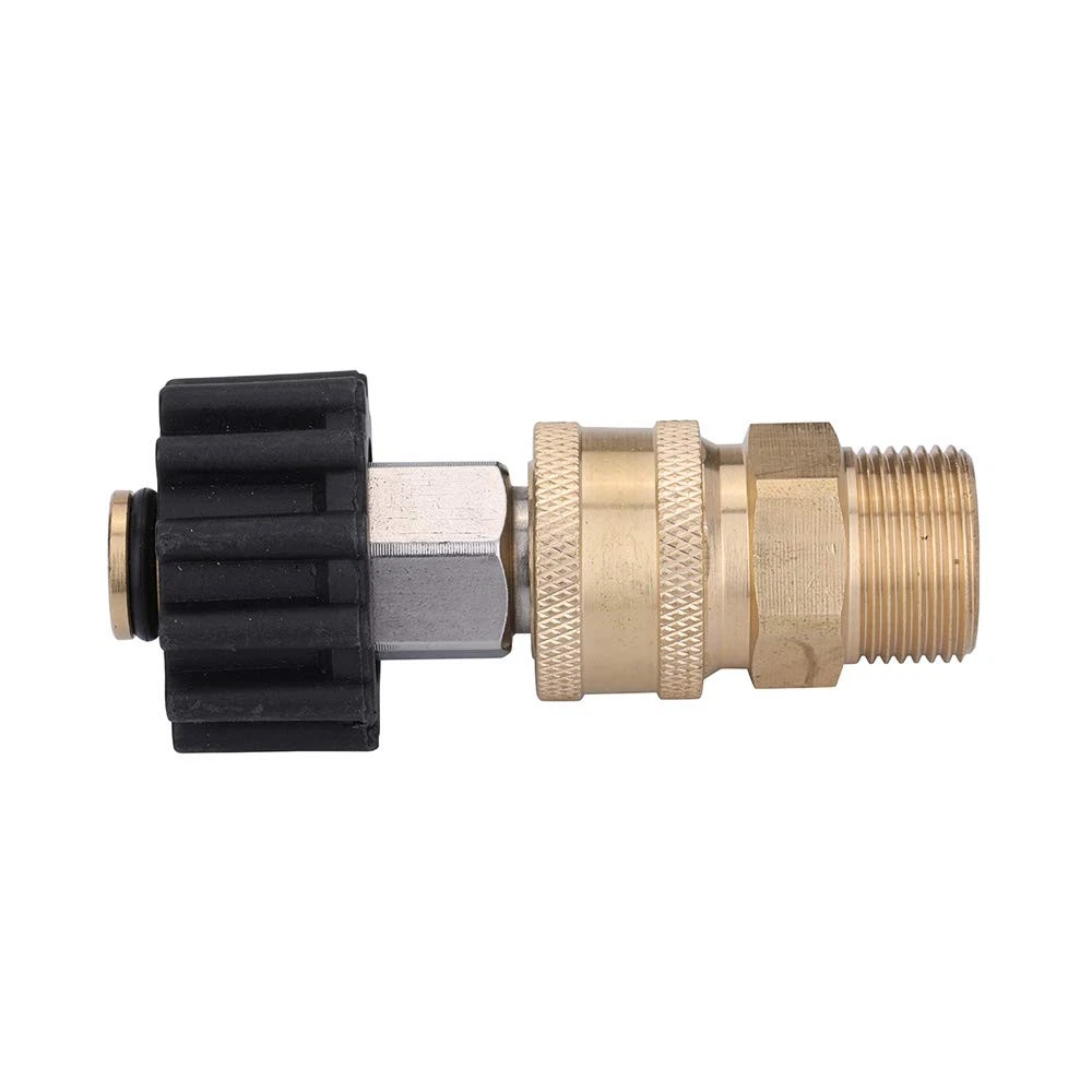 Pressure Washer Adapter SELL 15mm FITTING, NOT 14mm. It fits pressure washer of Sun Joe, Campbell, MI-T-M, AR Blue, Stanley, Cleanforce, Simoniz. If your fitting is 14mm, it may cause leakage. M22 15mm swivel + 3/8” plug, 3/8” quick disconnect + M22 15mm male. Convert the M22 thread-on couplings to a 3/8 inch quick connector. Apply on universal , hose and pump connection. Easy to connect and disconnect. Working Pressure is up to 5,000 PSI. Provides secure and quick fittings, simple to assemble and disassemble