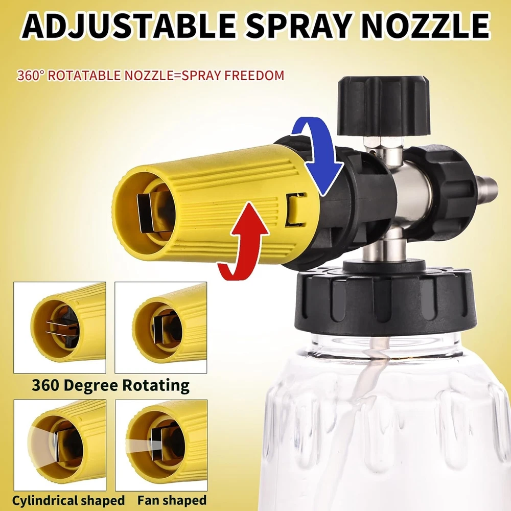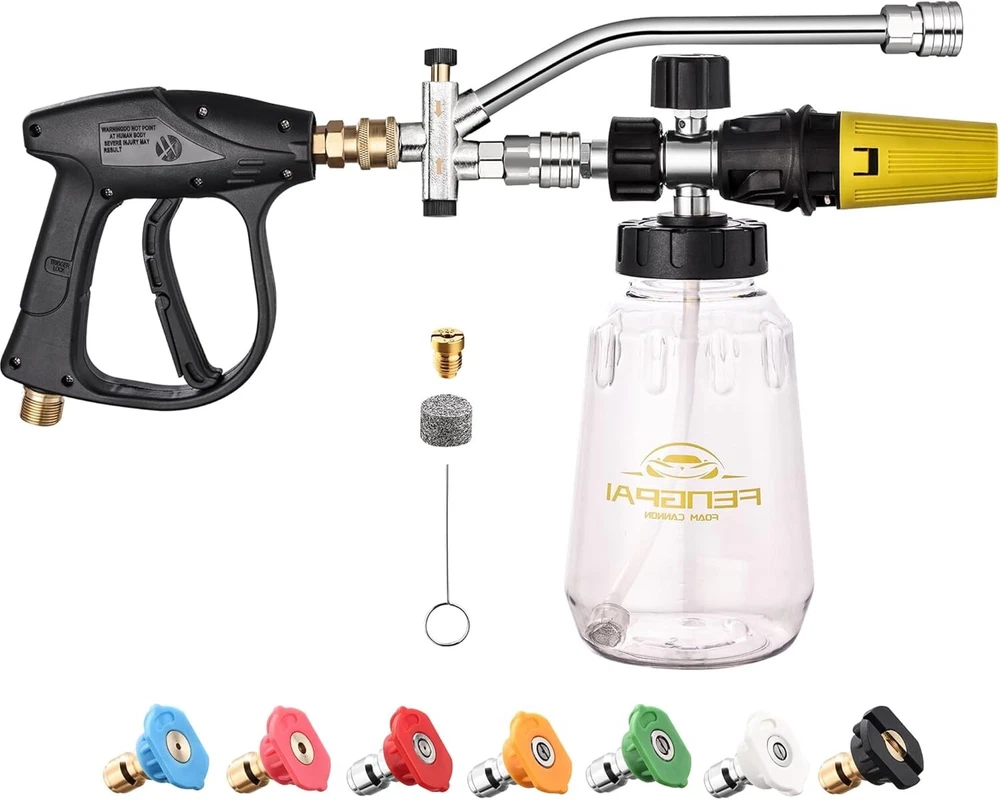 Pressure Washer Foam Cannon Gun Kit with Dual Connector Accessory, Car Wash Foam Gun for Car Washing and Cleaning, 1/4" Quick Connect with 7pcs Nozzles, Dual Adjustable Snow Foam Lance Dual Connector Foam Cannon: Our pressure washer foam cannon features a unique design with two different connector ends - a longer one for the power washer nozzle to water washing and a shorter one for the snow foam cannon to foam washing. This design simplifies the use process, easily switch between water and foam modes, improves efficiency Snow Foam Cannon with Short Gun: 1 Liter / gallon snow foam cannon with a detachable 1/4'' quick connector and a pressure washer short gun, you can choice the connector according to your pressure washer gun. Turn the top knob right (-) and the top knob left (+) to adjust to the desired foam level, adjust nozzle to control the spray area and horizontal/vertical 7 Spray Nozzles: Each nozzle orifice size is , different nozzles have different spray angle (0, 15, 25, 40, 65 degree, Risen and Soap). According to your cleaning purpose, choose different nozzle, washing car, garden, roof or more, universal 1/4’’quick connector. Tips: Please make sure that the nozzle is clean; If there is no enough water, release the gas after you add water, it will not work normally Widely Use: Constructed from premium-grade materials, our power washer foam cannon connector promises exceptional durability and reliability for prolonged use. Which is widely used for various cleaning applications, such as motorcycle, car, roofs, driveways, floors, windows washing. And more helpful for detailing Trucks or SUVs What You Get: Our snow foam cannon working pressure is 1000 psi to 3600 psi. Additional orifice nozzle is included for improved performance. Package contains a dual-purpose switch spray gun, a spray bottle for easy detergent mixing, a pressure washer gun for precise control, and 7 power washer sprayer nozzles